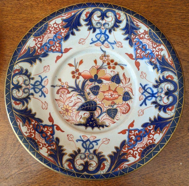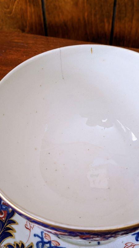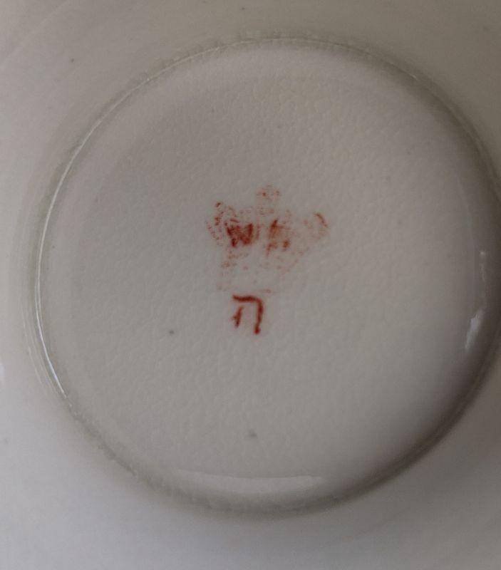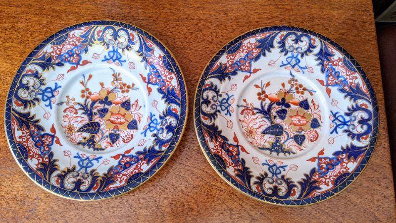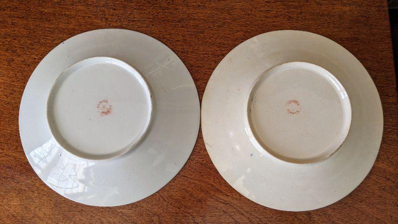 Handpainted. Item with cobalt blue rim (left) does have hairline crack approx. 1" long. See photos. Otherwise, In very good condition for their age. Some wear to gilding. No other chips.