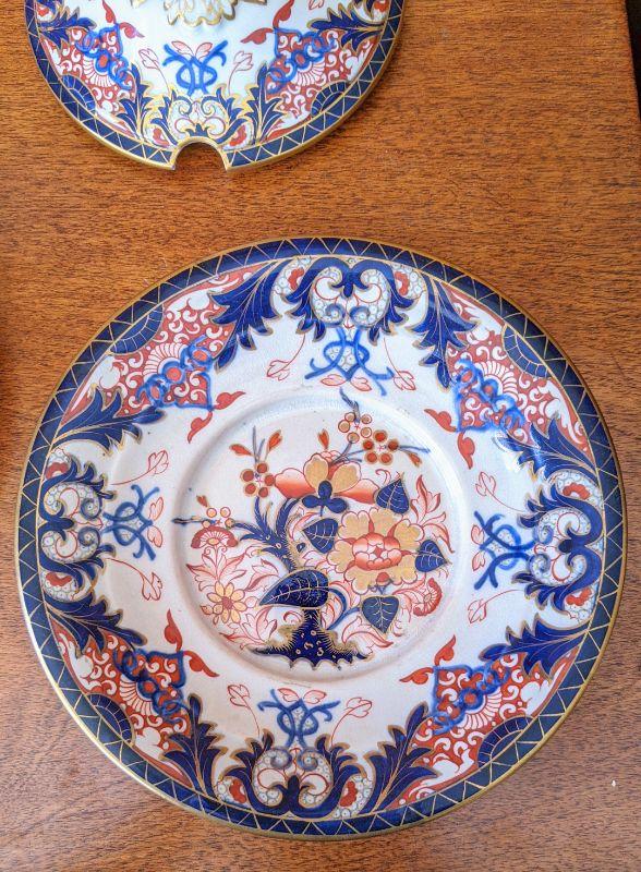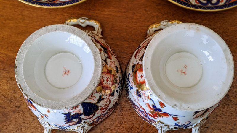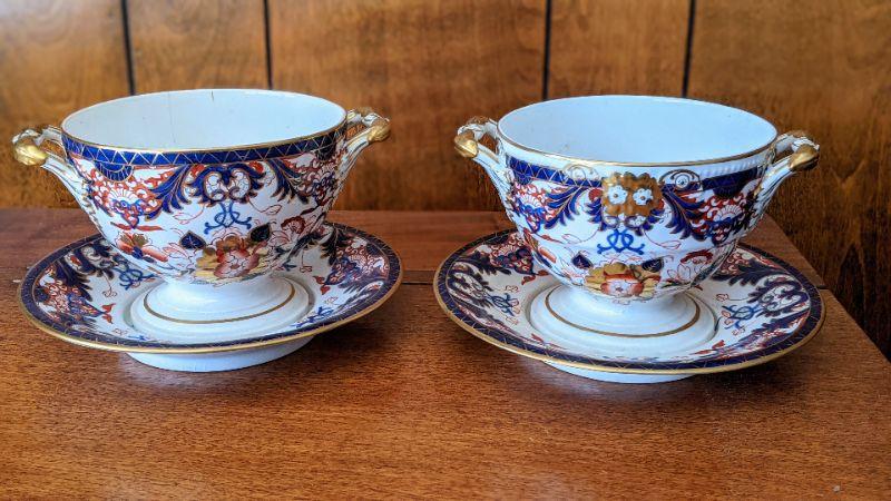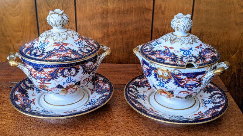 2 Antique Royal Crown Derby Bloor Imari / Kings Pattern Covered Sauce Tureens Lids Underplates 1825-1848