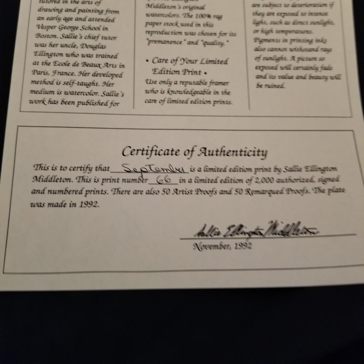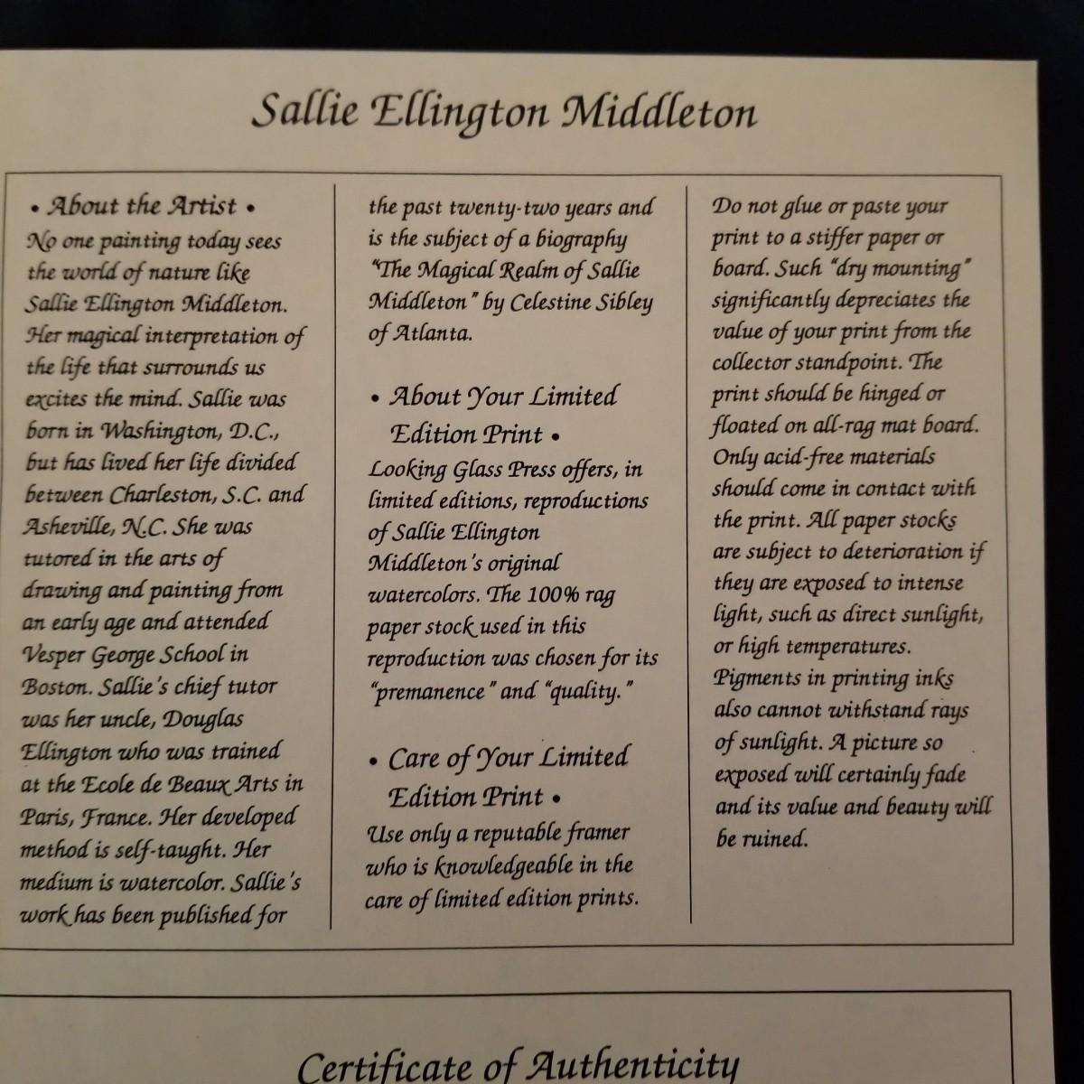 A pair of pencil signed and numbered prints by artist Sallie Ellington Middleton. Prints are unframed in envelopes, with certificates. Each print measures 11.75" square. See photos for details. Shipping available.