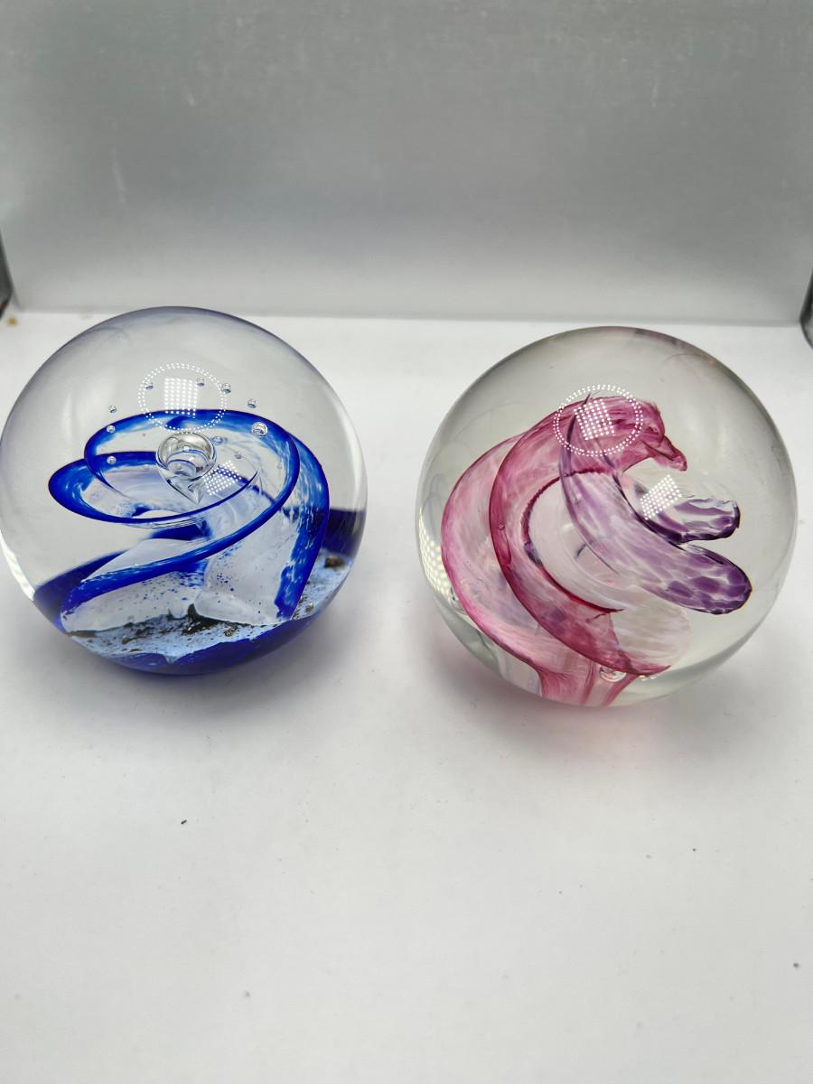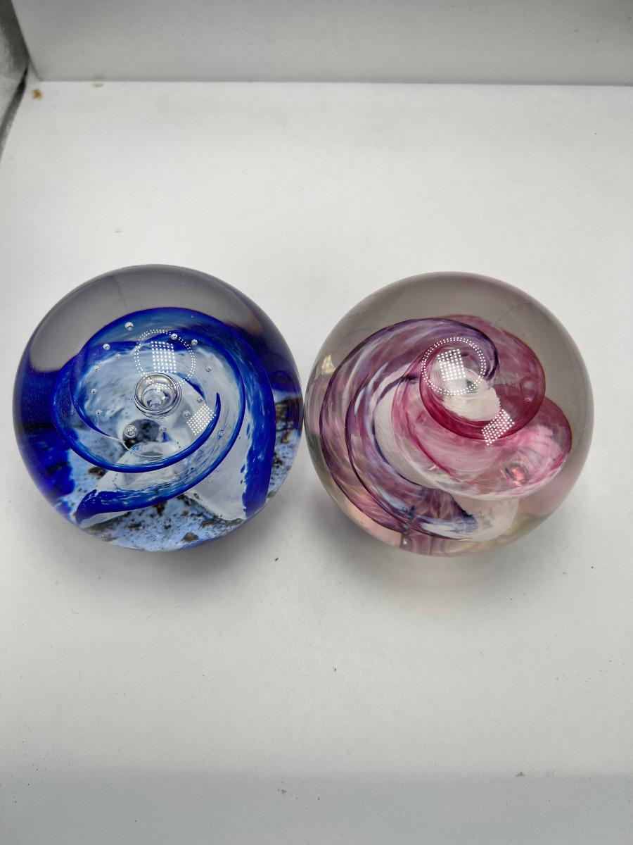 Pink and Blue no flaws 2 Scotland Selkirk Glass signed marbled paperweights.