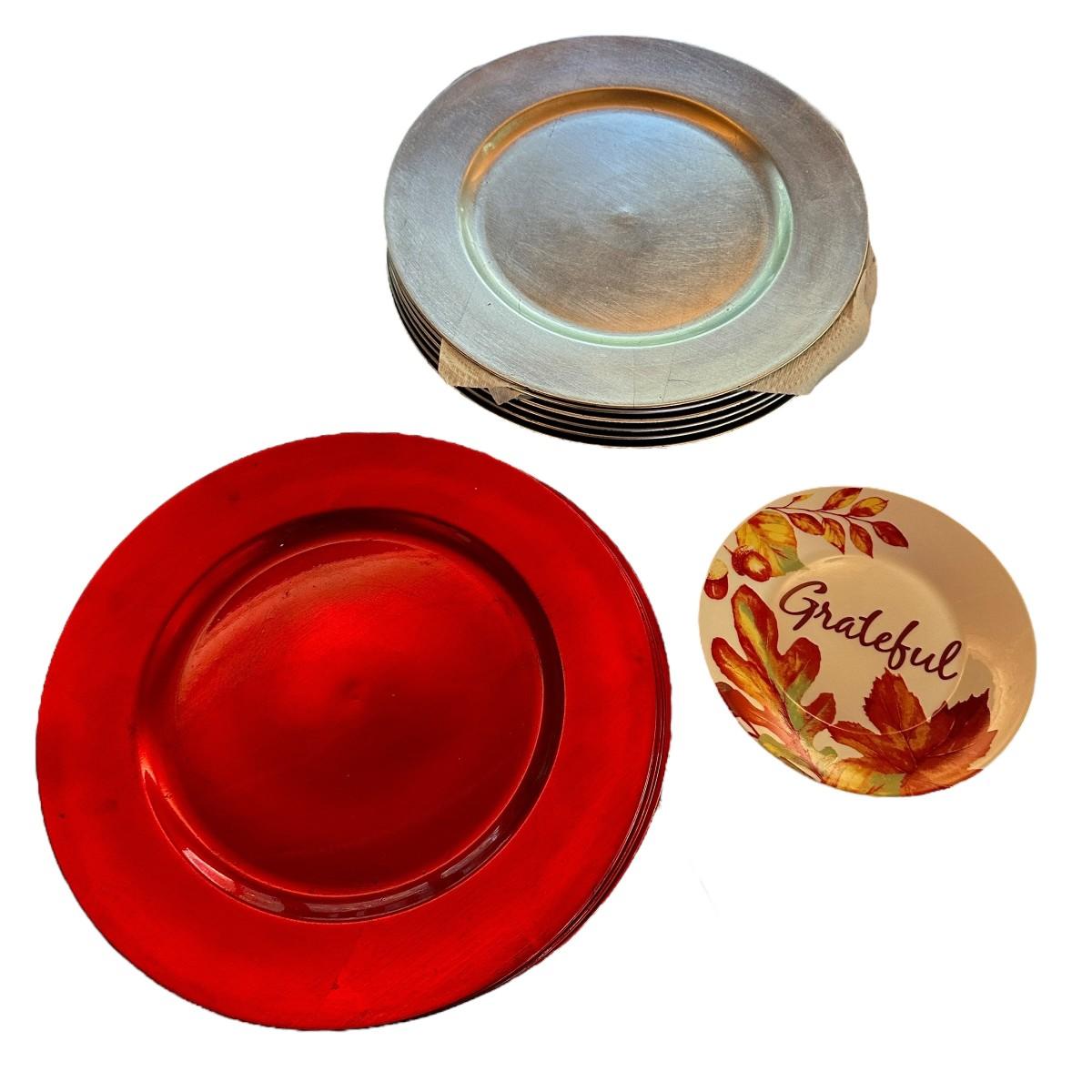 2 Sets of Charger Plates (Red and Silver- 6 of each) + 2 Small Grateful Plates