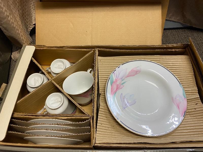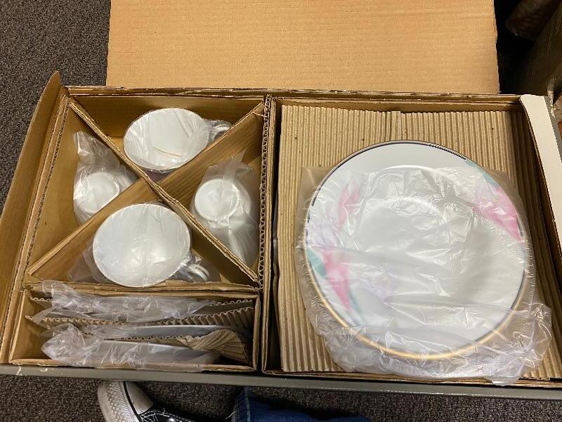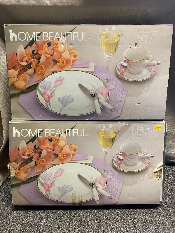 2 complete sets of Home Beautiful china dishware in "Sharon" pattern. Pink and purple floral pattern. 20 piece sets. Total makes it a service for 8. Boxes are a little worn/damaged from years of storage. Dishes inside are new, one set still in plastic. Includes dinner plate, salad plate, bowl, cup, and saucer. Pick up in Brea.