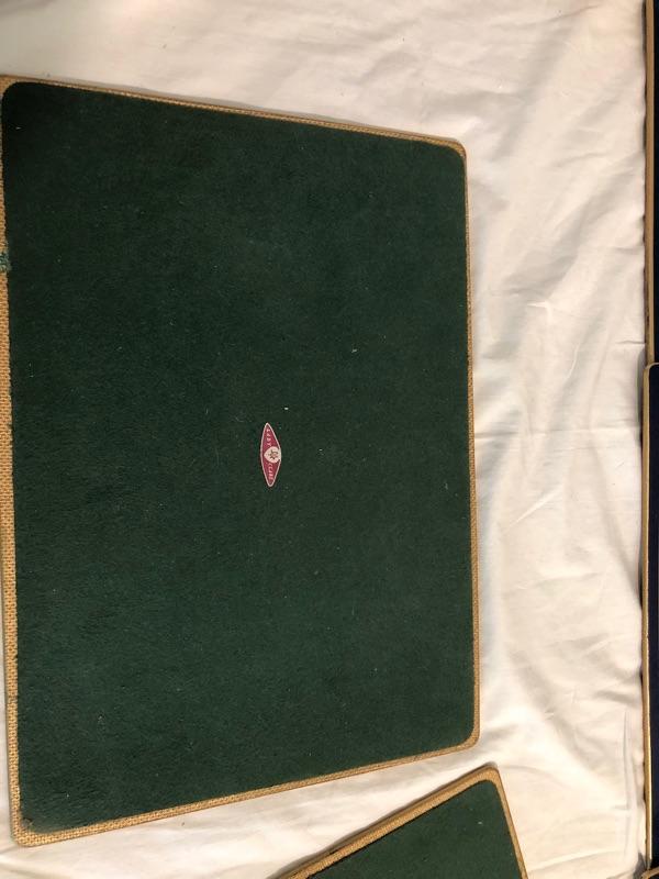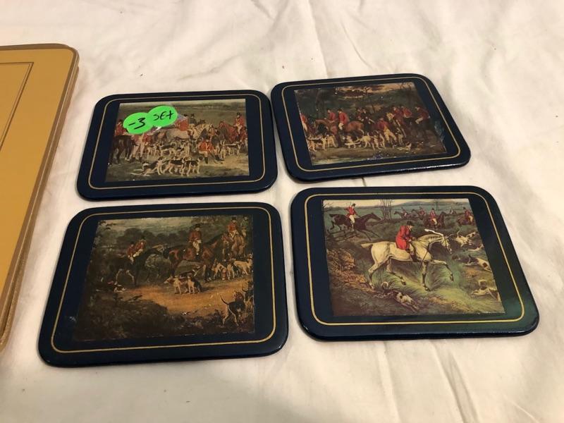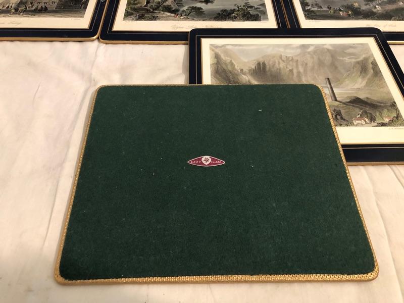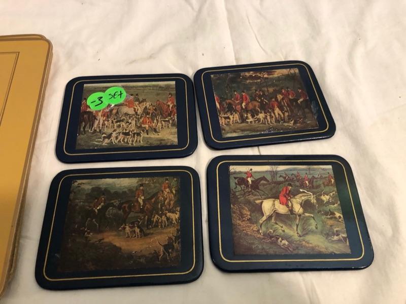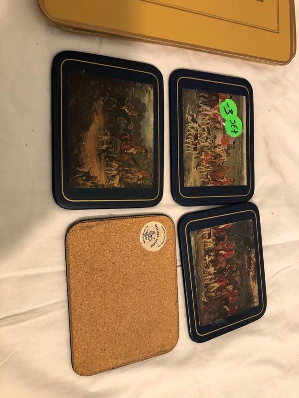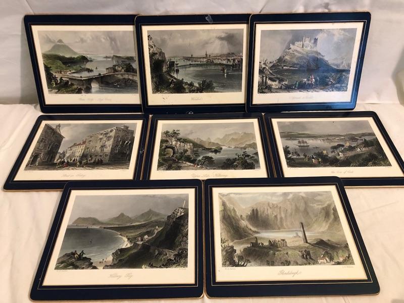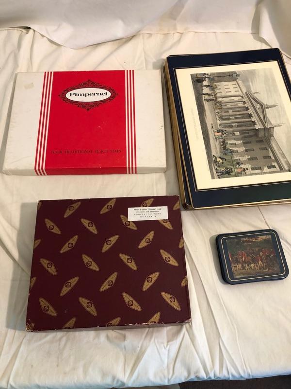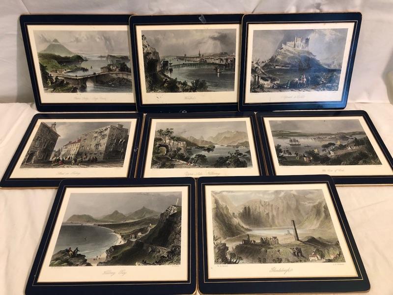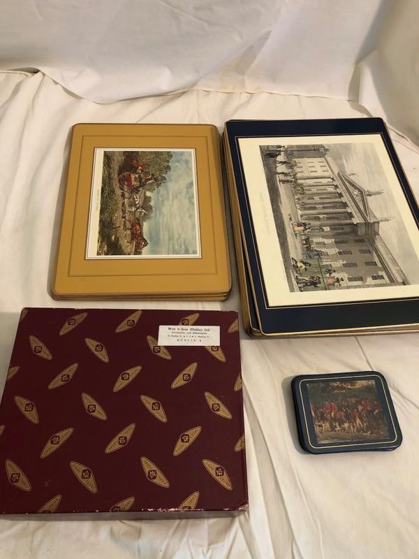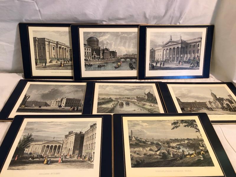 1 set of 9 14in x 10in placemats with scenes of turn of the century Dublin. 1 set of 8 8in x 9.5in placemats with scenes from Irish cities and locations. The tan cork back are 12x9 Felt-backed, melamine mats with ingraving picture images from turn of the century Dublin Ireland with Navy boarders. 1 set of smaller placemats have scene from the Irish countryside and various cities in Ireland. 1 Set has tan borders and cork backs with scenes from the turn of the century. 4 coasters are all classic images of the English hunt. Lady Clare, Dublin