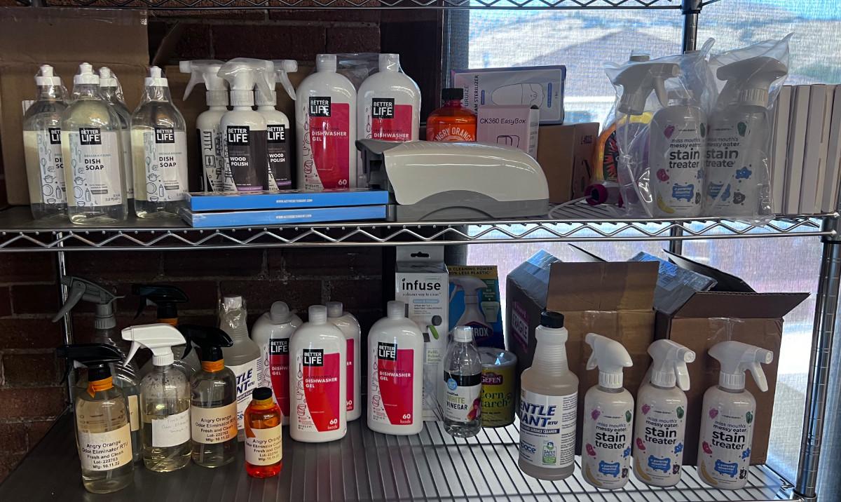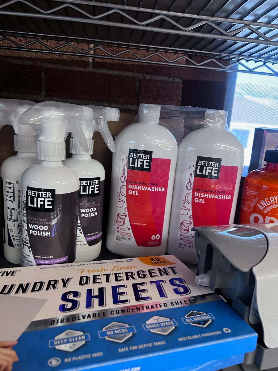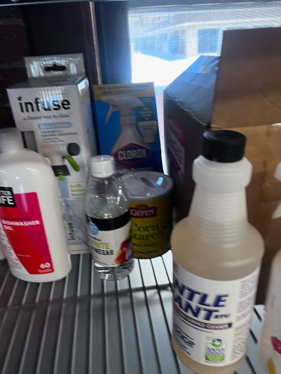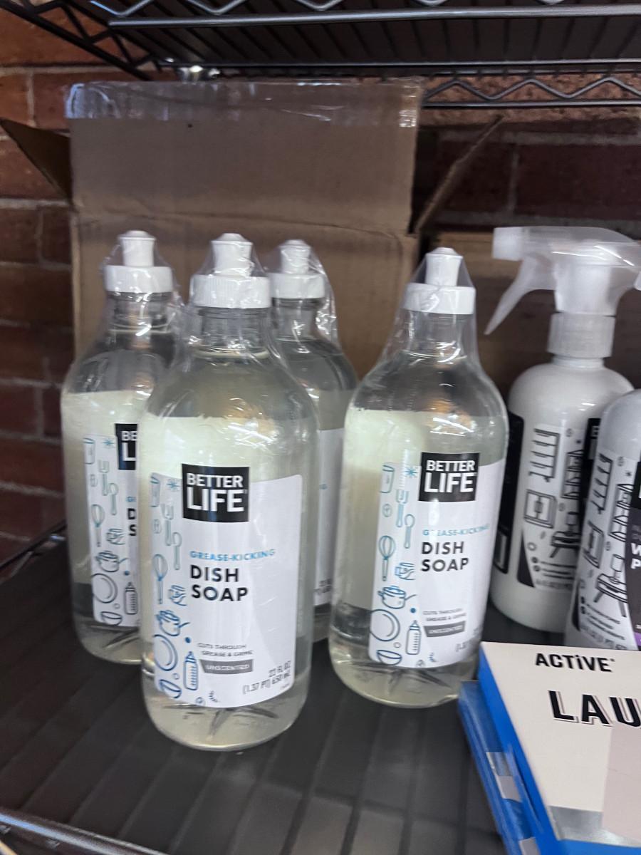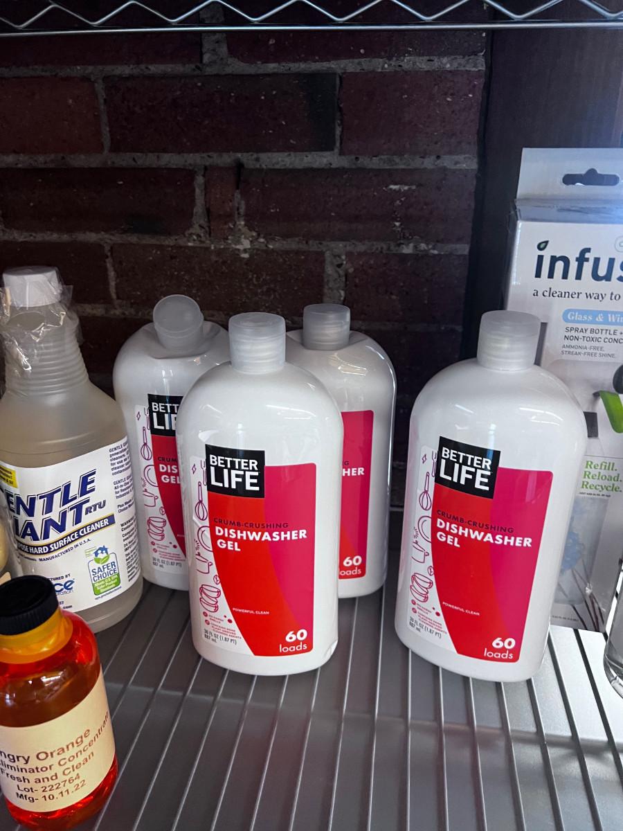 2 Shelves of Cleaning Products lots of Dish soap and Dish washer Gel