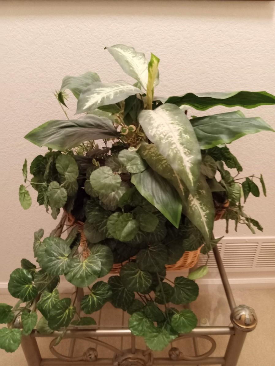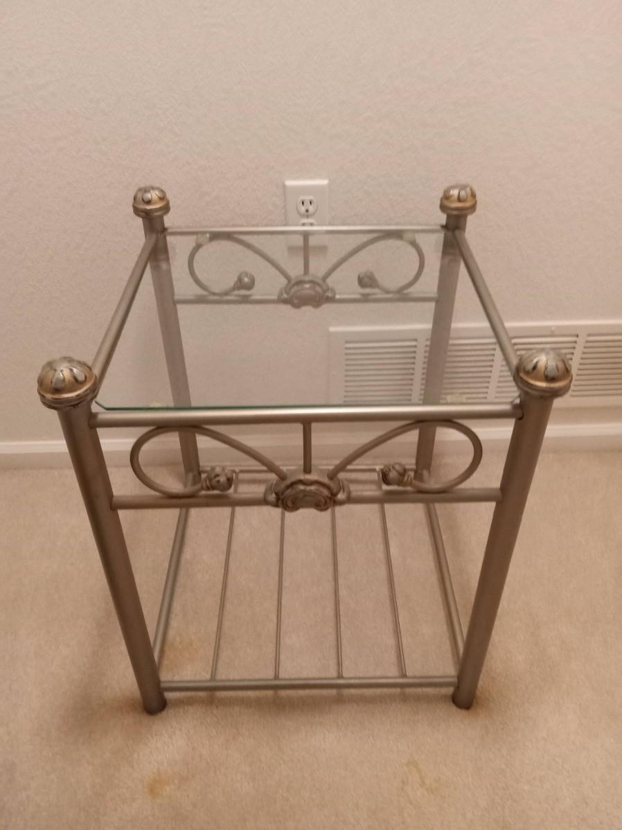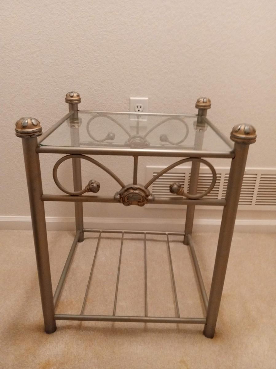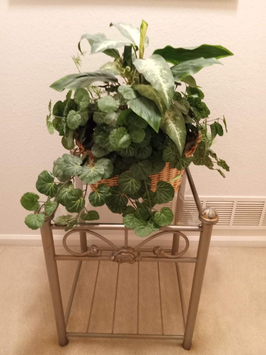THE IRON FRAMED GLASS TOP TABLE MEASURES 19" X 24" AND INCLUDES THE FAUX PLANT IN A BASKET