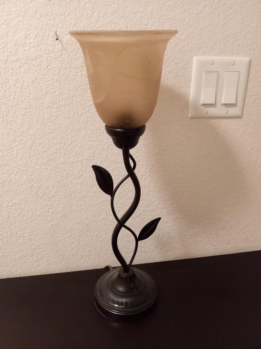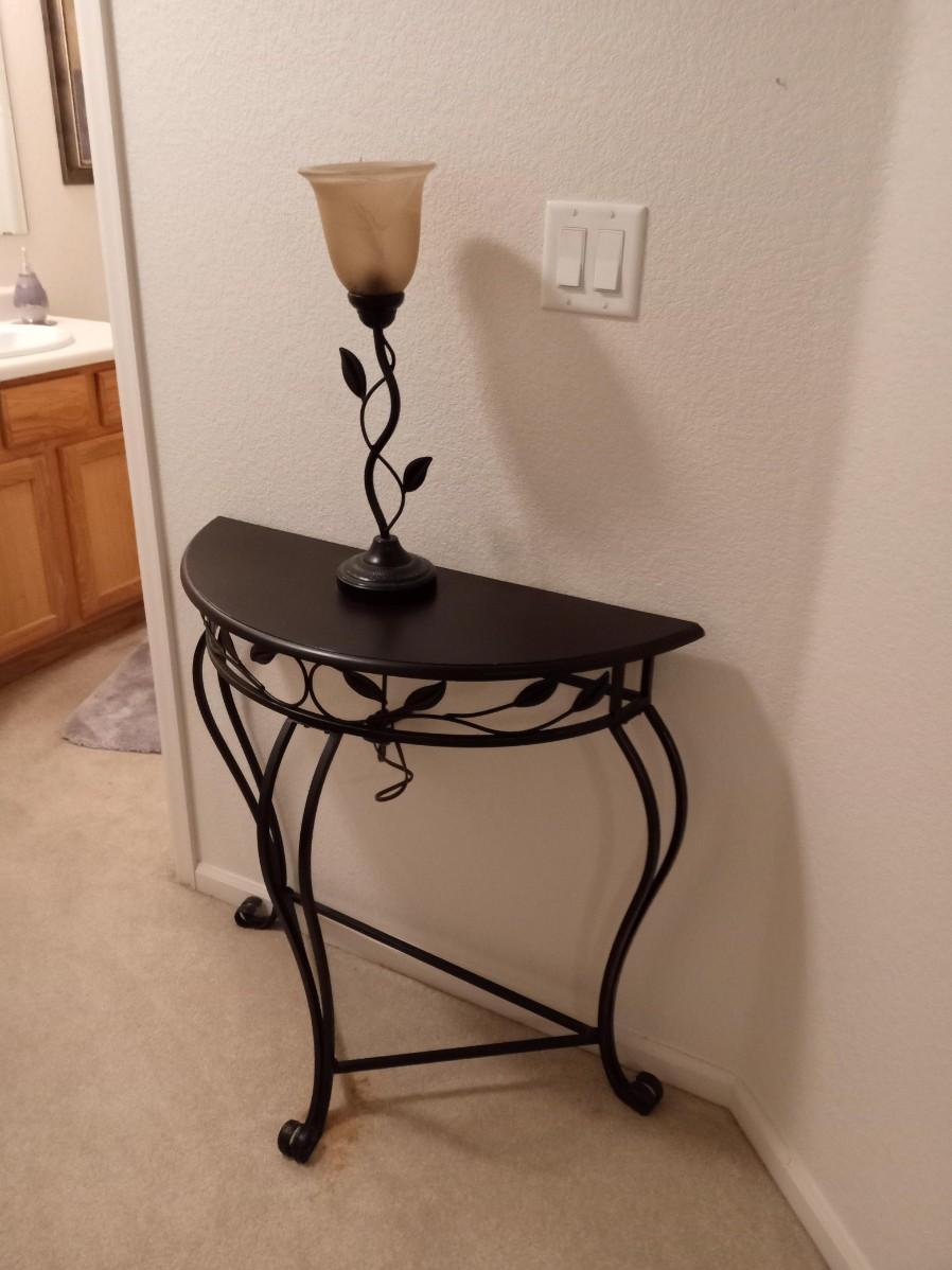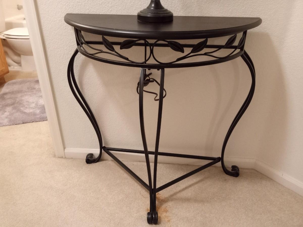 THE HALF CIRCLE TABLE INCLUDES THE FLOWER LAMP AND MEASURES 31" X 12" X 30"