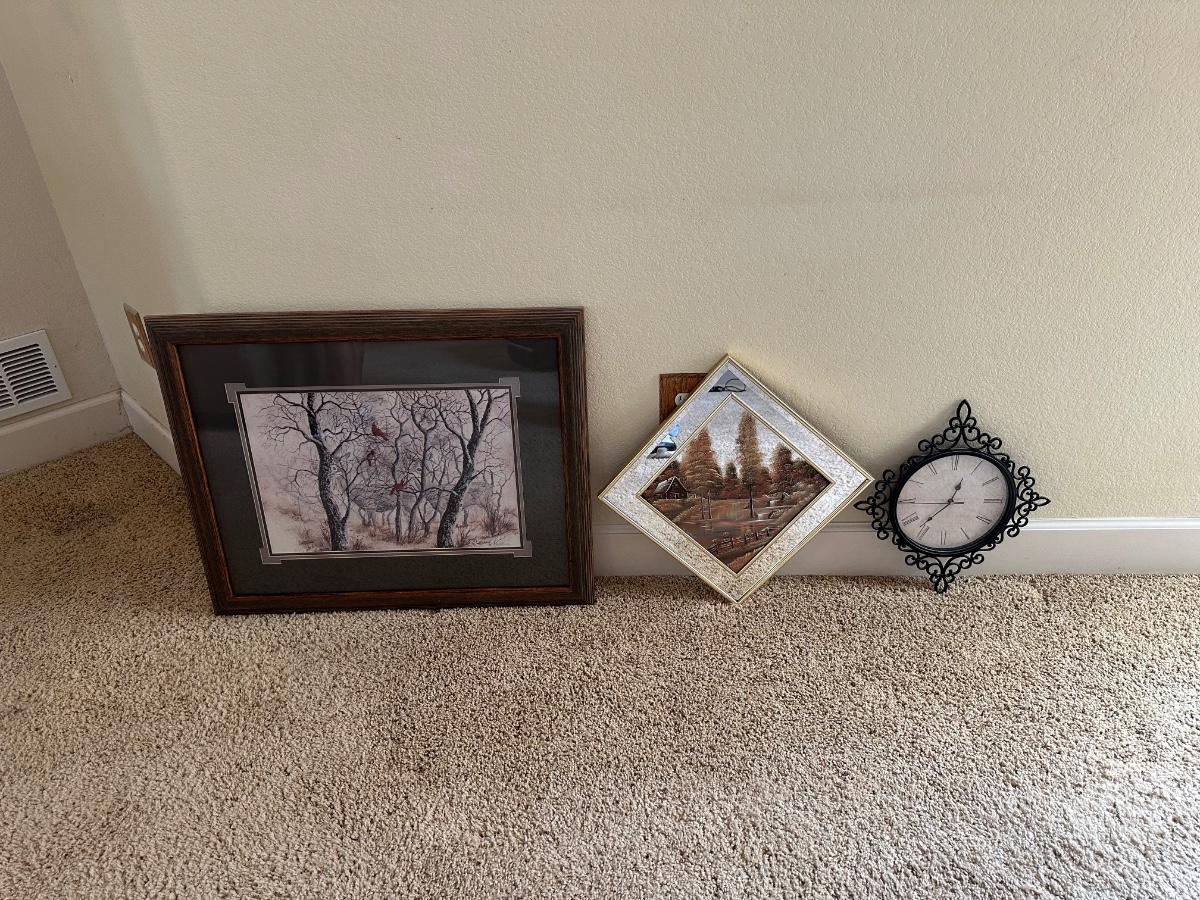 2 SIGNED PIECES OF ARTWORK AND A WALL CLOCK