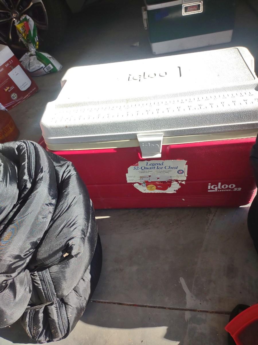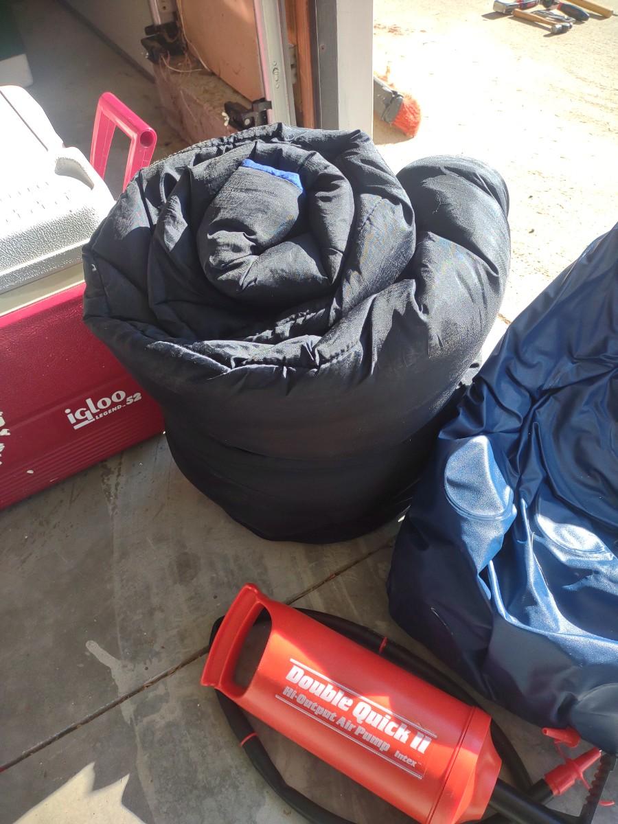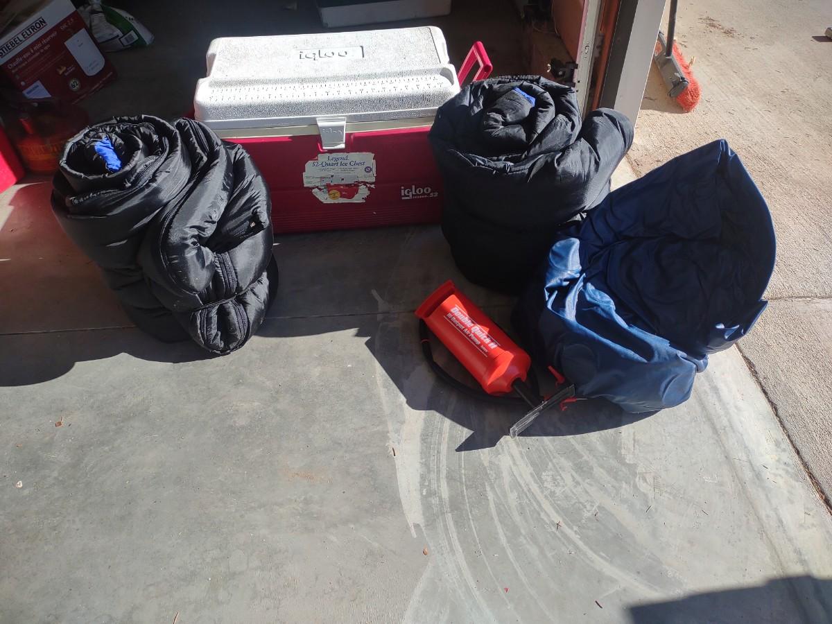 2 SLEEPING BAGS, AIR PUMP AND A COOLER