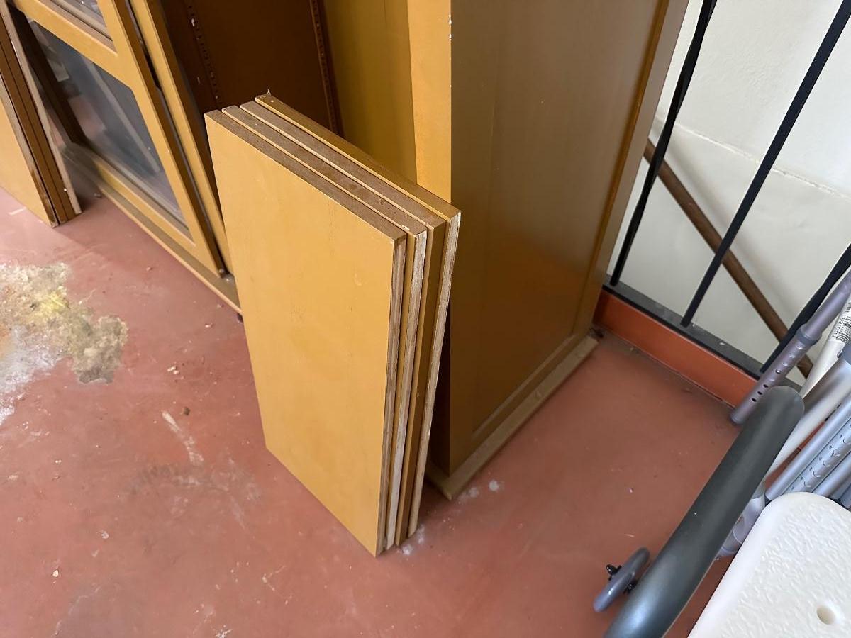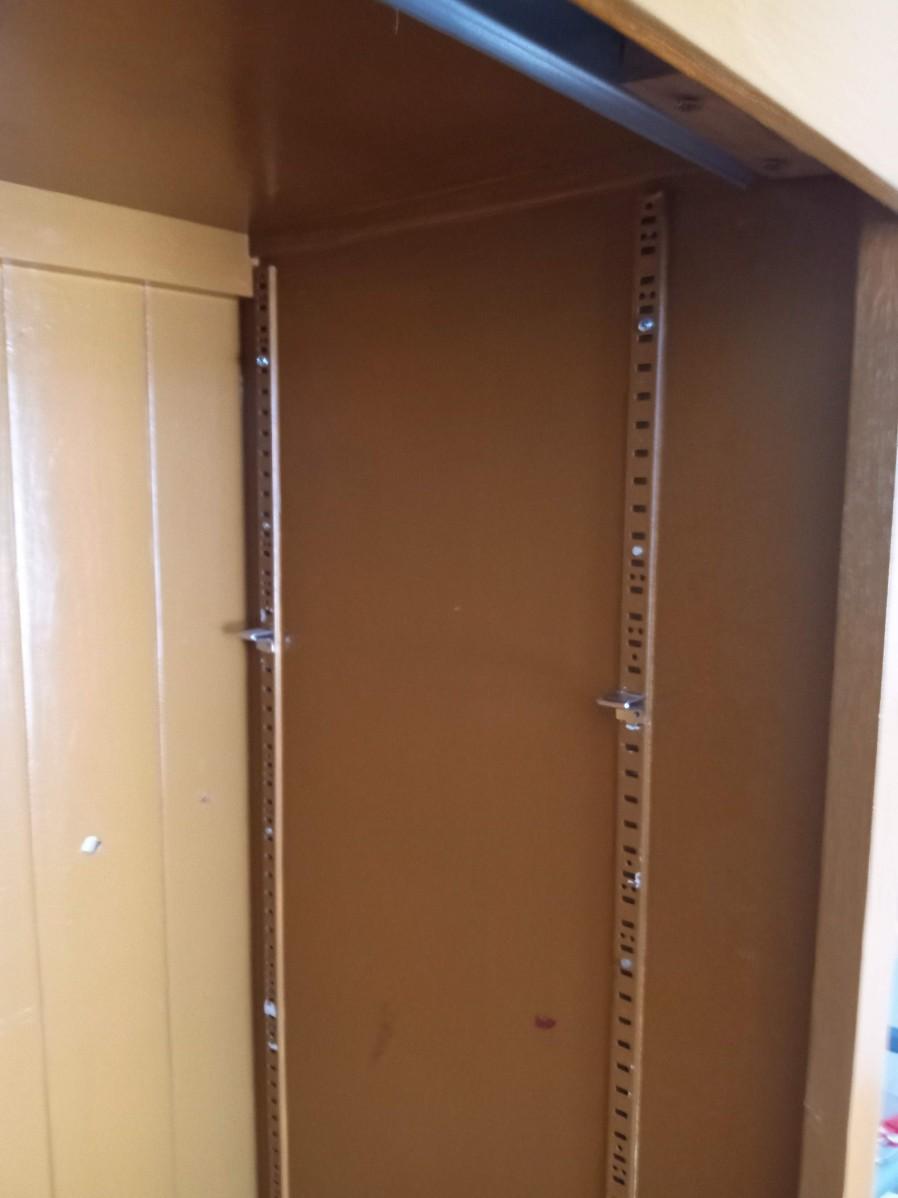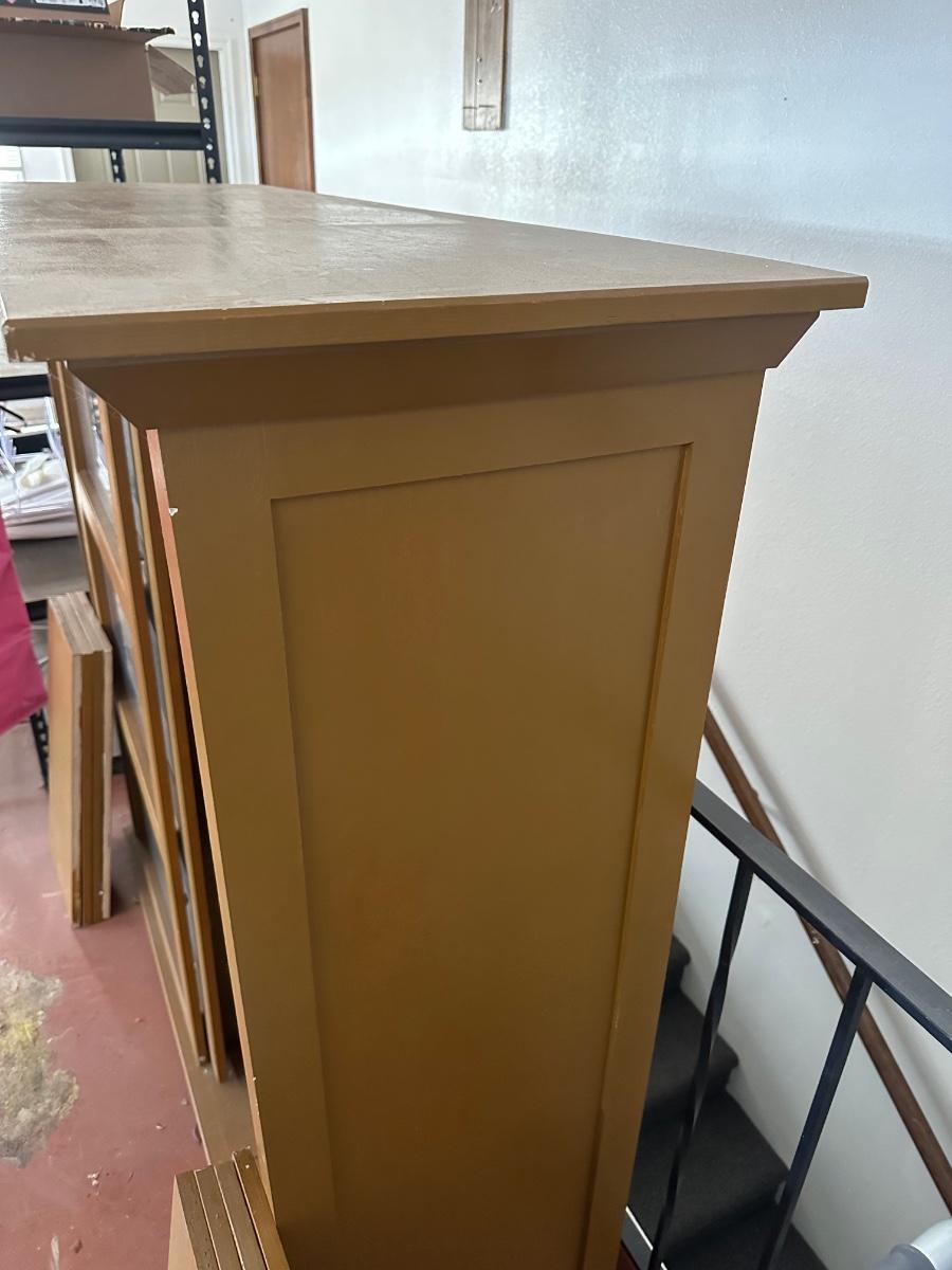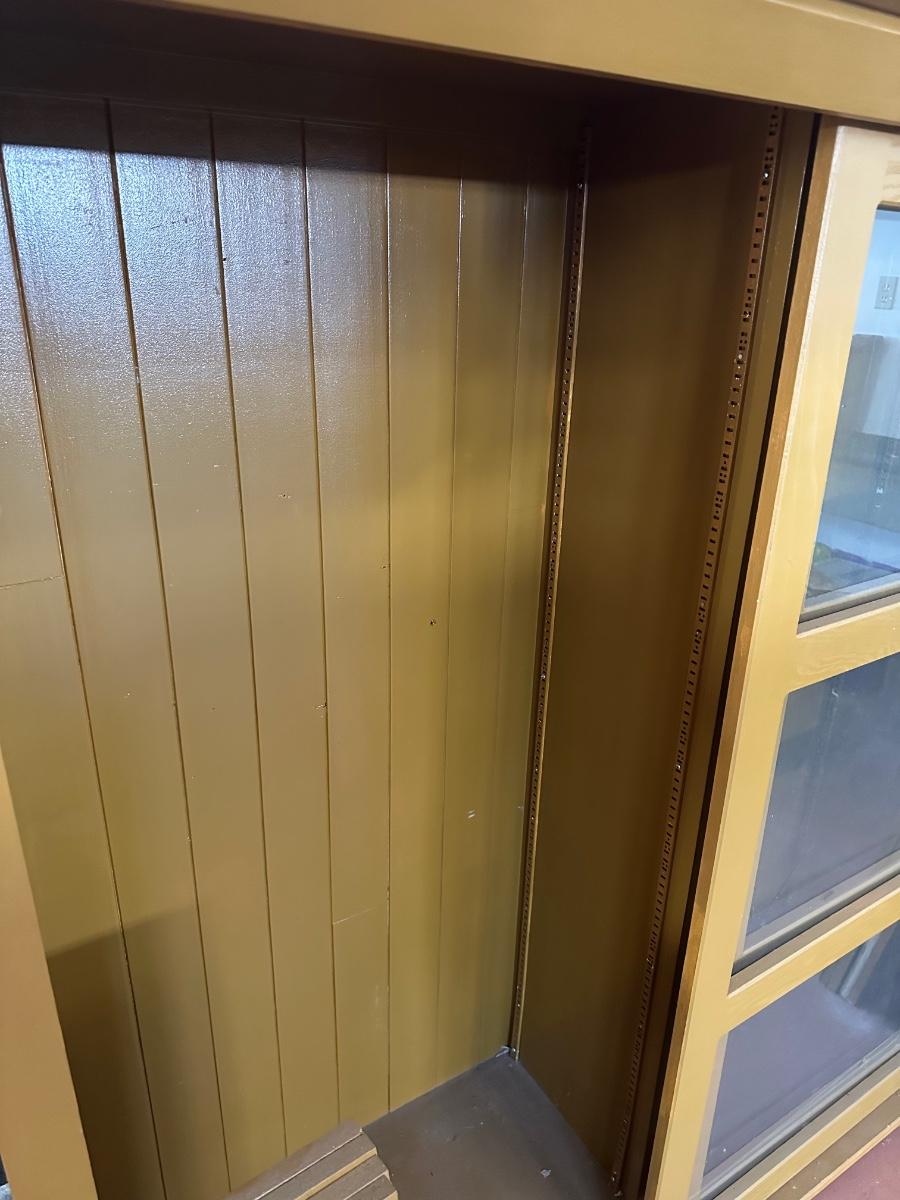 THE SHELVES ARE ADJUSTABLE, THIS CABINET IS IN REALLY GOOD SHAPE AND SOLID