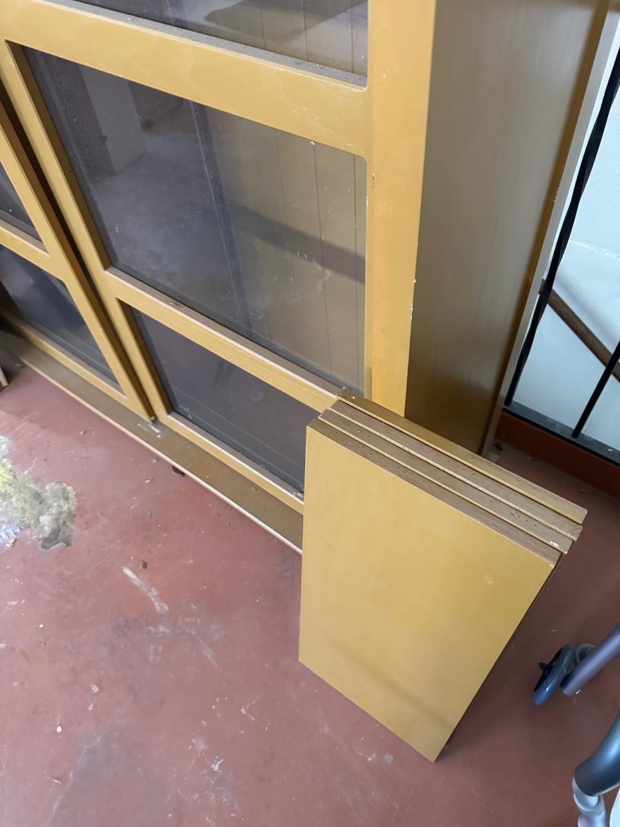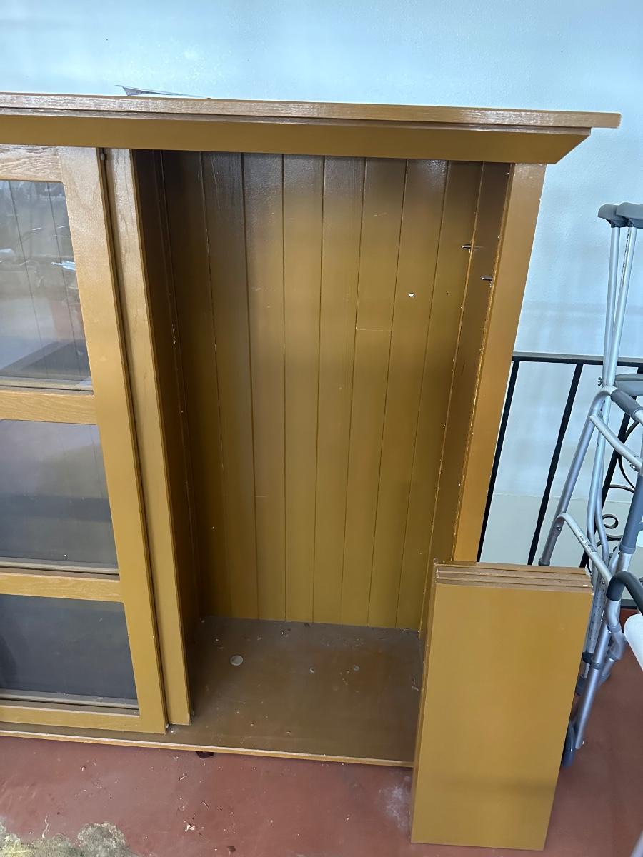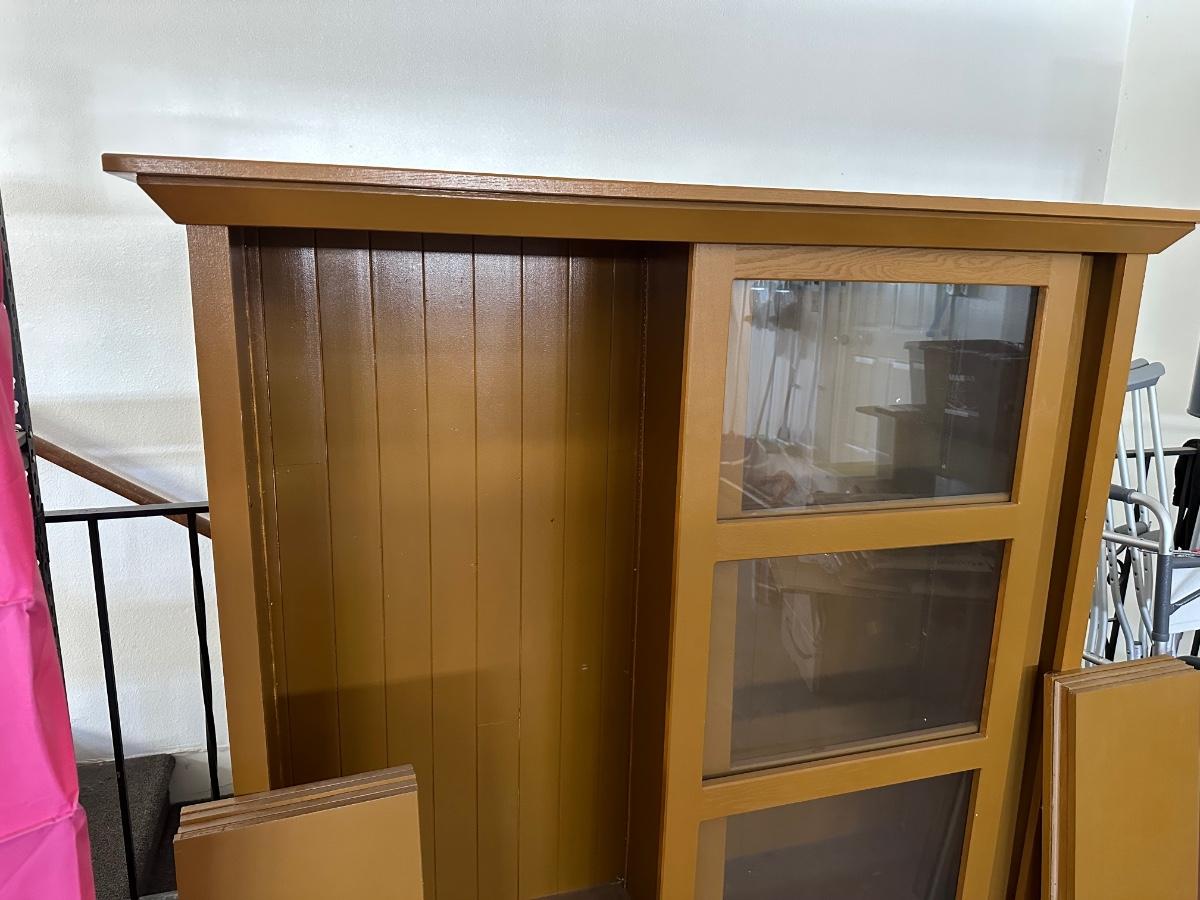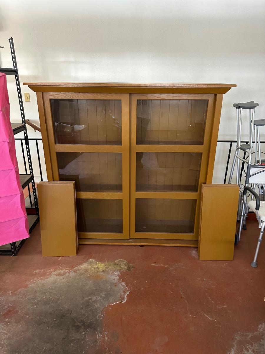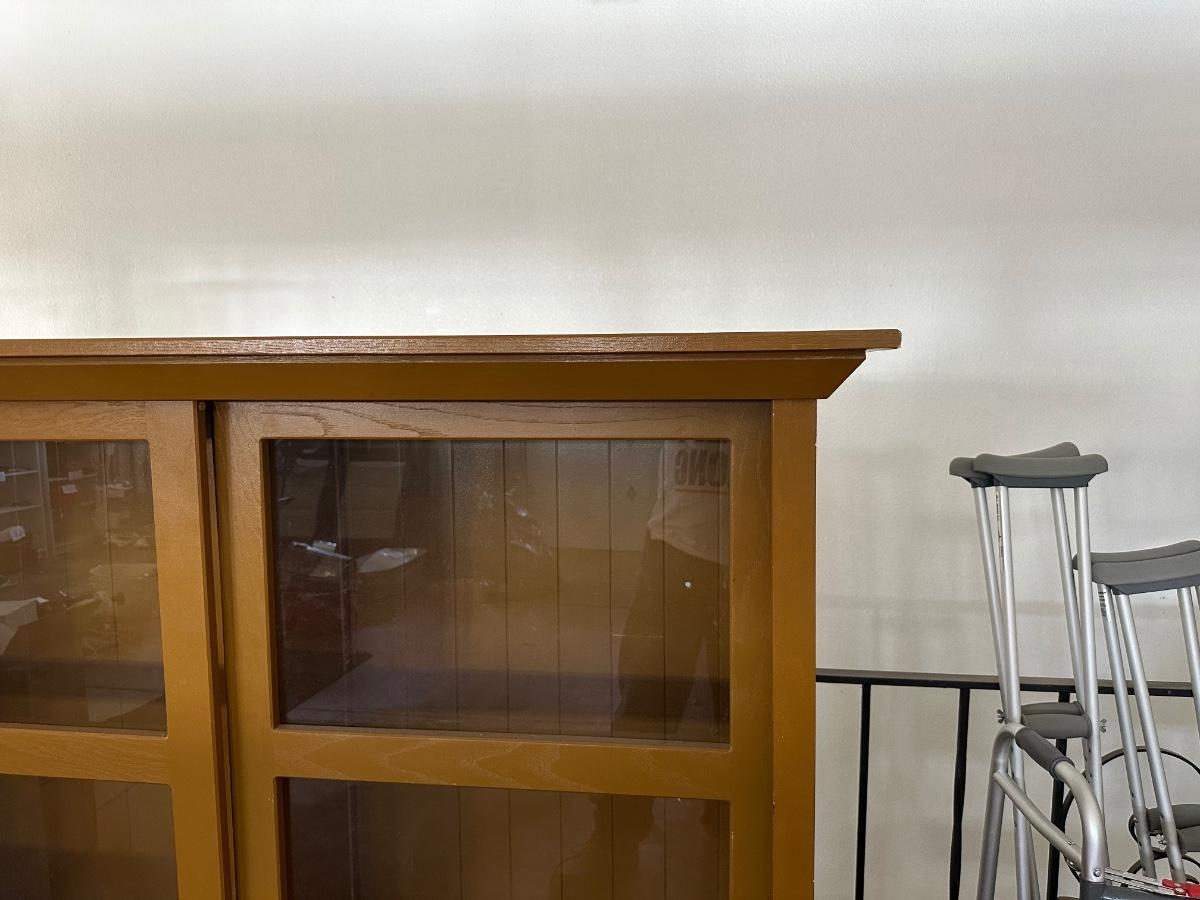2 SLIDING GLASS DOOR CABINET WITH 4 WOODEN SHELVES ON EACH SIDE