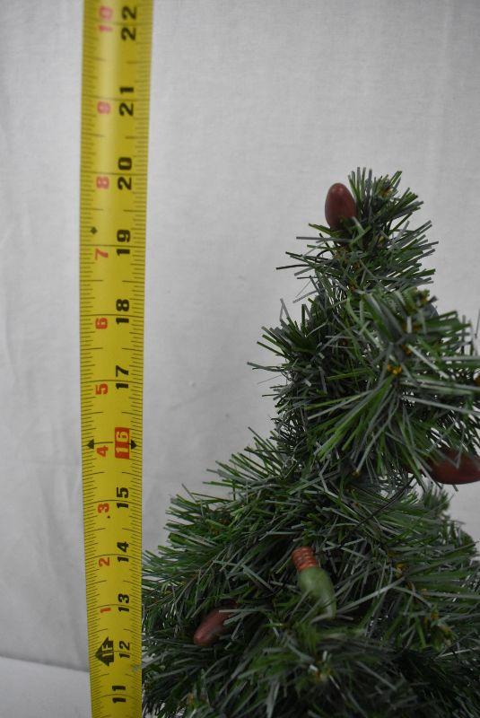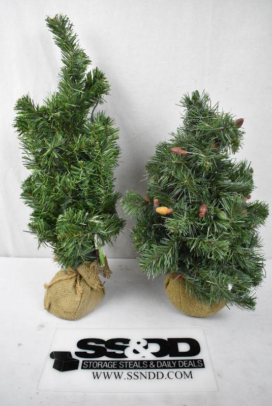 2 Small Artificial Trees w/ Burlap Bases. 1 w/ clear lights & 1 w/ wooden lights