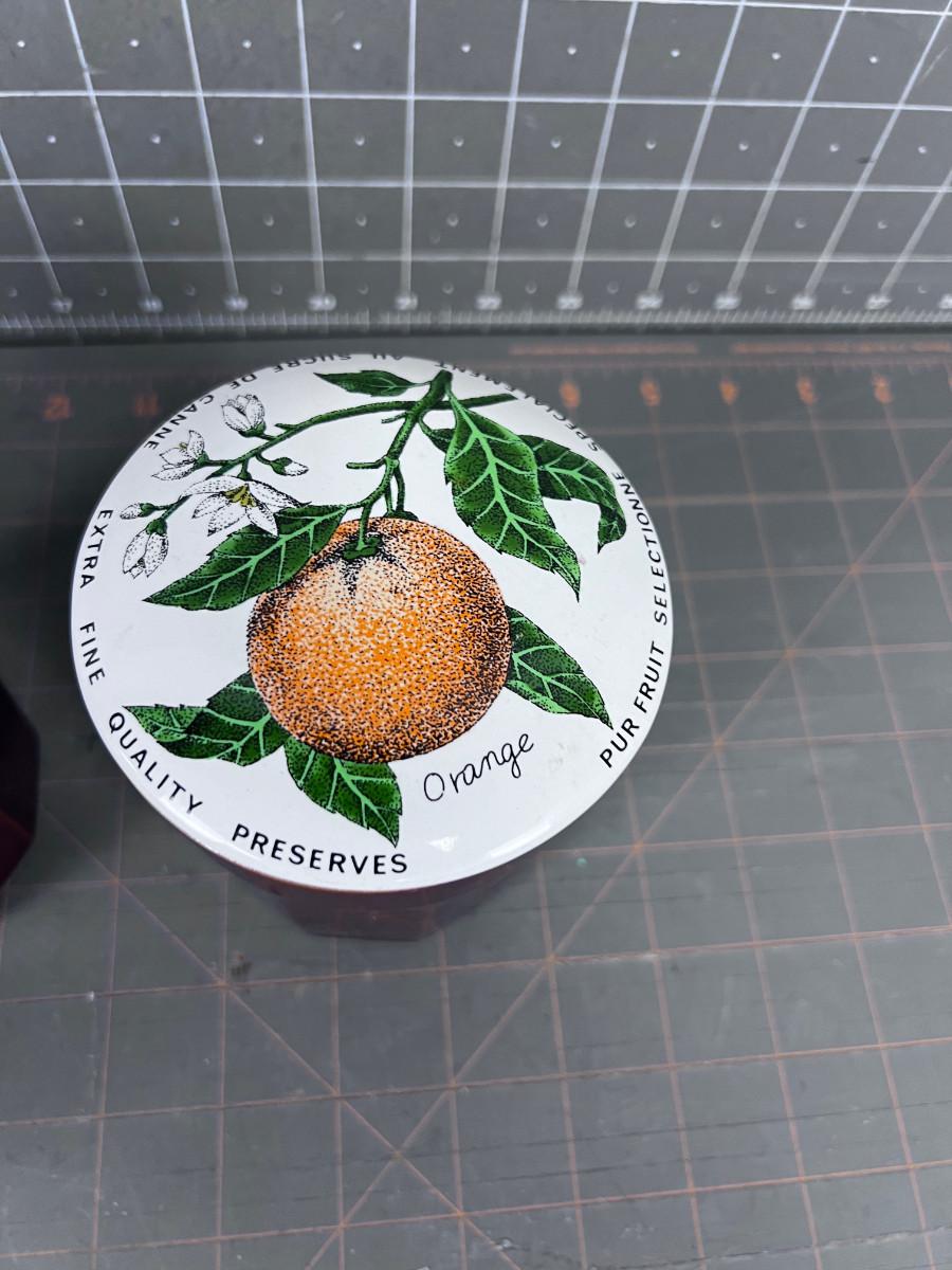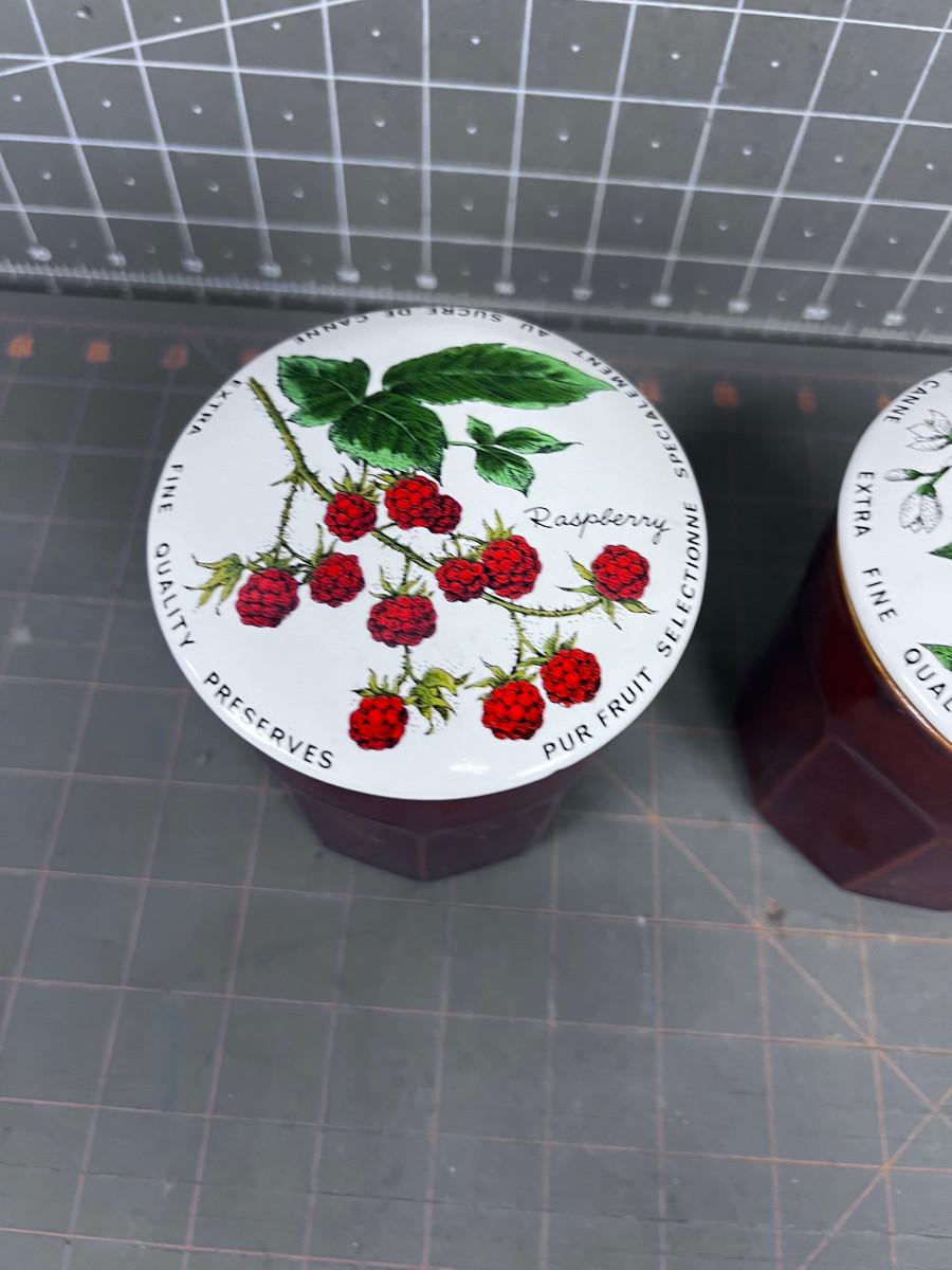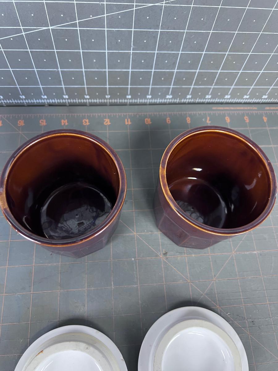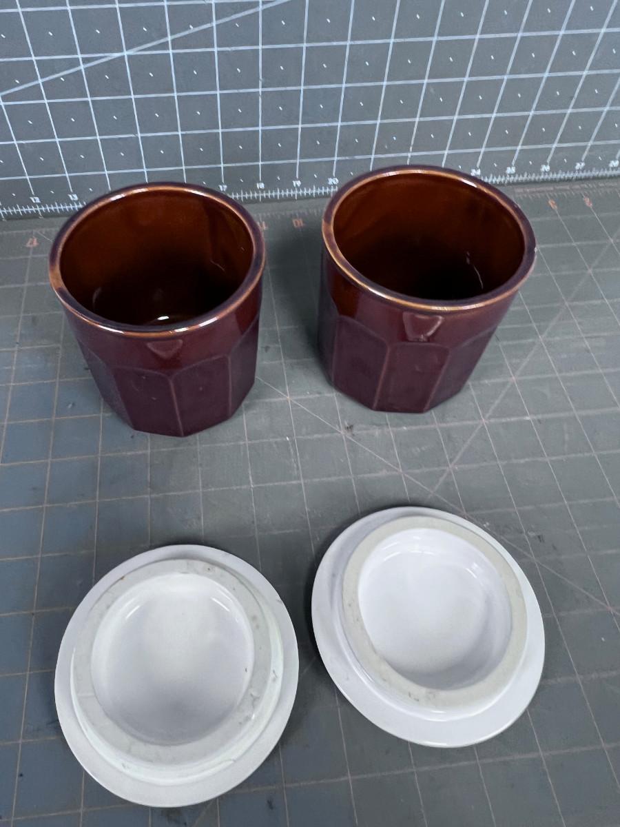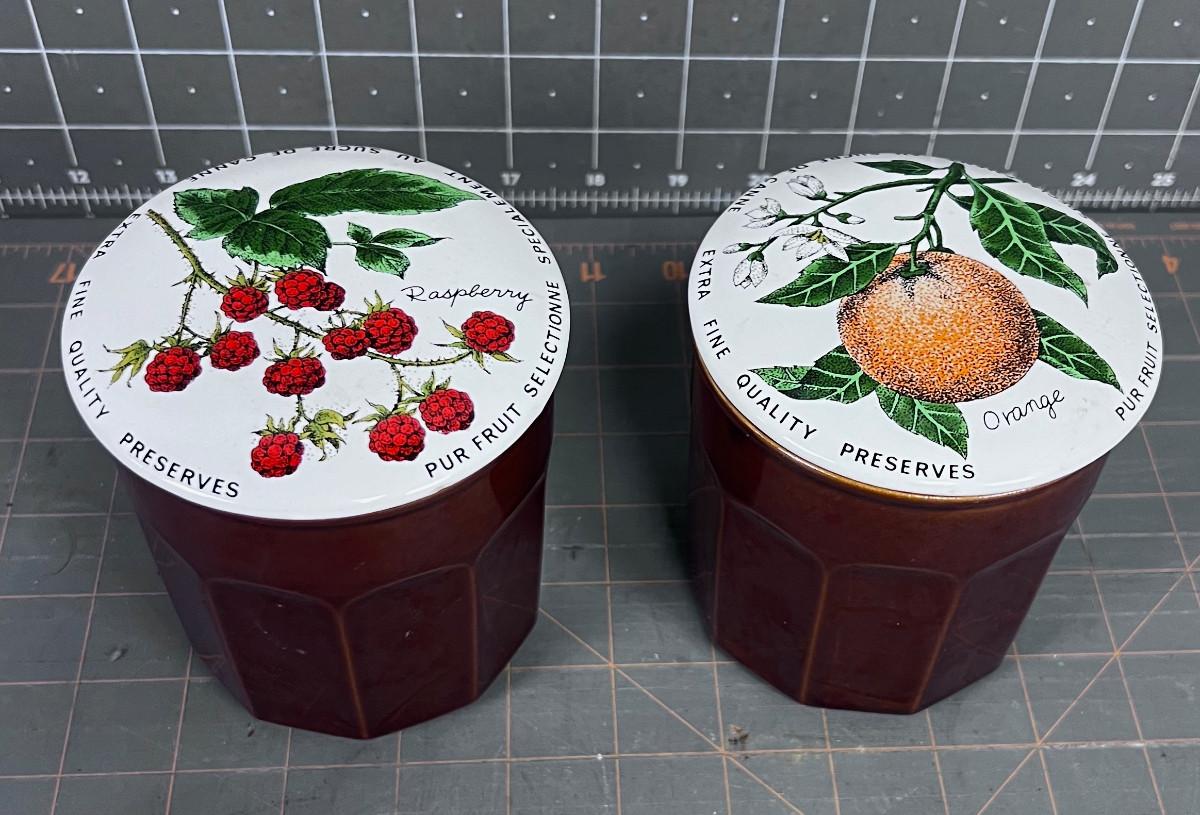 2 Small Crocks w/ Raspberry and Orange Ceramic Lids