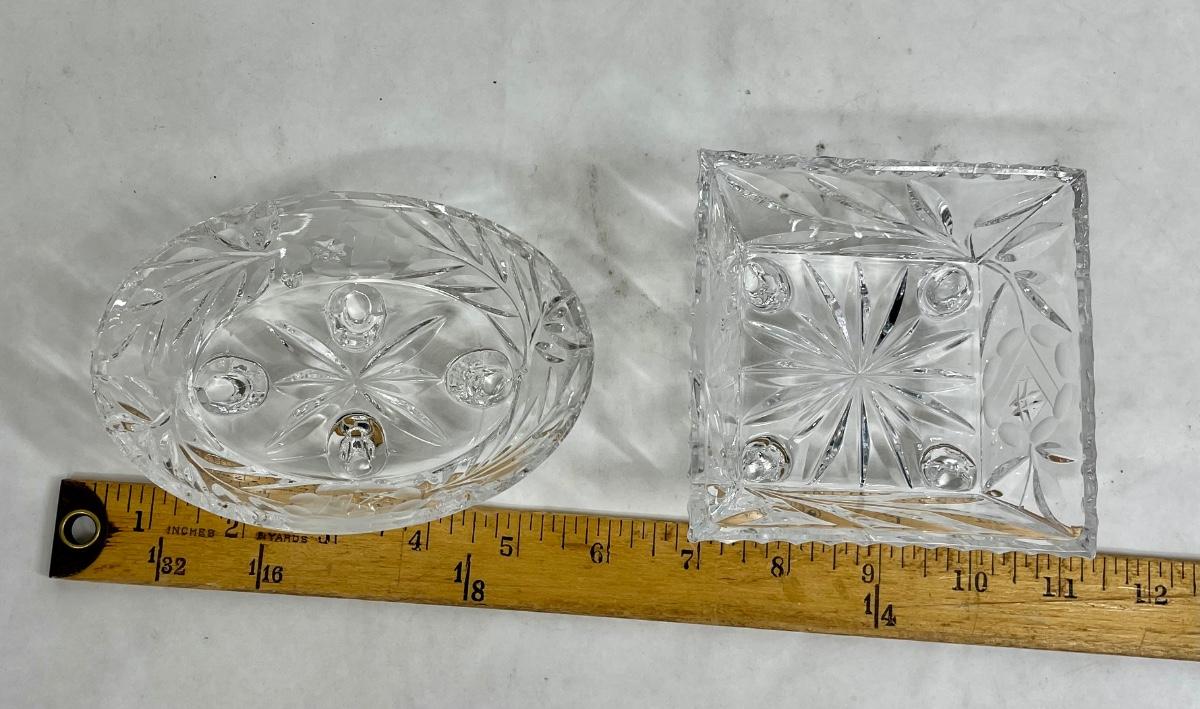 Square dish is approx. 4" x 4"; the oval dish is approx. 3" x 5". Both are in good condition.