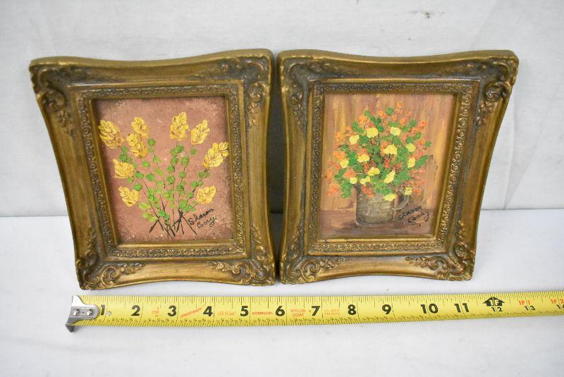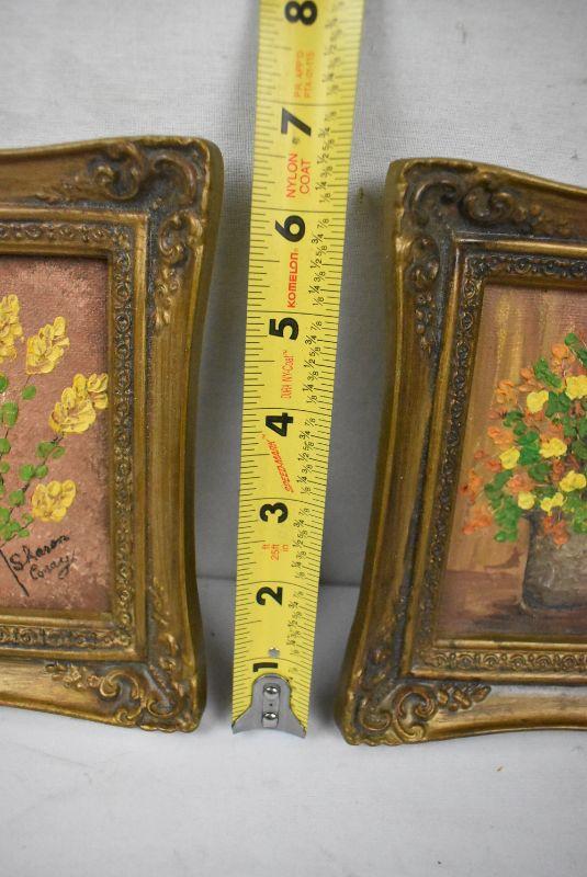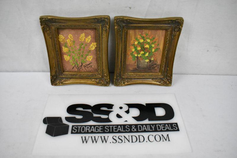 2 Small Framed Painted Images by Saron Coray. Local Artist from Murray Utah, 4"x5" in Plastic Frames. Vintage