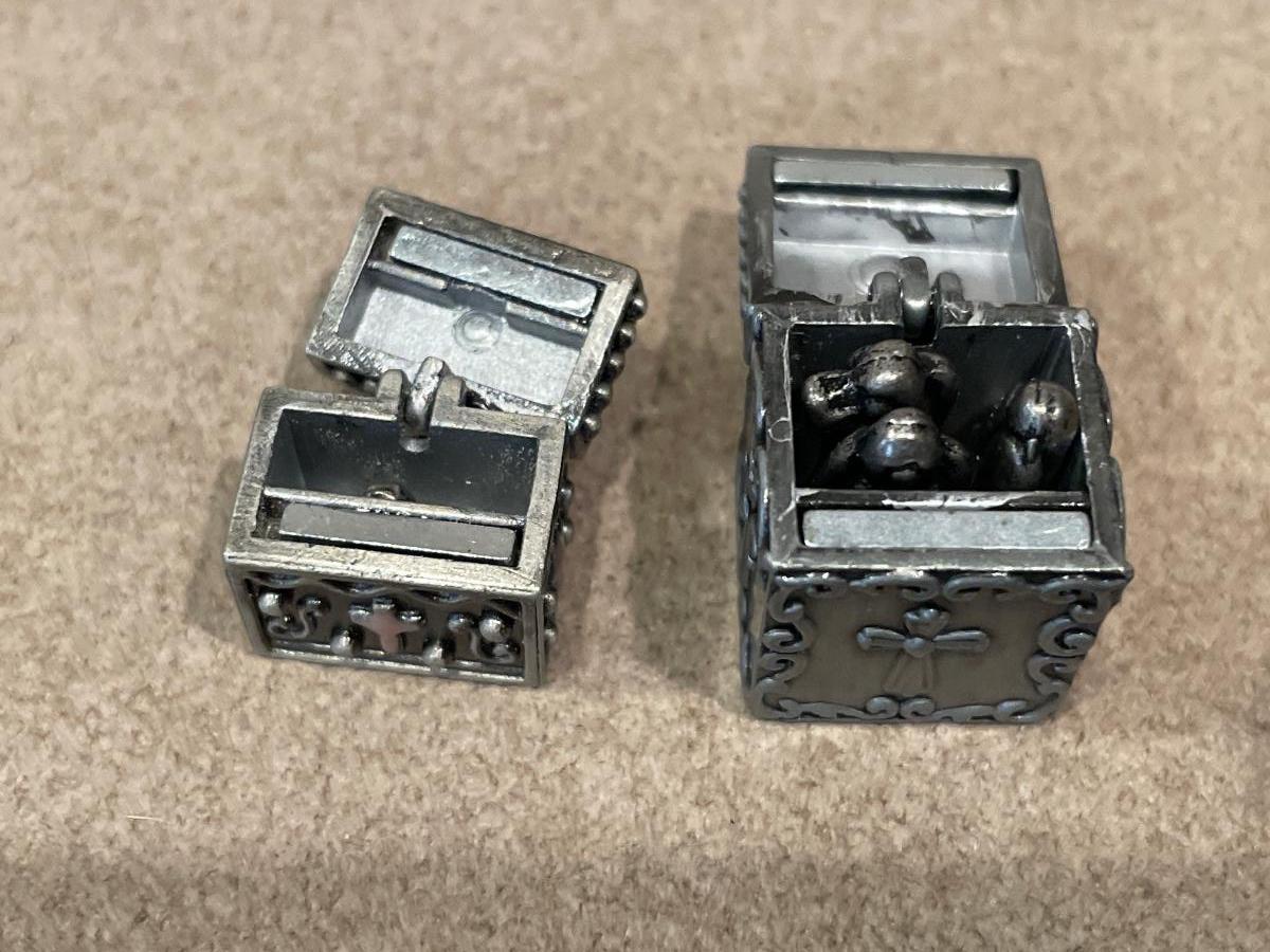2 small Ganz pewter boxes with items inside