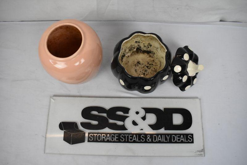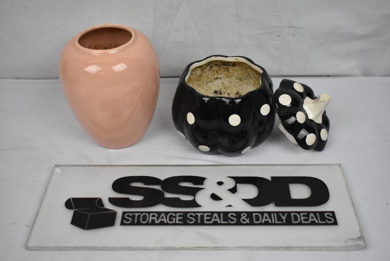 2 Small Planters: Peach Vase Style and B&W Pumpkin with Lid