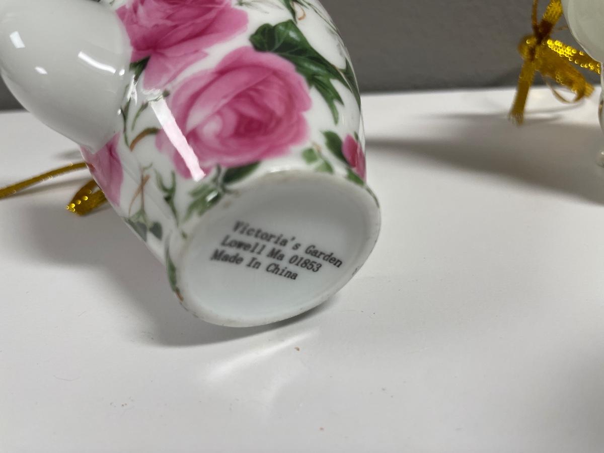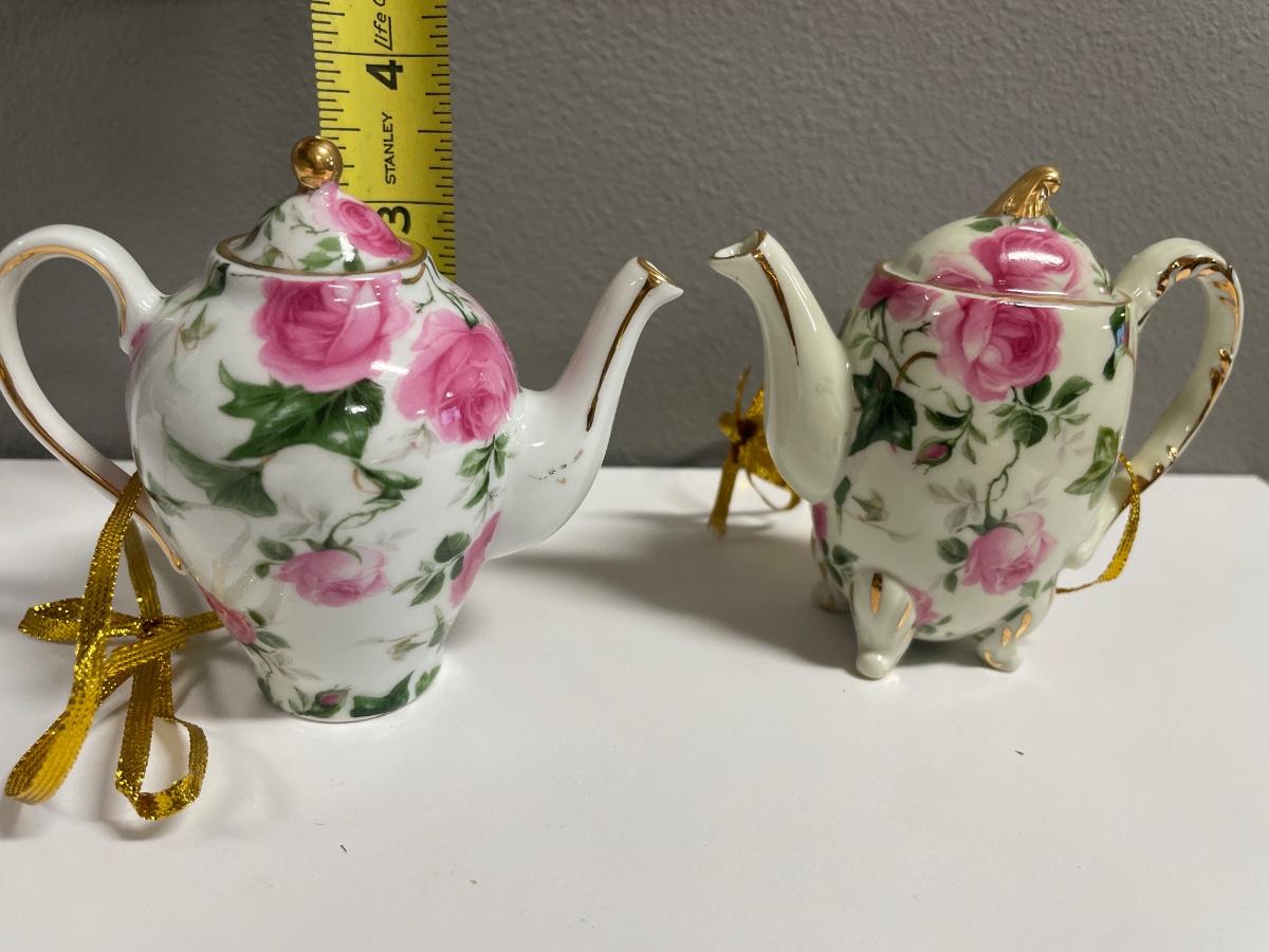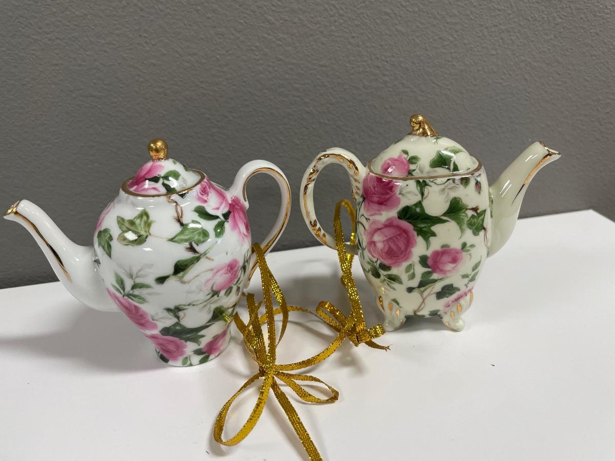 2 small porcelain floral teapot ornaments