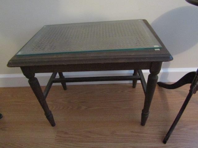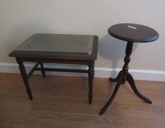 2 Small Wooden Tables: Round- 11 3/4" in Diameter x 22 1/2" High. Rectangular- 22" x 15" x 18 1/2"