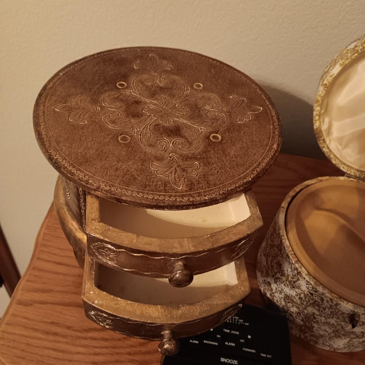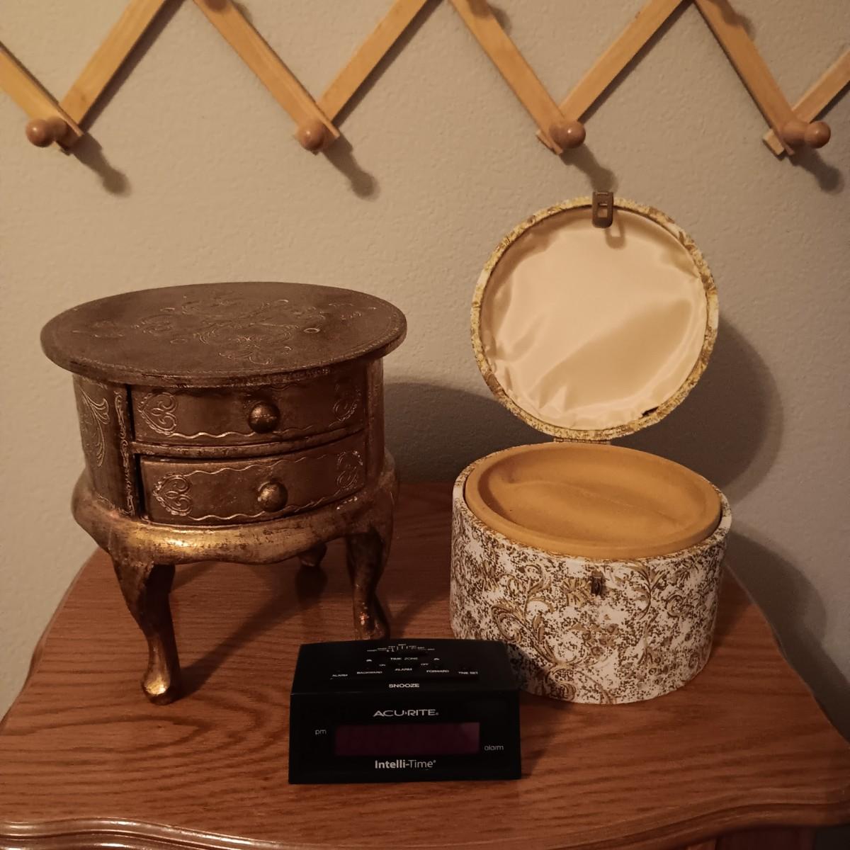 2 SMALLER JEWELRY BOXES AND AN ALARM CLOCK