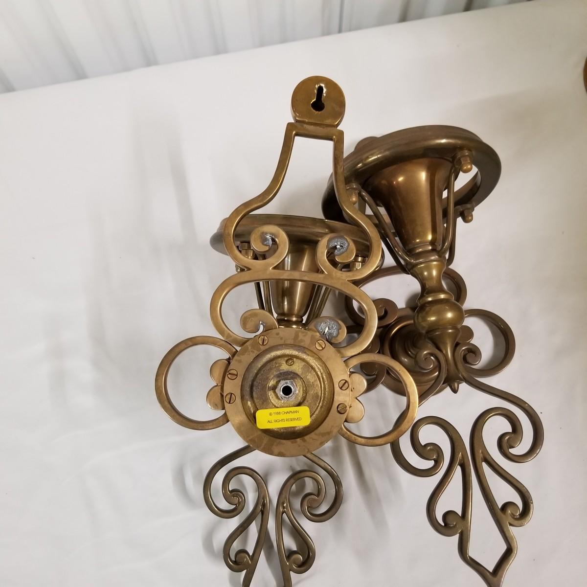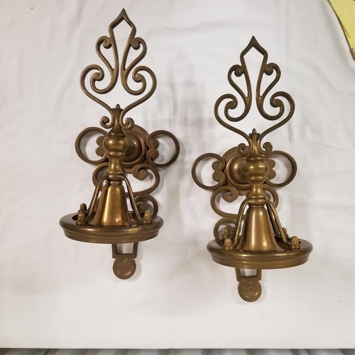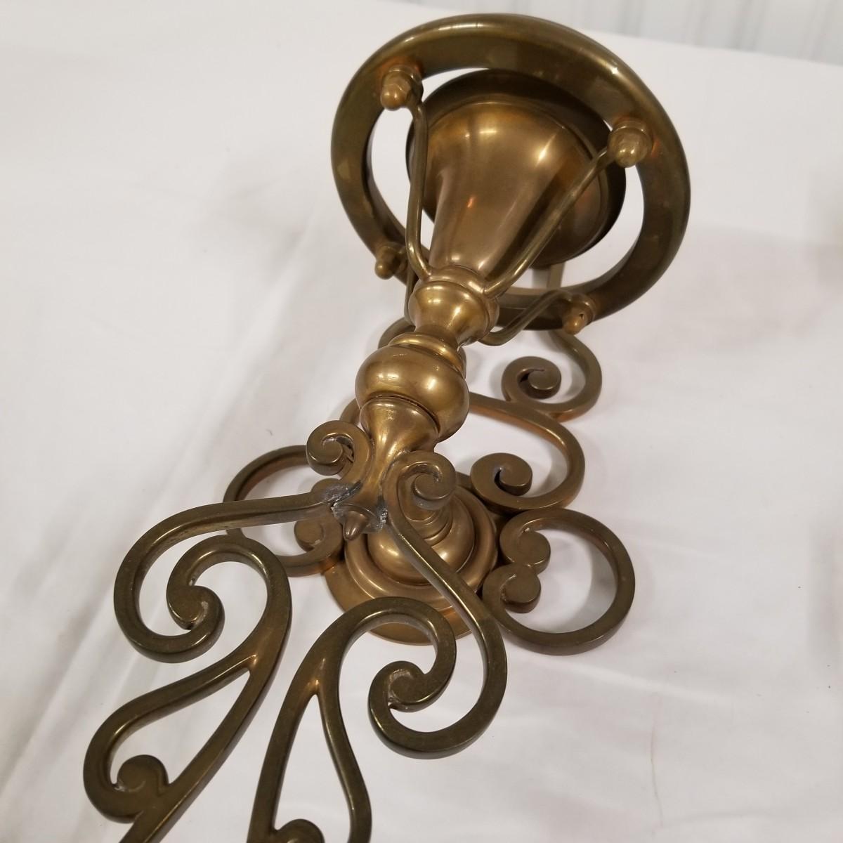 Two decorative solid brass wall sconces. Extended round holder with decorative pendant piece. Each sconce is 7"x17"x7", has hanging slot at top. Very heavy and solid. See photos for detail.  Shipping available.