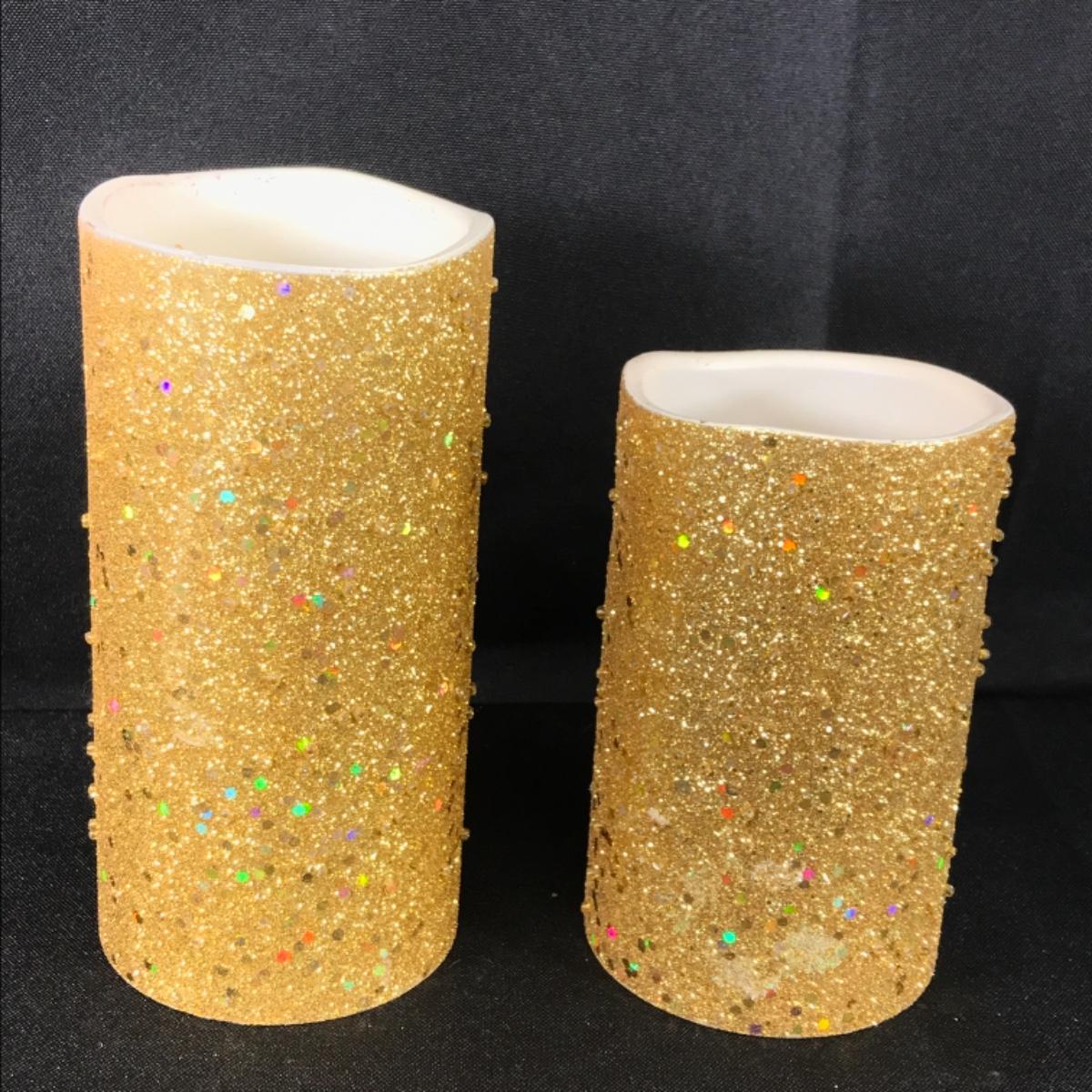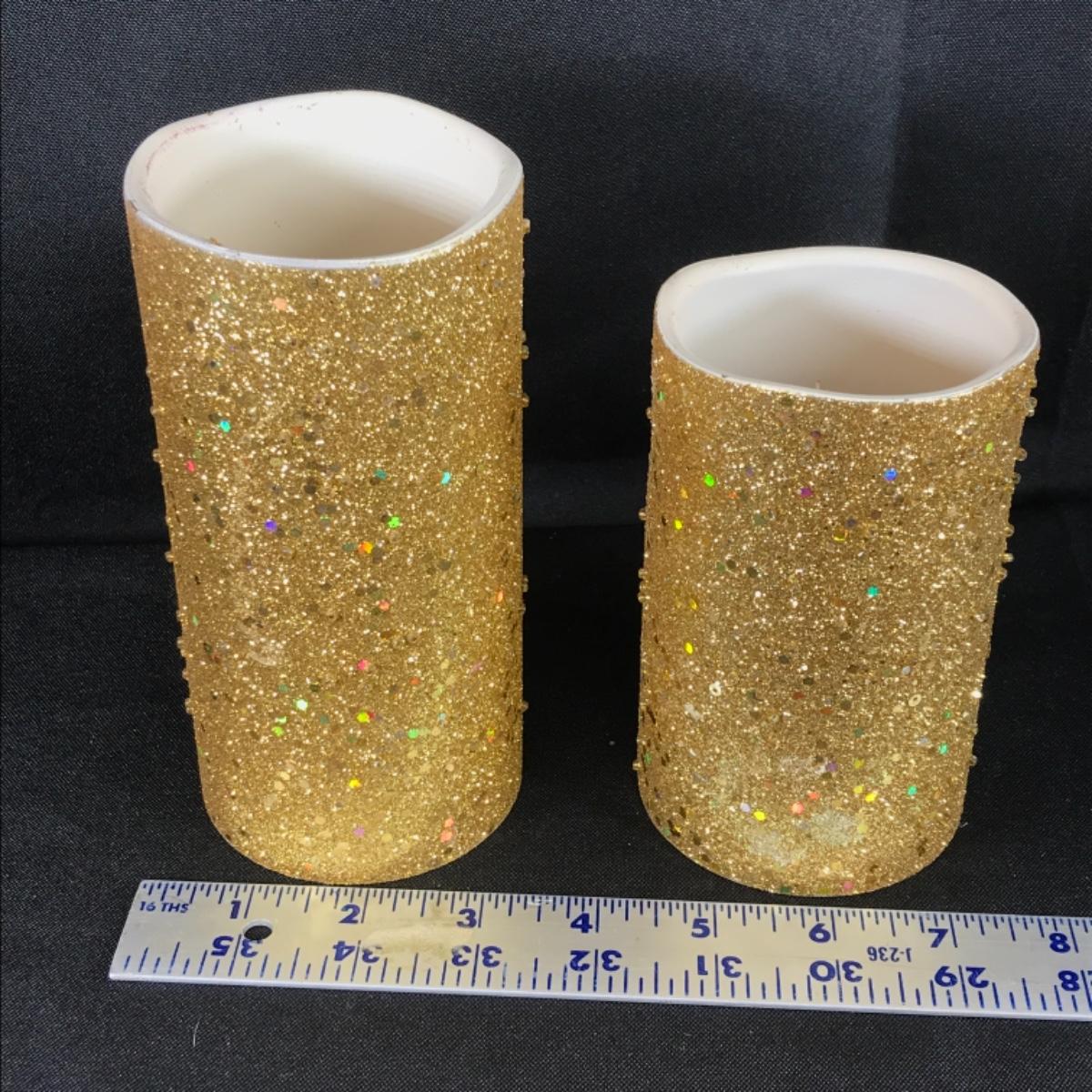 Up for auction or two battery powered candles with a gold sparkly finish. One stands 6 inches tall with the other standing 5 inches tall. These are untested and batteries are not included.