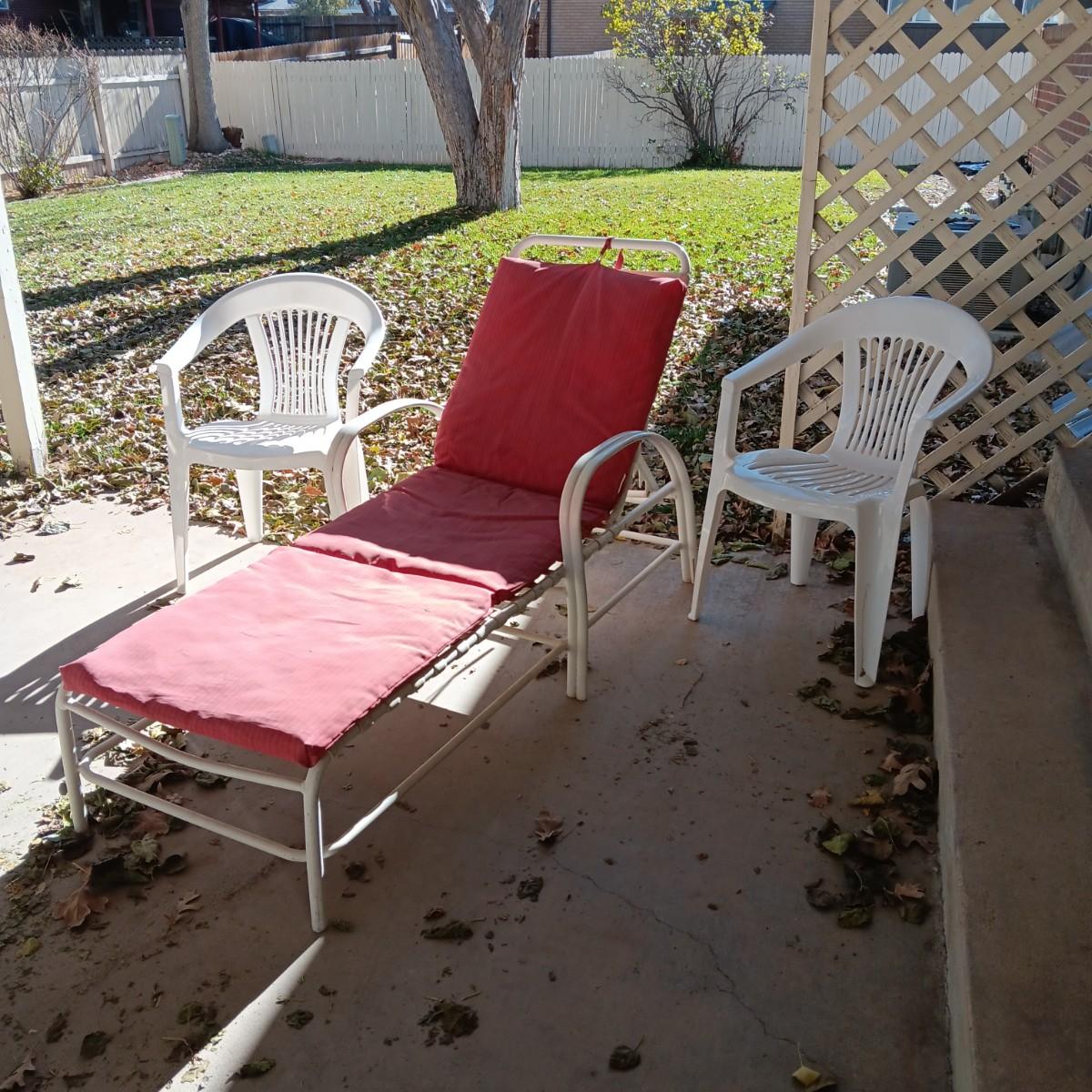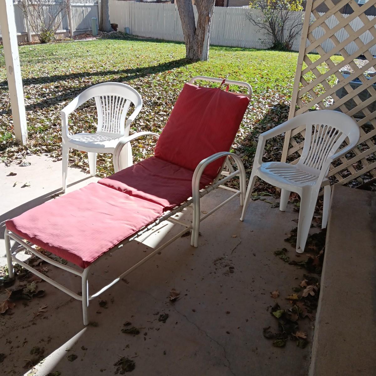 2 STACKING PLASTIC CHAIRS AND AN ADJUSTABLE LOUNGE CHAIR
