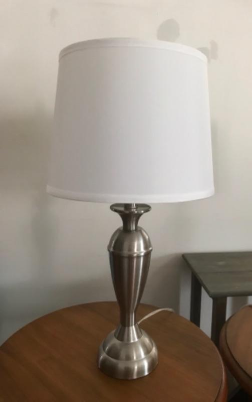 2 STAINLESS STEEL LAMPS WITH WHITE SHADES
