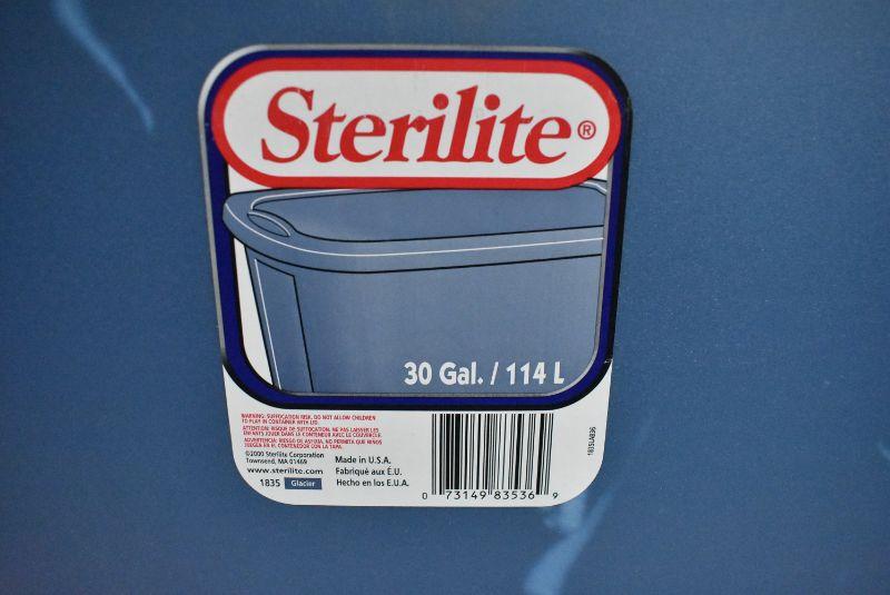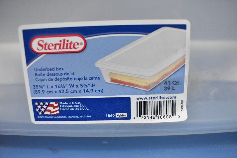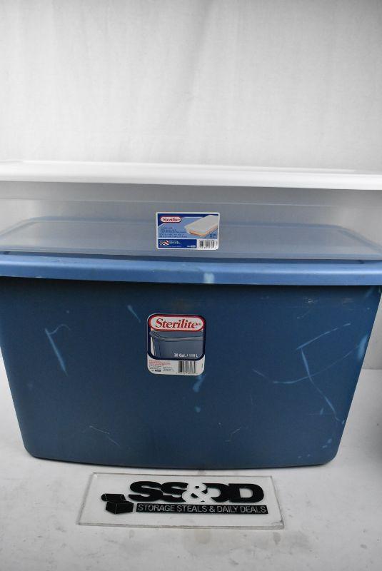 2 Sterilite Storage Bins: Clear w/ White Lid Underbed 41 qt, Blue 30 gallon with blue lid