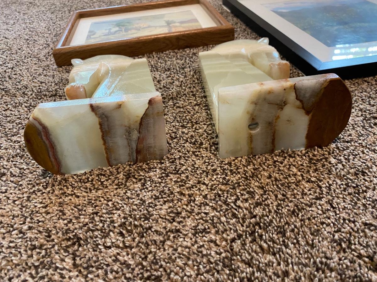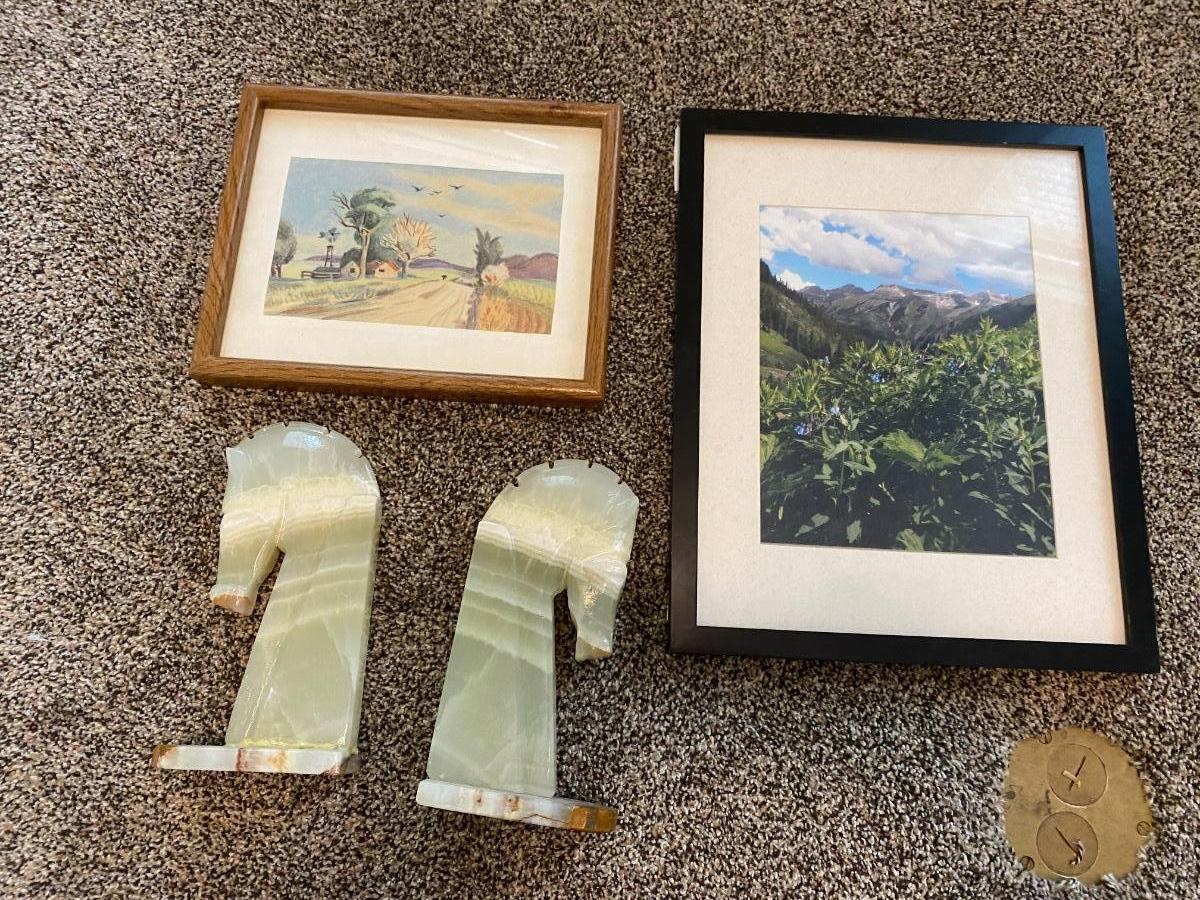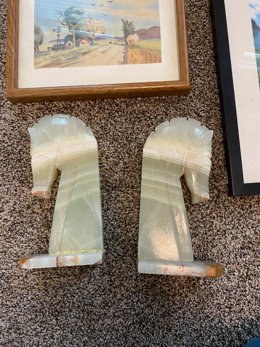 2 STONE HORSE HEAD BOOK ENDS AND FRAMED PICTURES