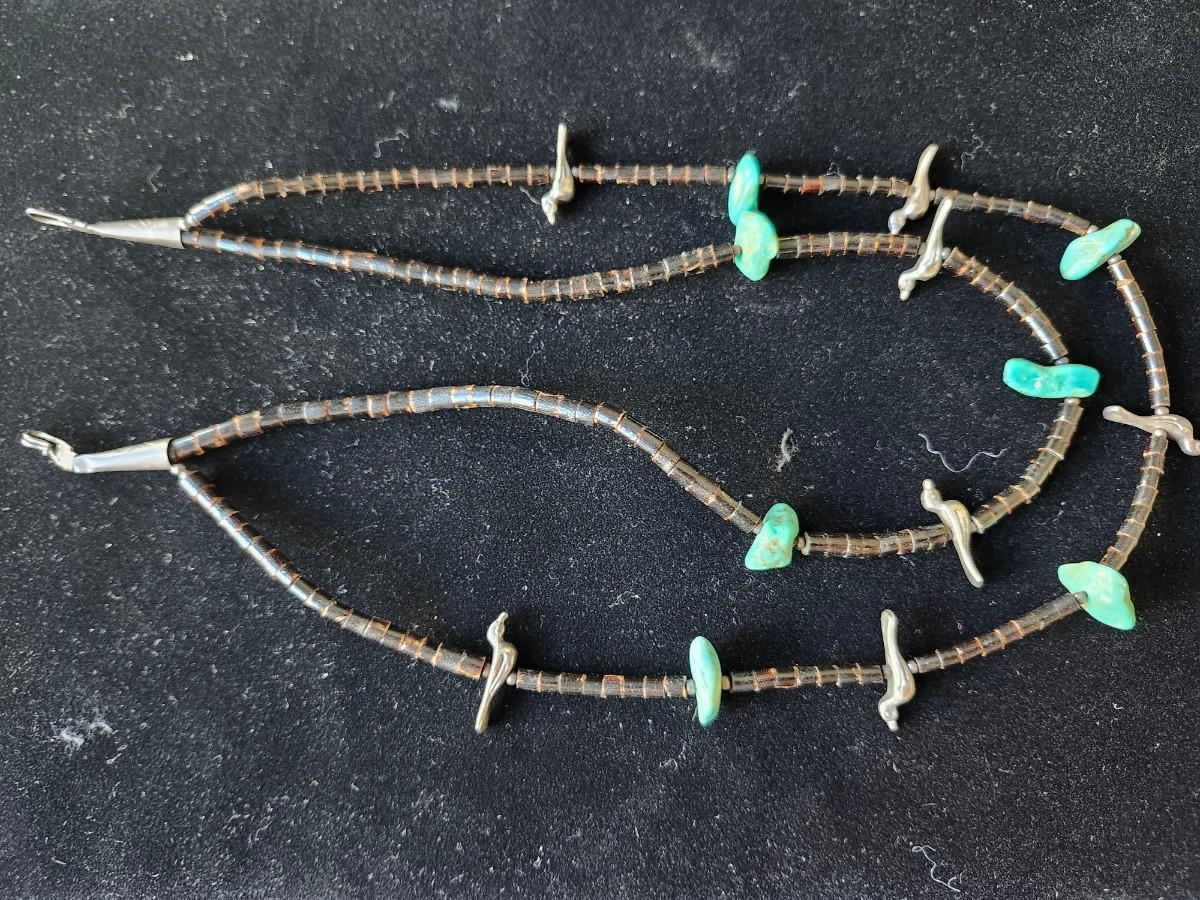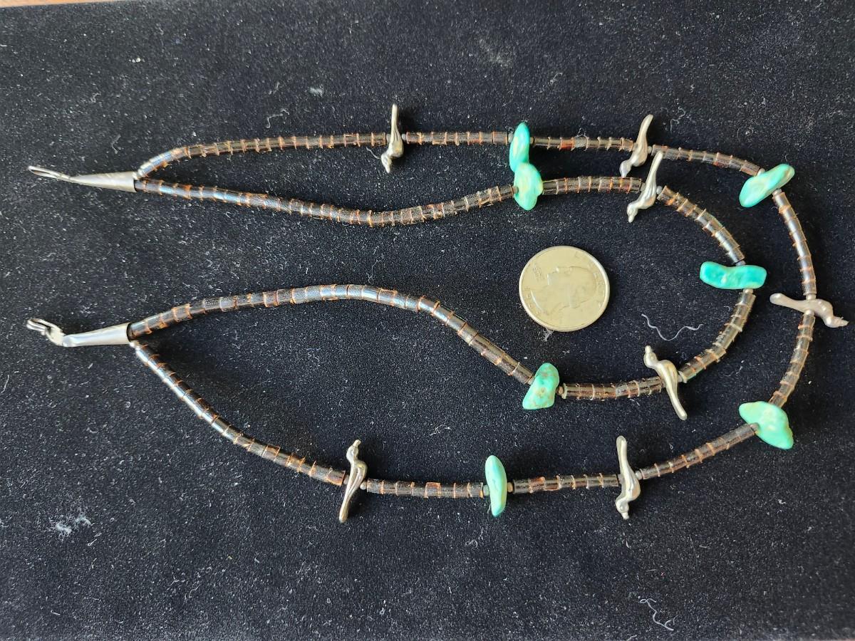 Lovely Turquoise tone and MOP birds on this necklace, fits across the collarbone and above.