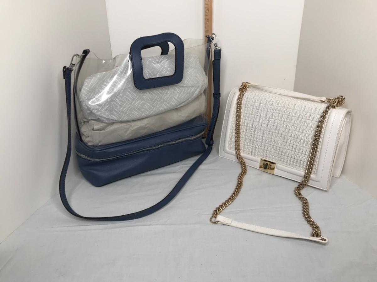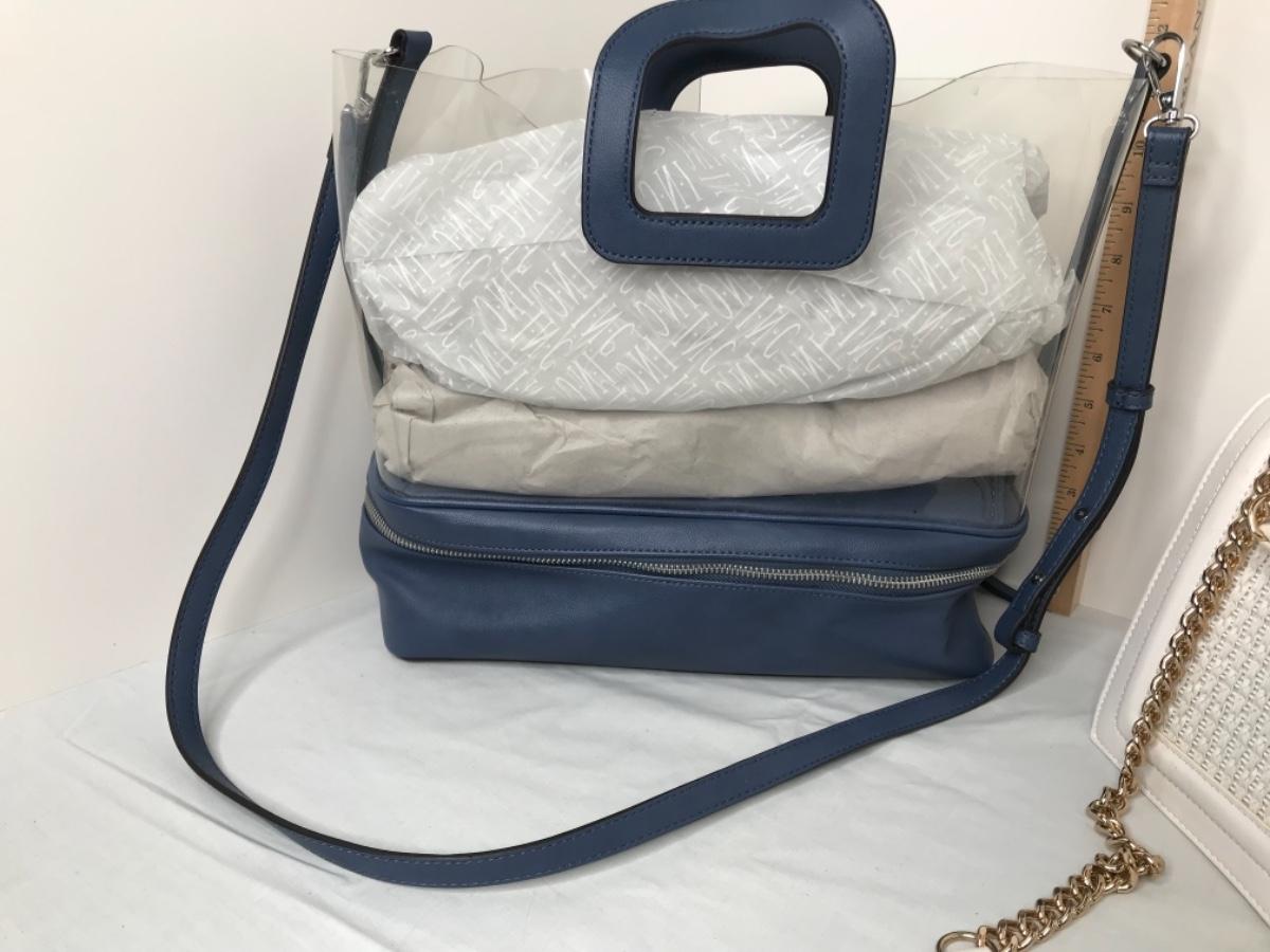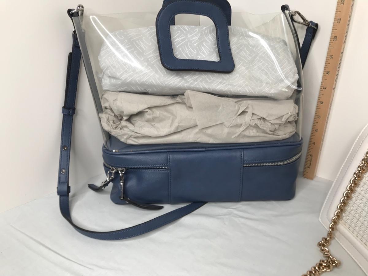 Blue and clear bag with shoulder strap and handles and zippered pouch on bottom
