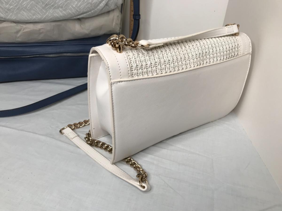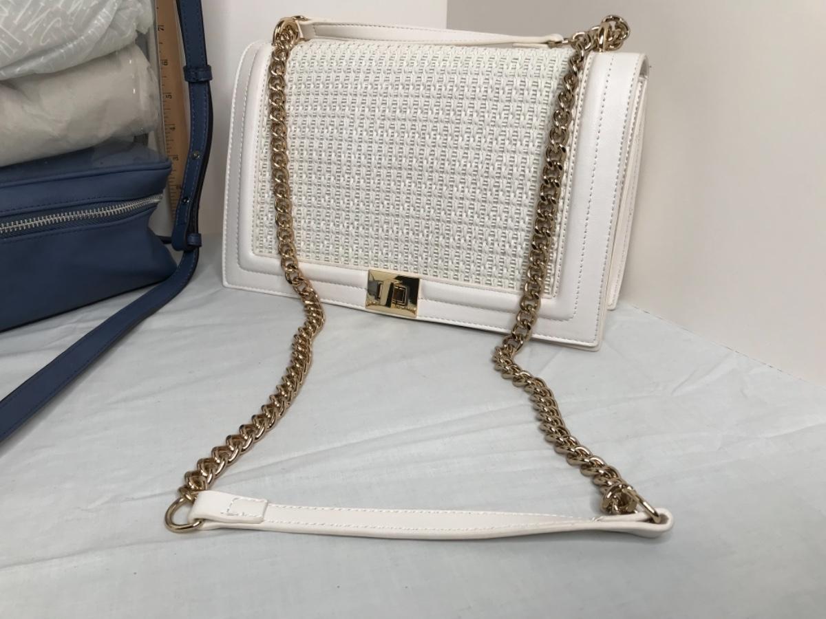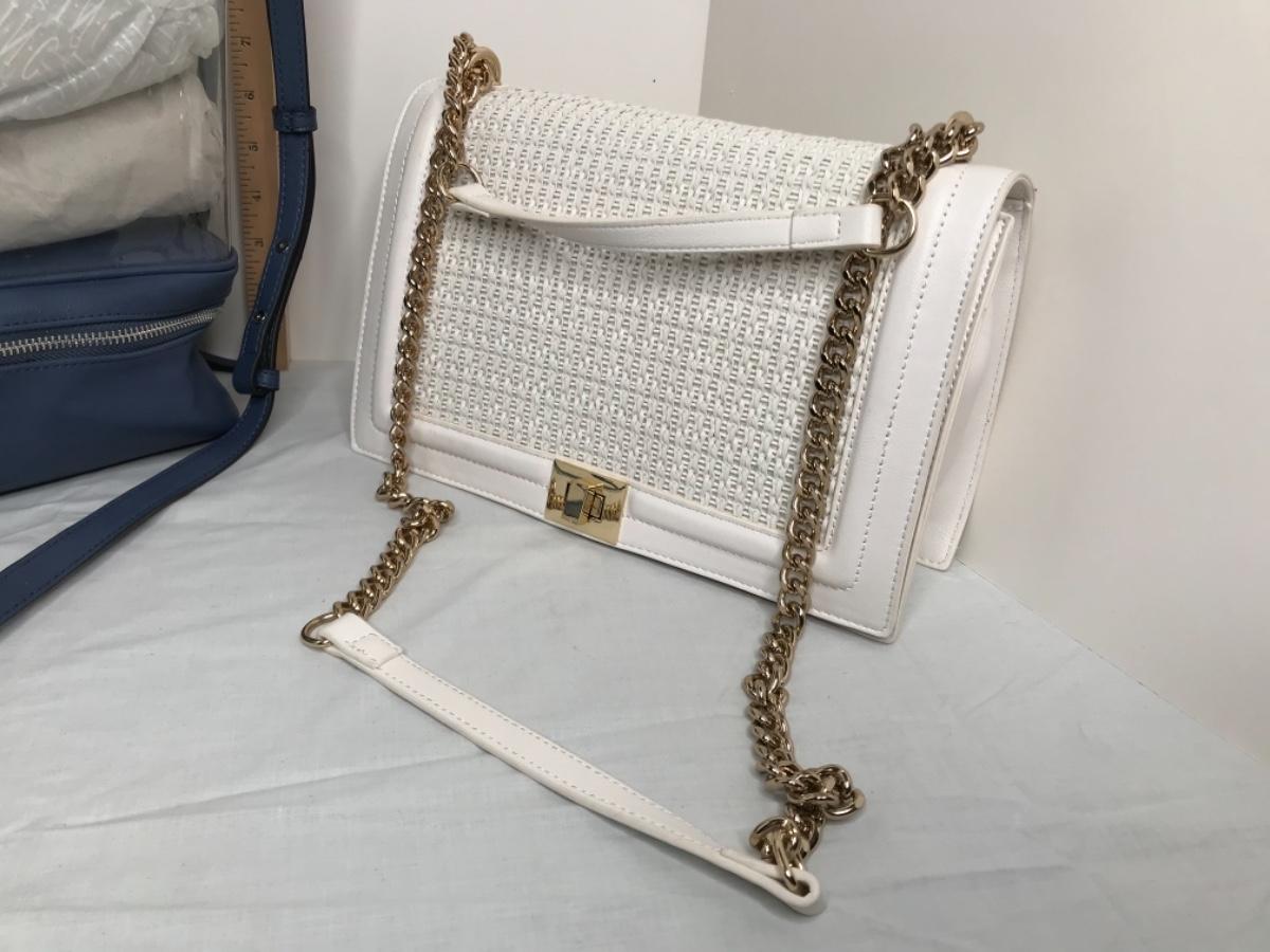 Blue and clear bag with shoulder strap and handles and zippered pouch on bottom