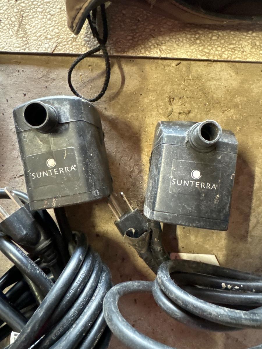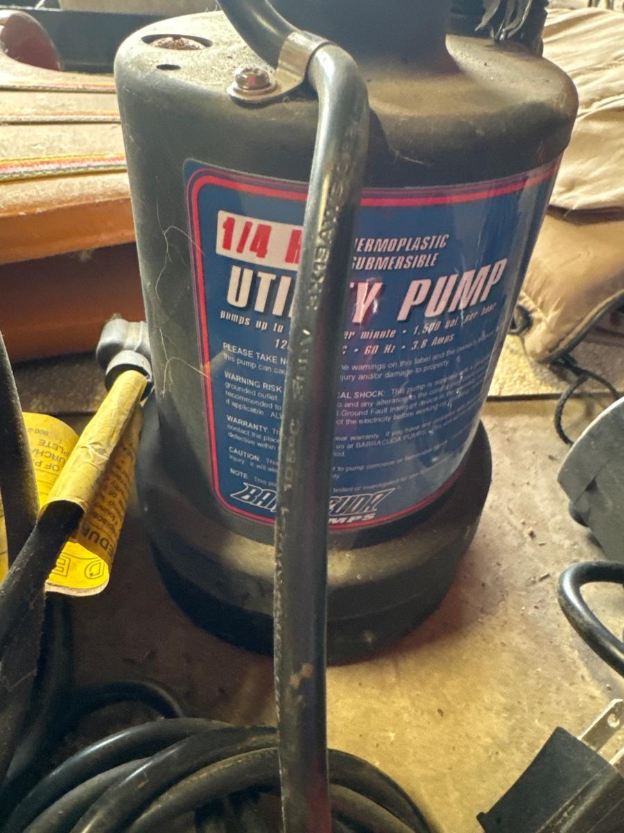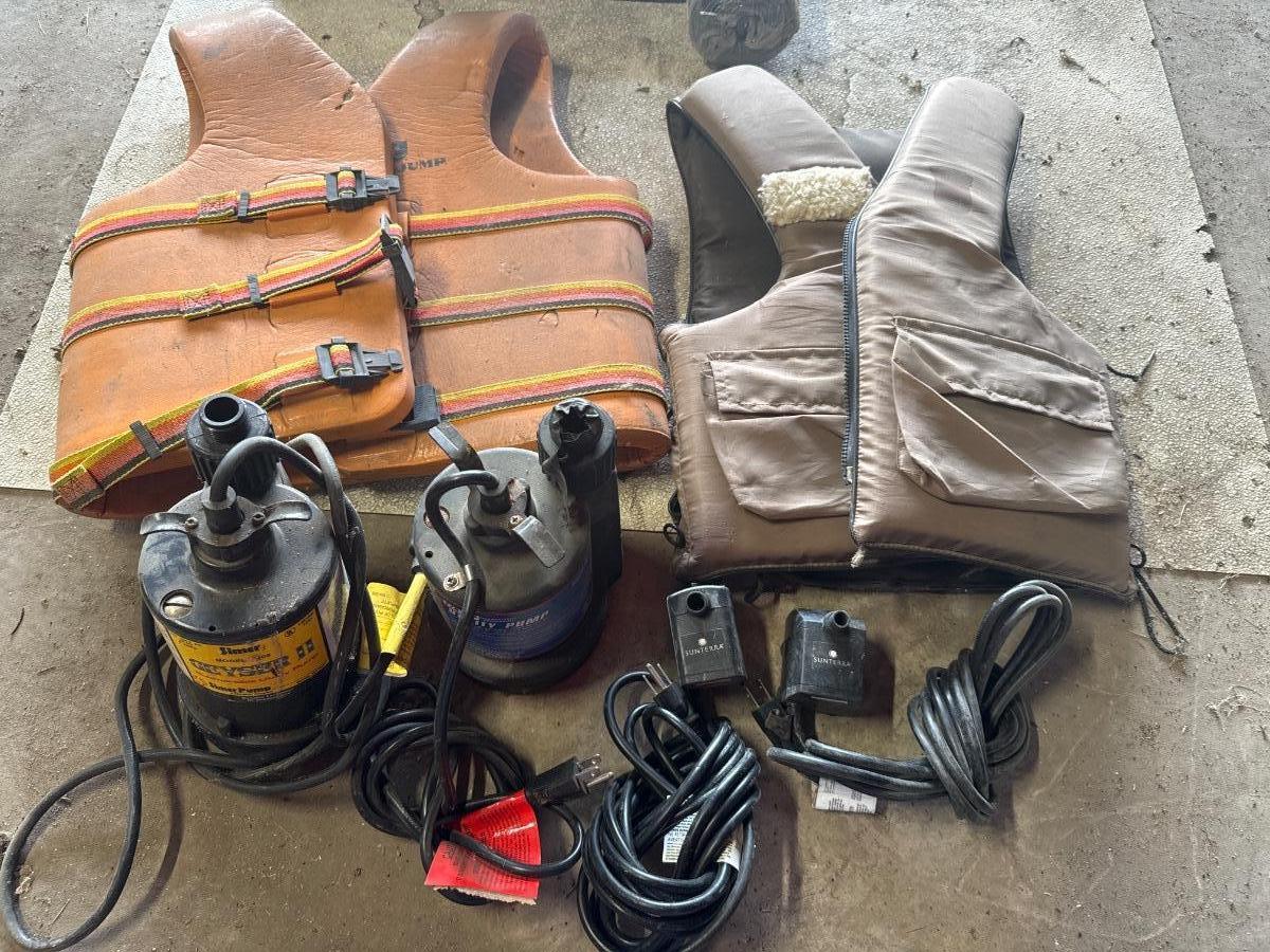 2 sump pumps, 2 life jackets and 2 coy pond pumps