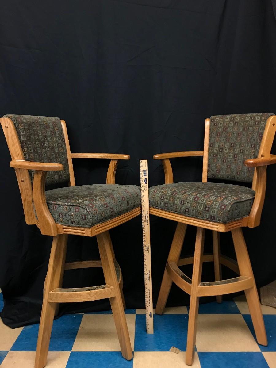 furniture: 2 swiveled wooden/cloth bar stools with footrest;