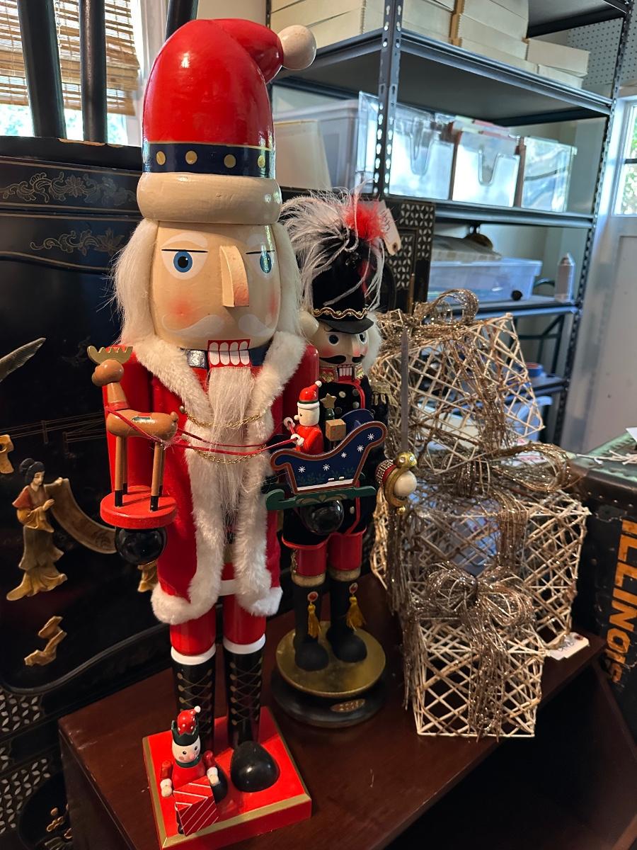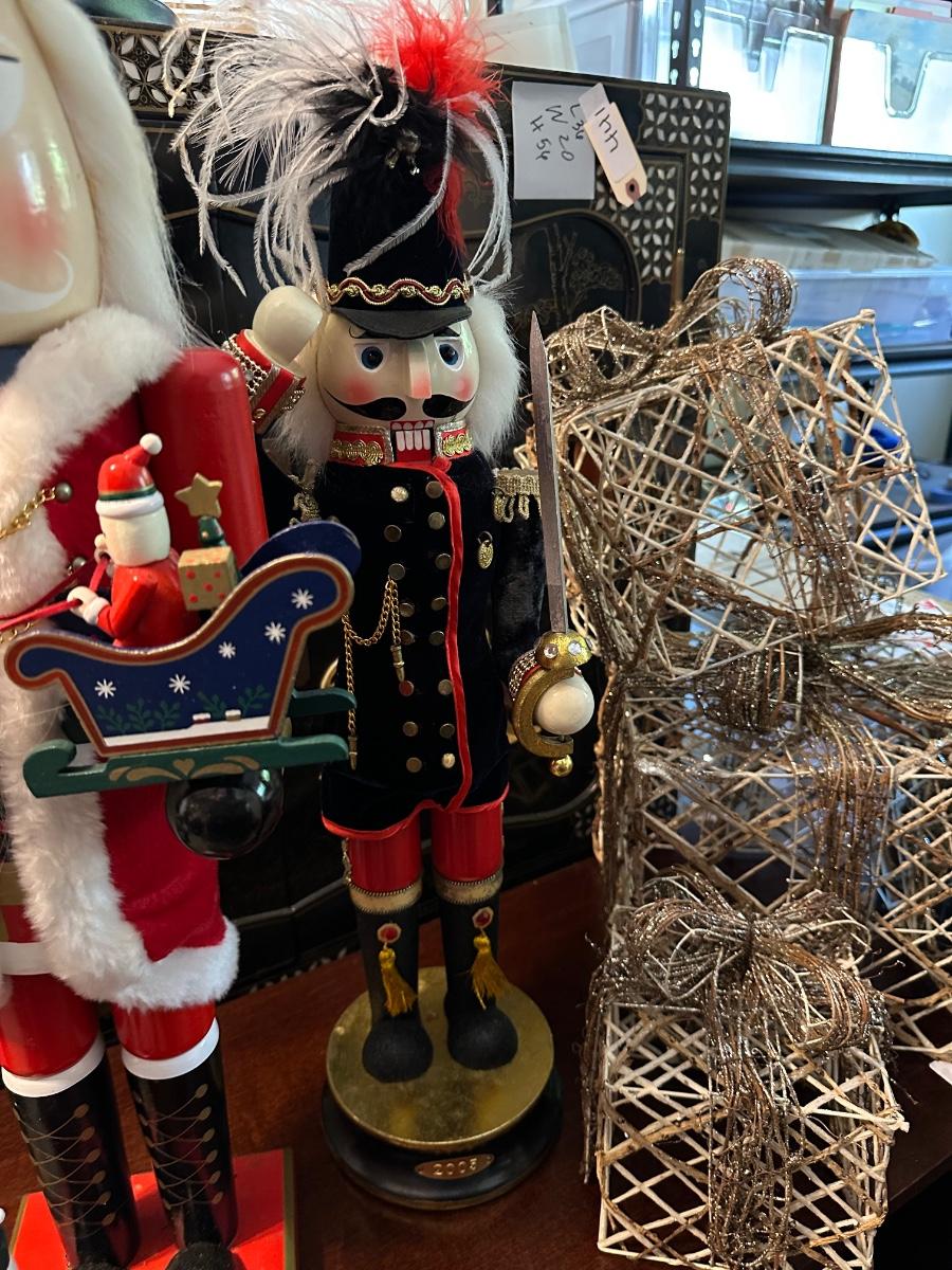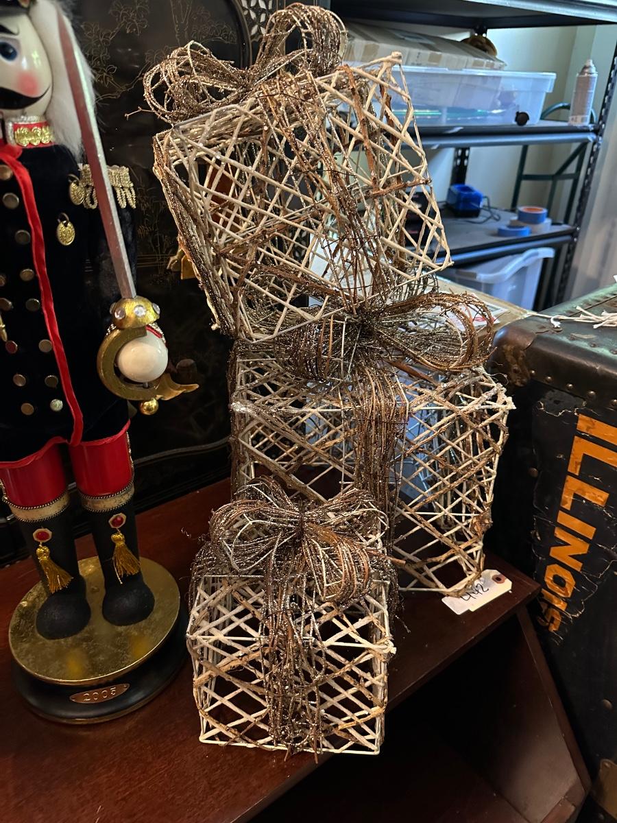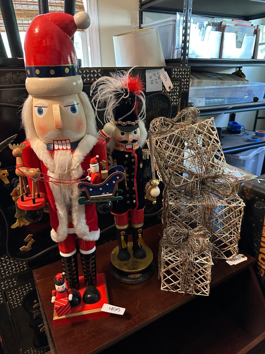 2 TALL NUTCRACKERS, WIRE PRESENT DÉCOR