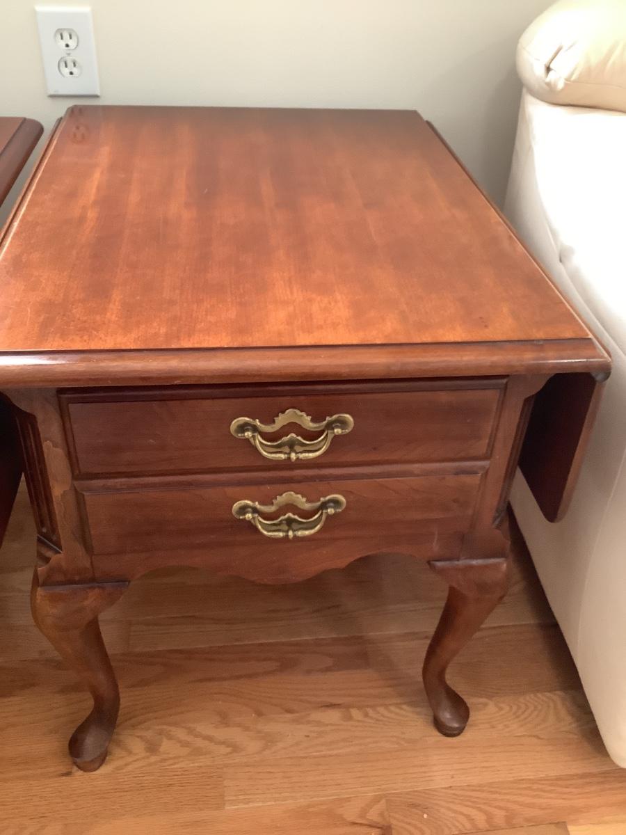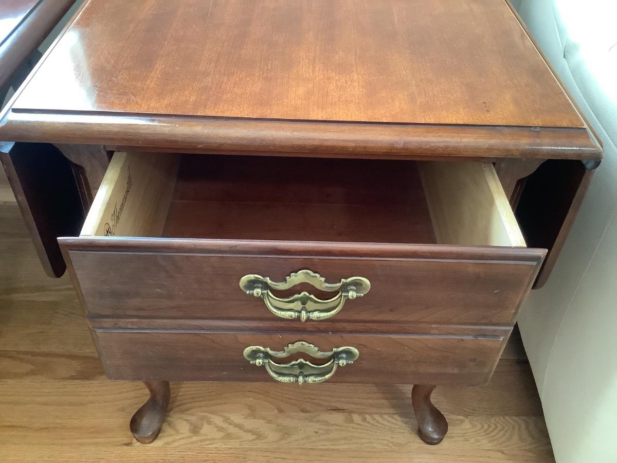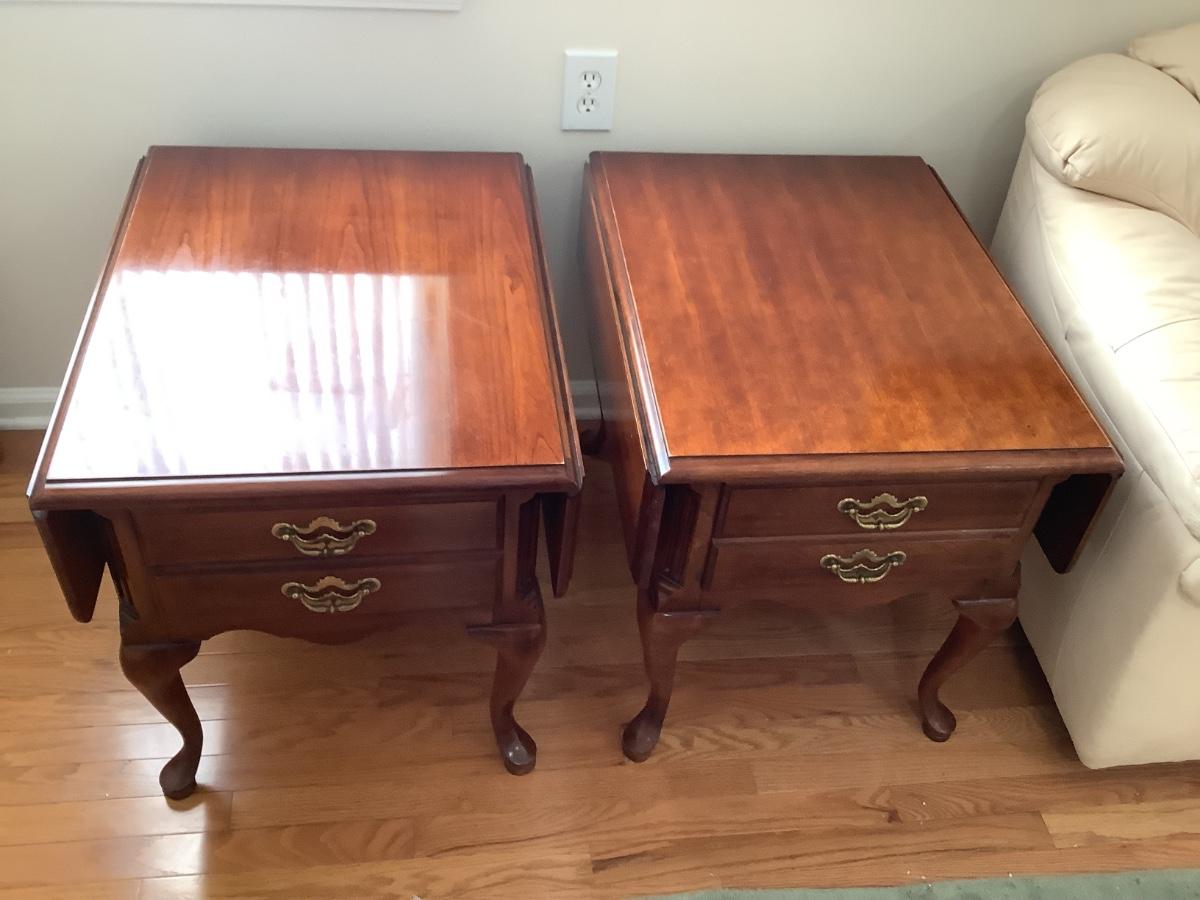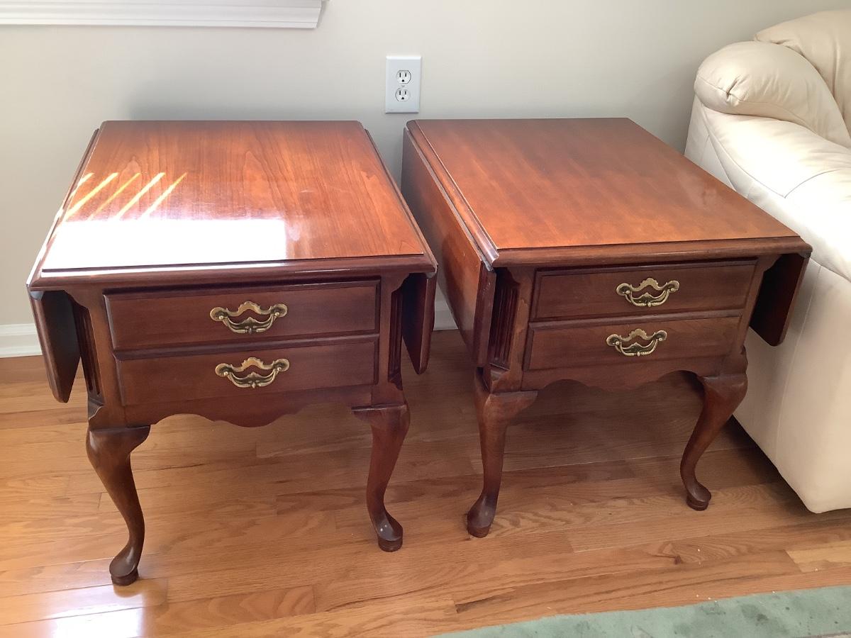 2- Thomasville drop leaf end/side tables, 1 drawer each, 24”H 21” x 28”- 35” with leaves up