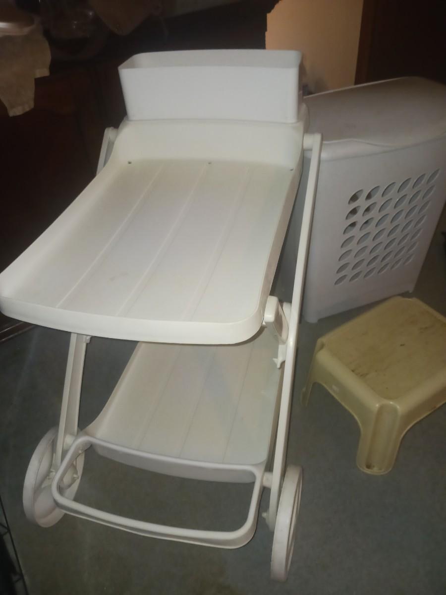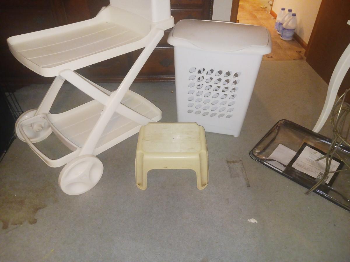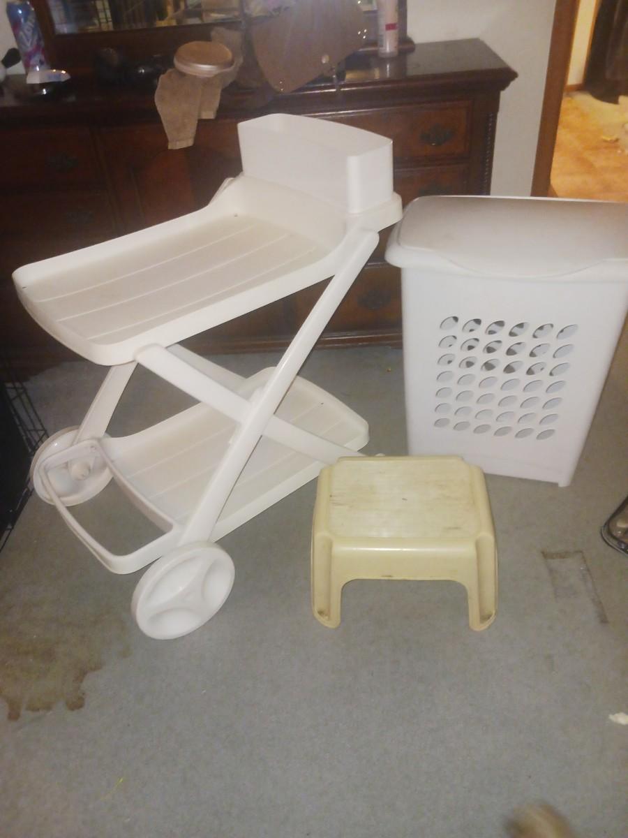 2 TIER CART, LAUNDRY BASKET AND STEP STOOL