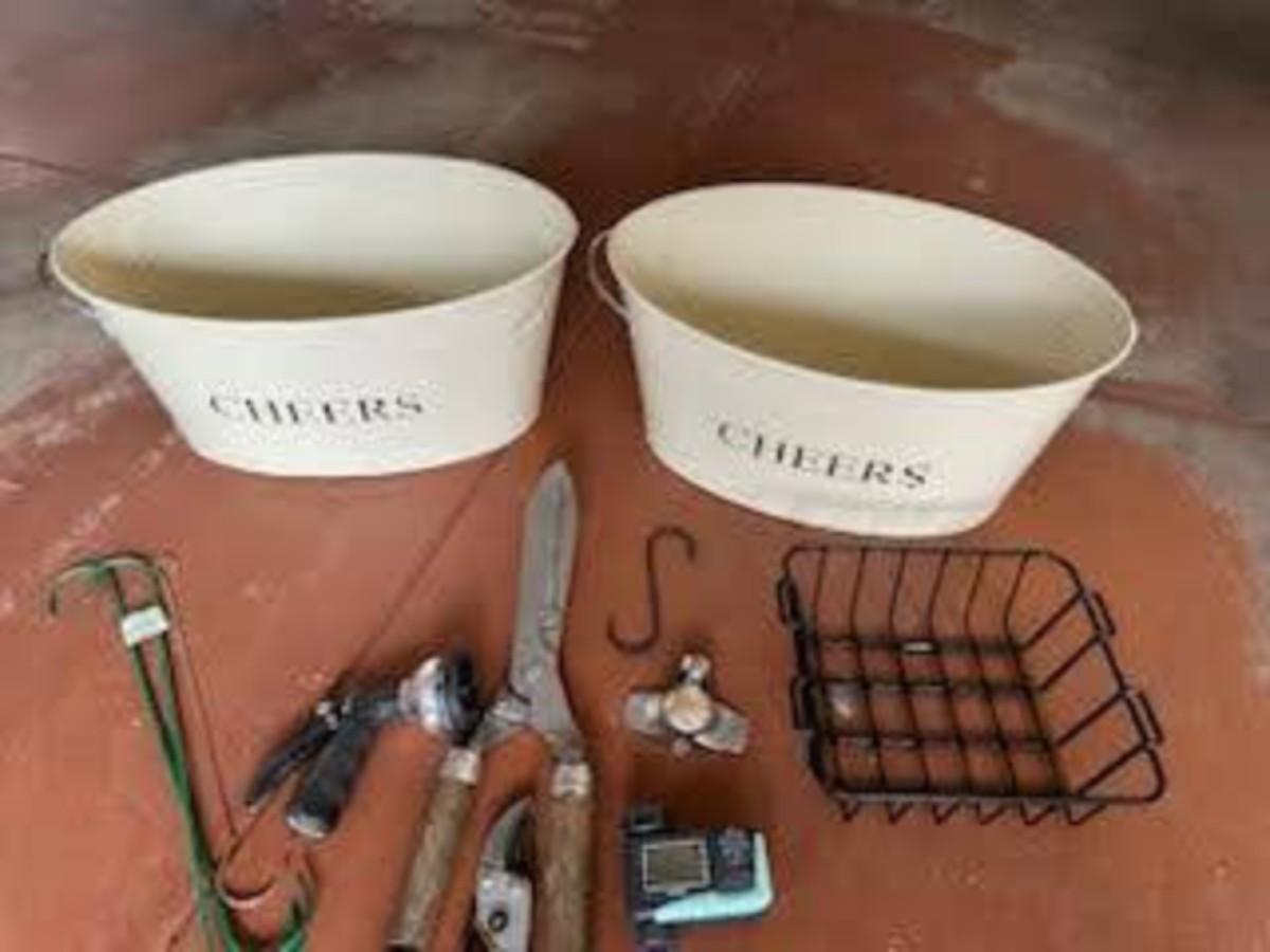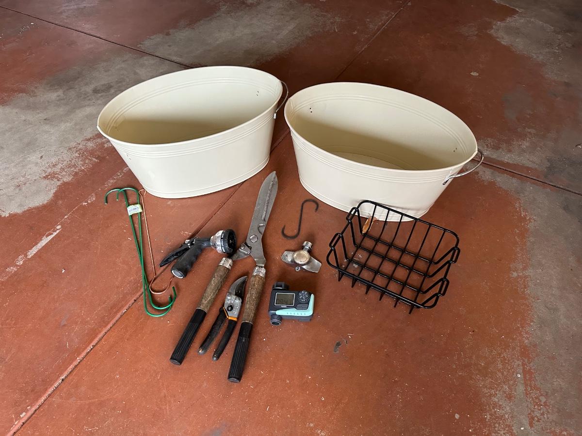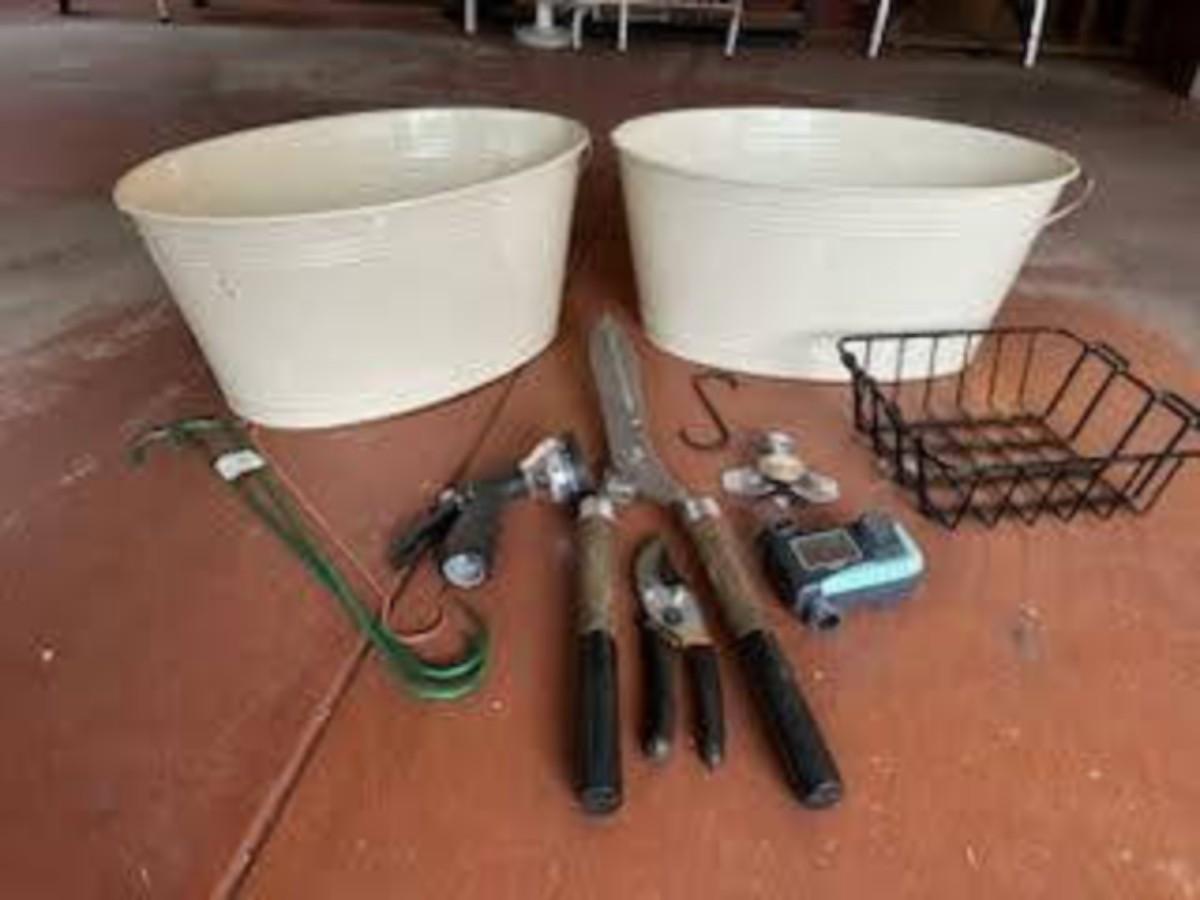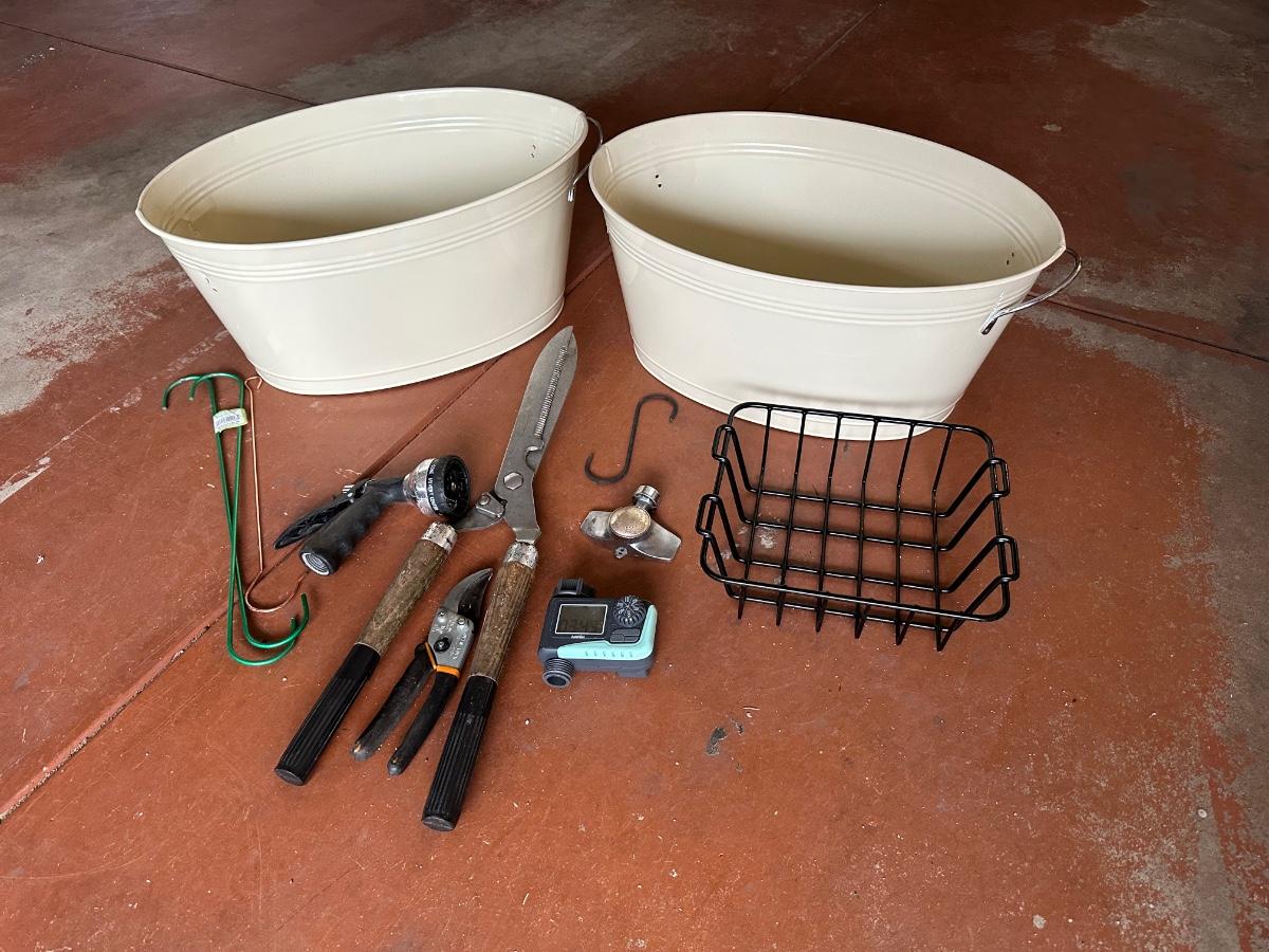 2 TIN BEVERAGE BUCKETS, YARD TOOLS AND MORE