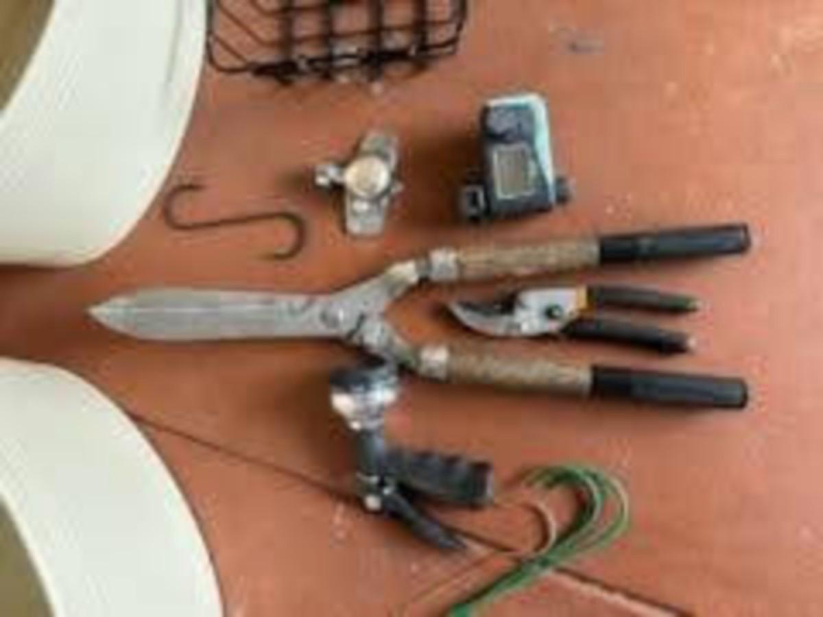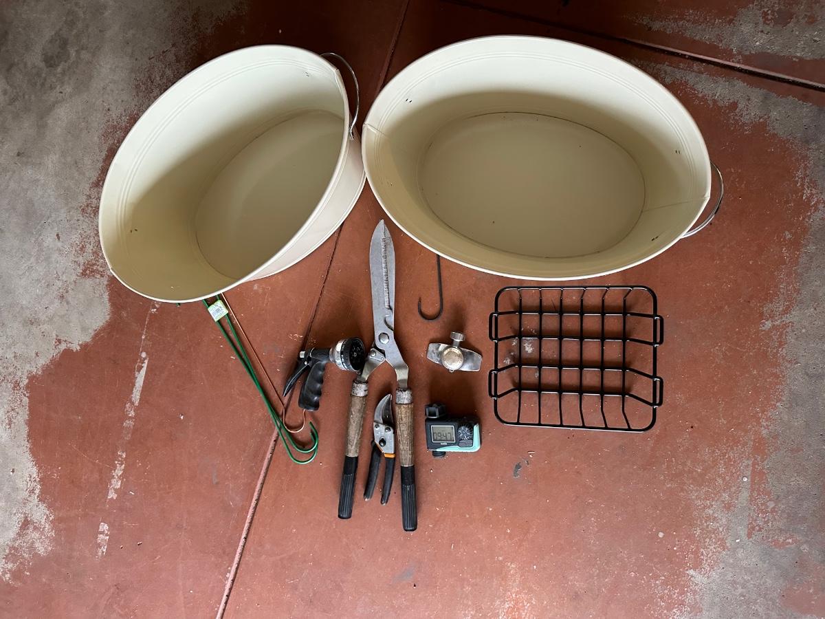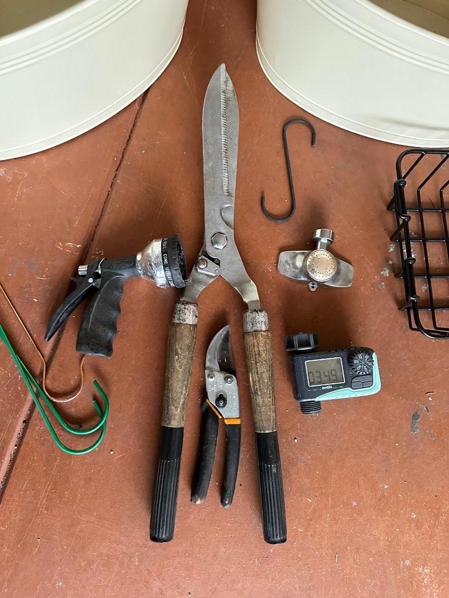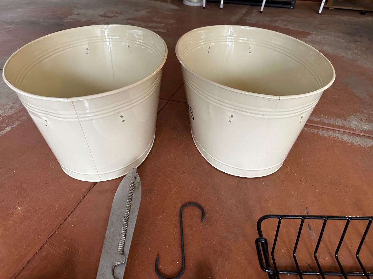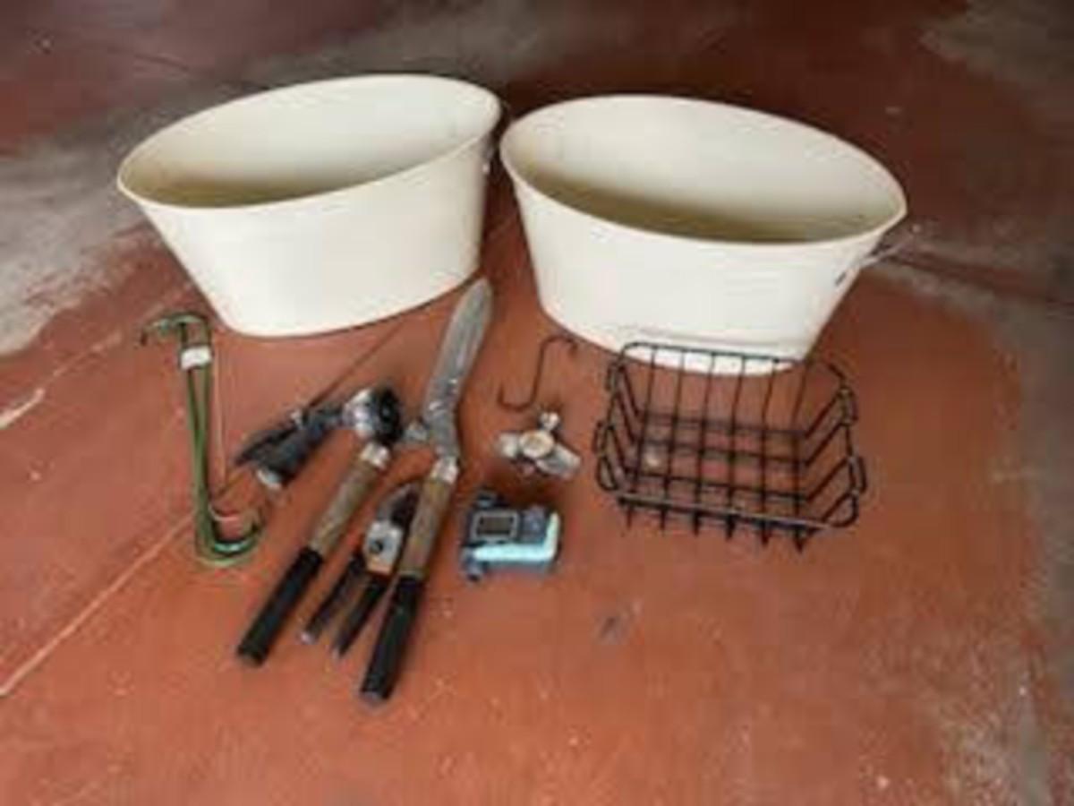 2 TIN BEVERAGE BUCKETS, YARD TOOLS AND MORE
