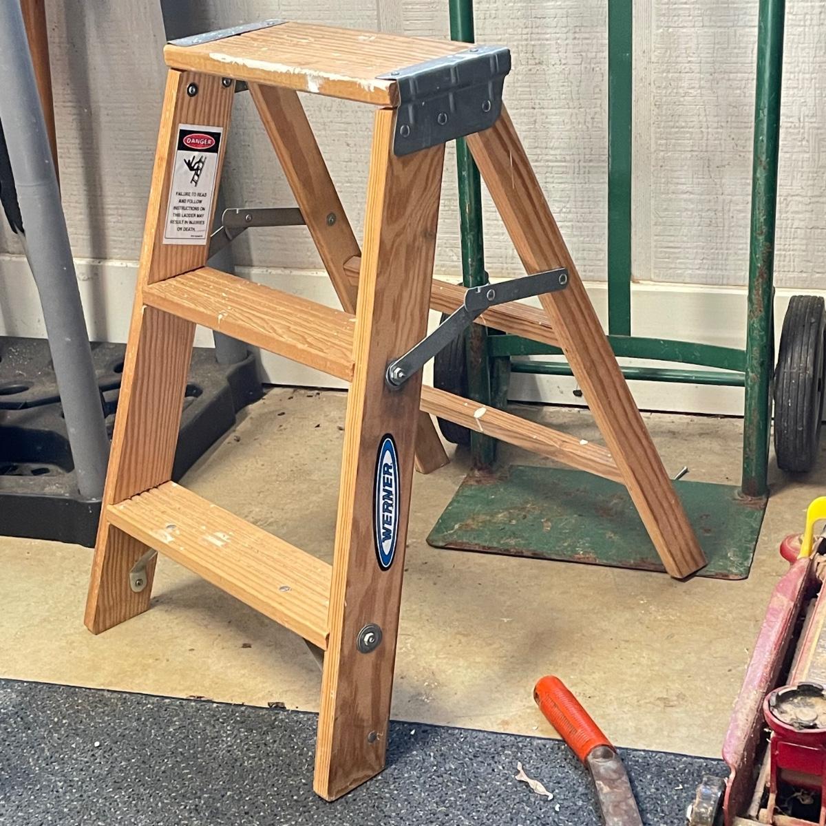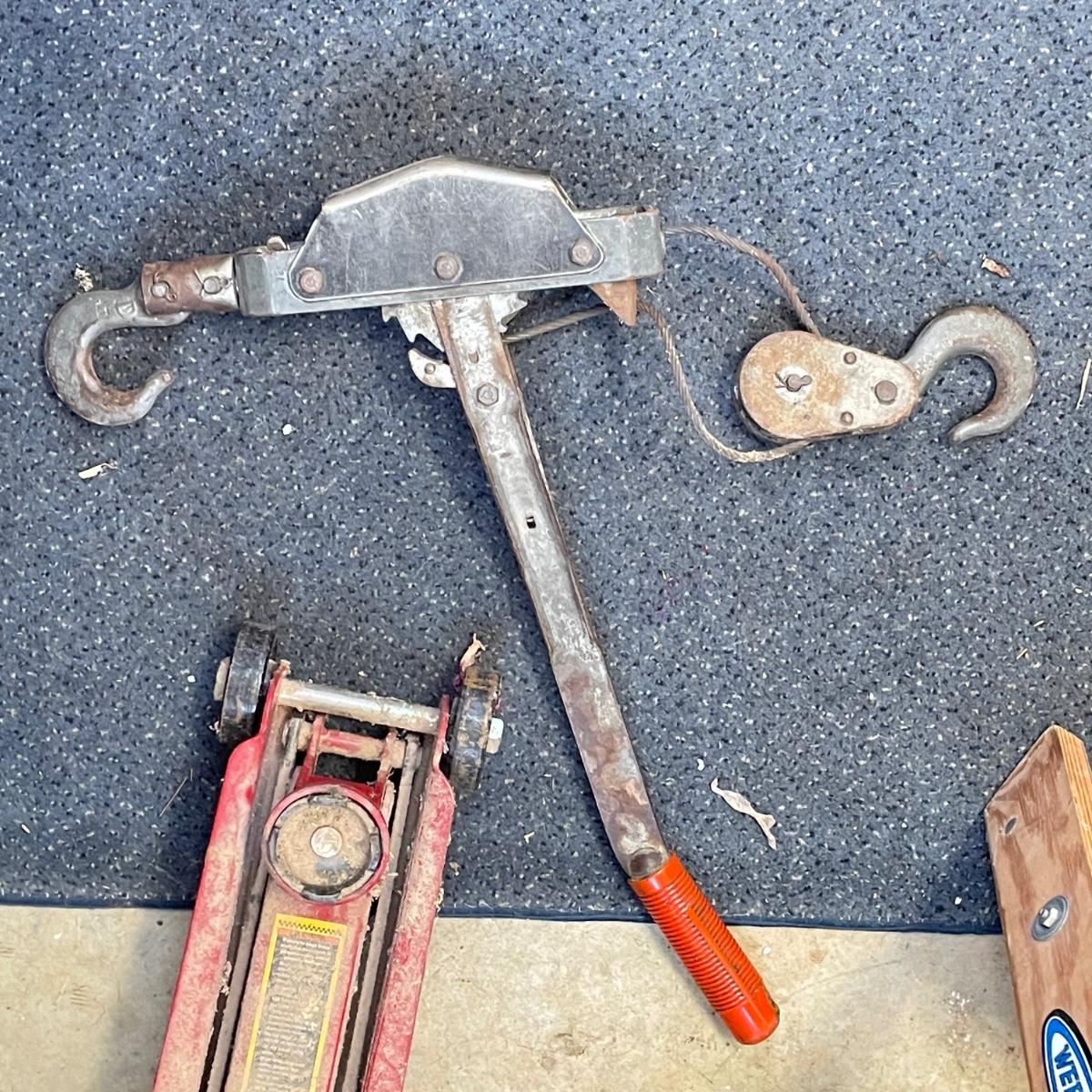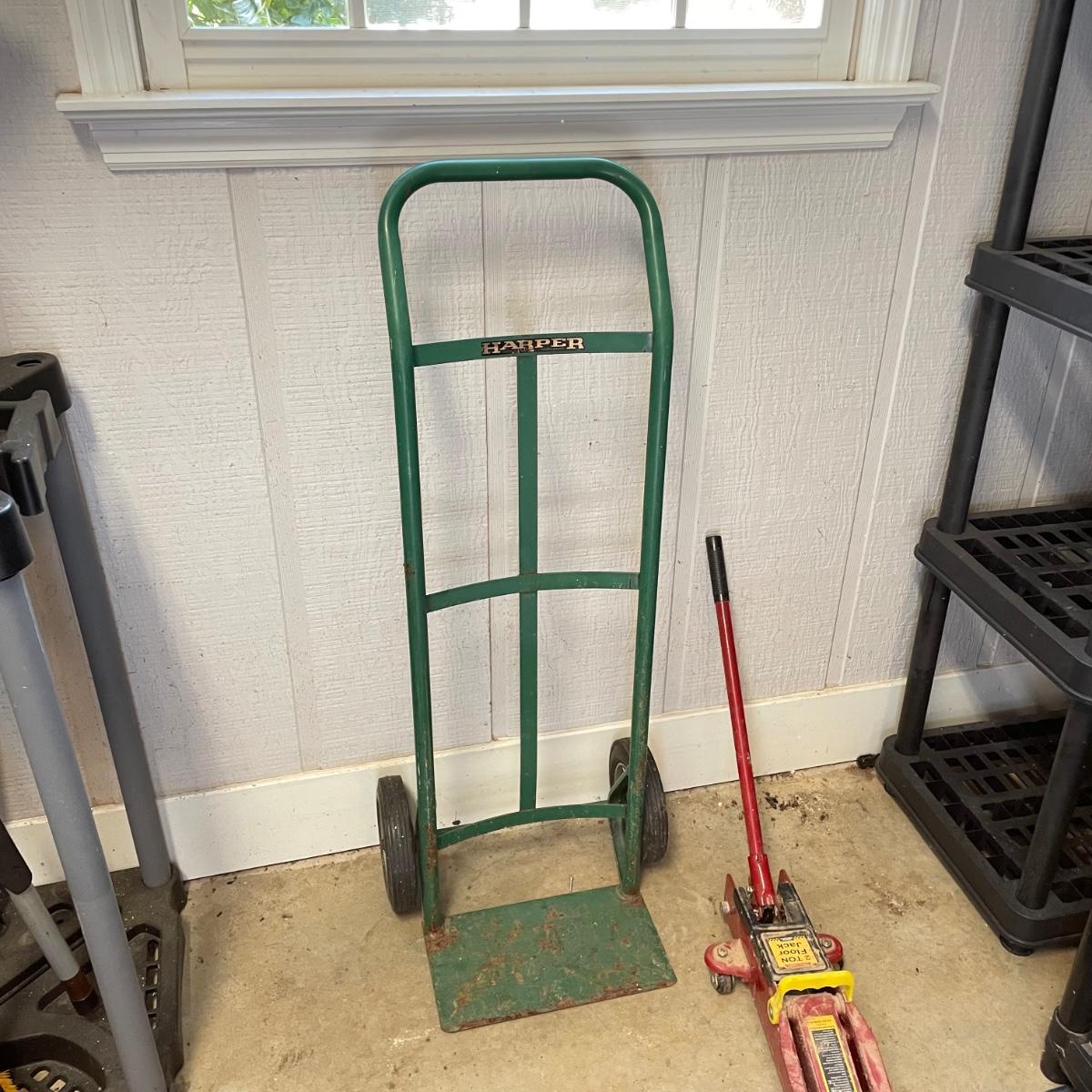 Harper hard wheeled hand truck, wooden Werner 2’ step ladder, 2 ton Mini Mule model MM212R and a 2 ton floor jack. Items show normal wear, no items were tested. See images. Local pick up only.