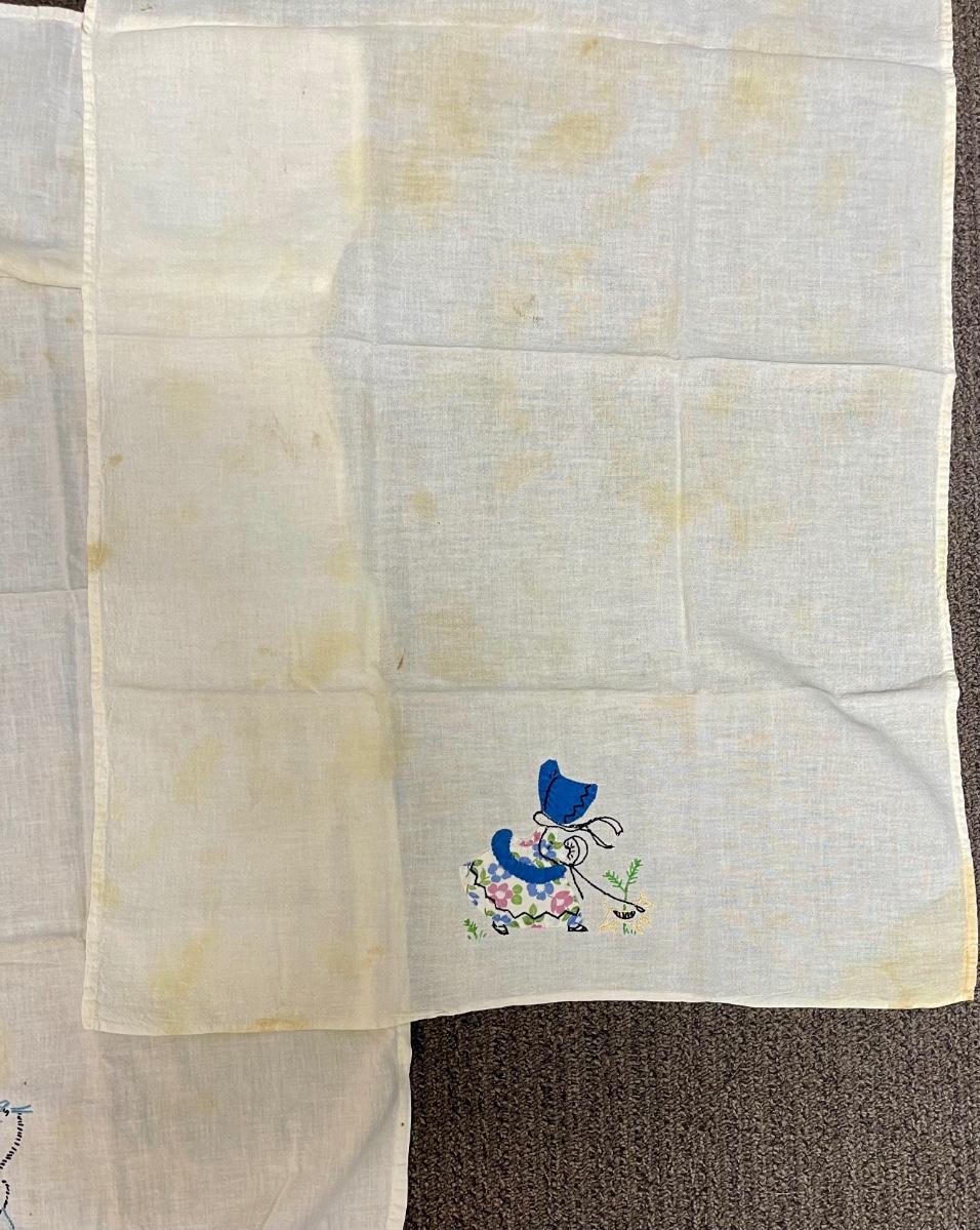 In fair used condition with some obvious stains that might come out with a vinegar soak and a good laundering.