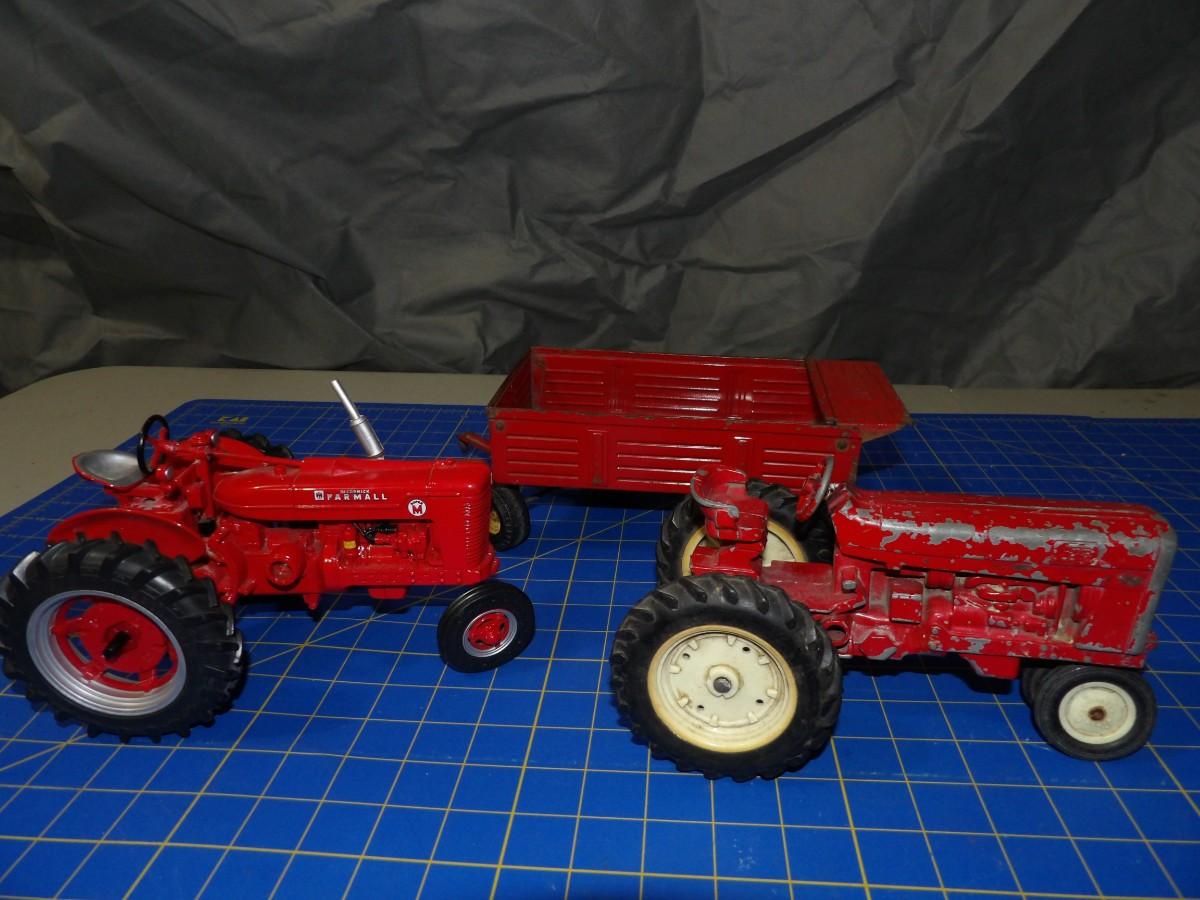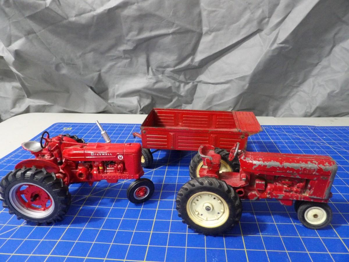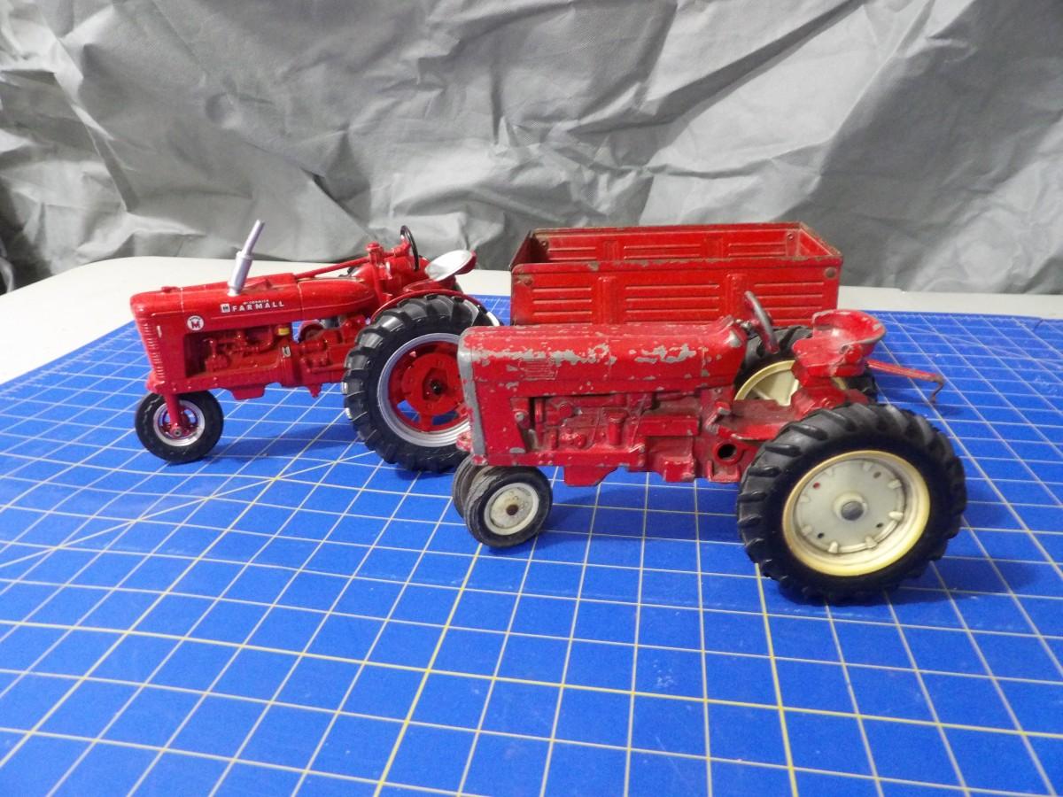 Ertl tractor and wagon. Note missing wheel on one tractor.