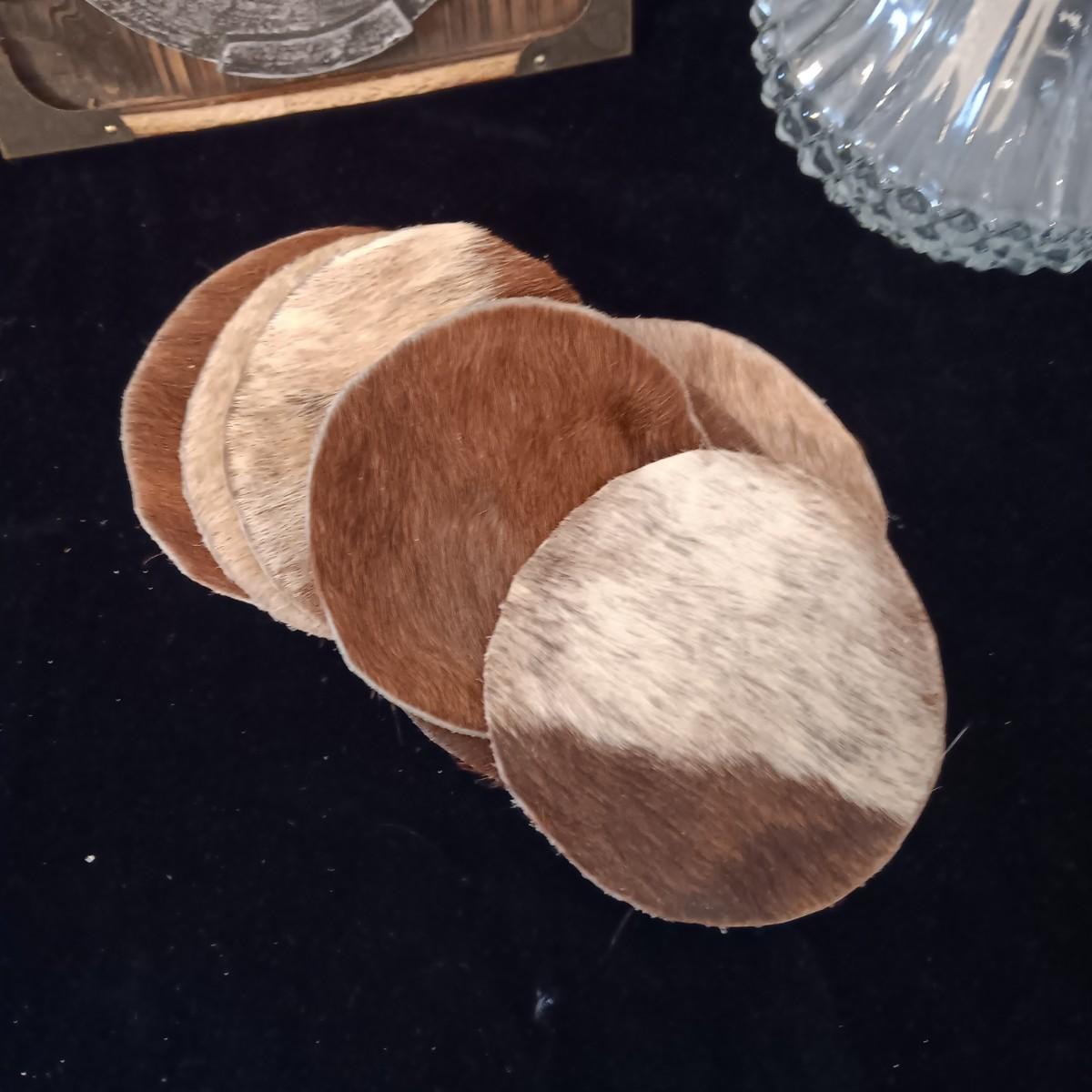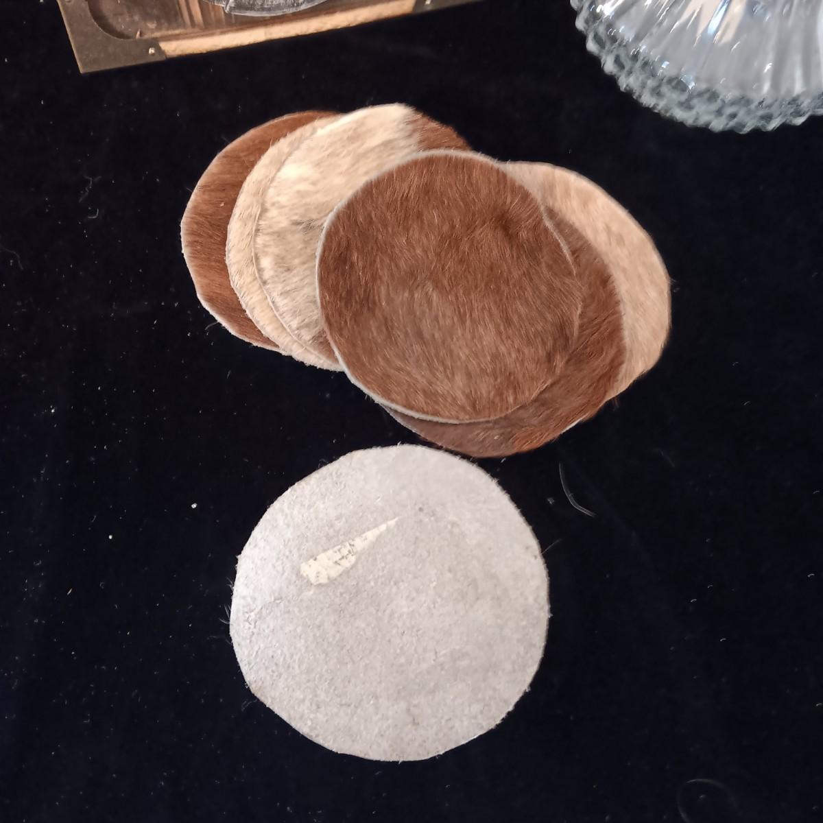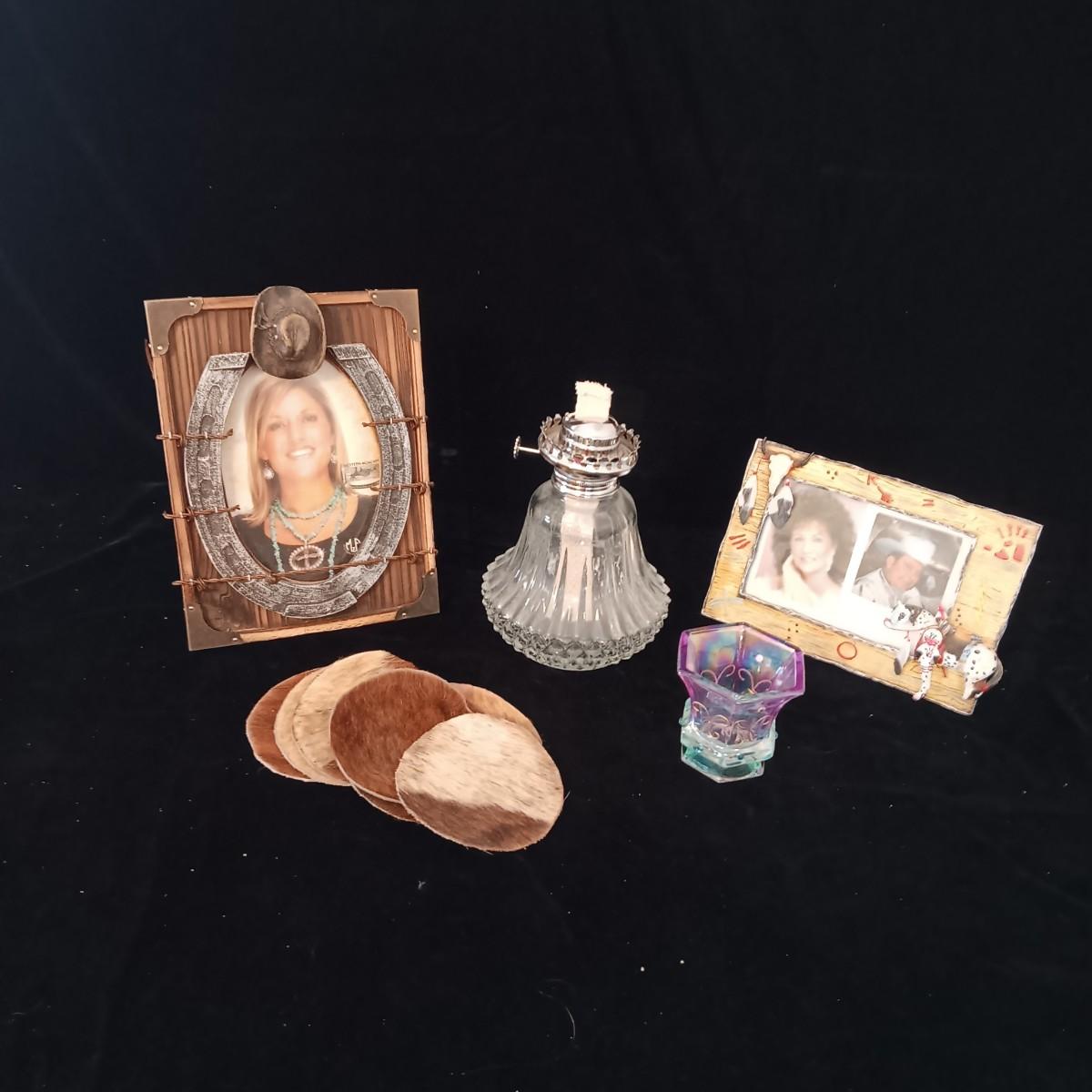 2 UNIQUE FRAMES, COWHIDE COASTERS & OIL LAMP