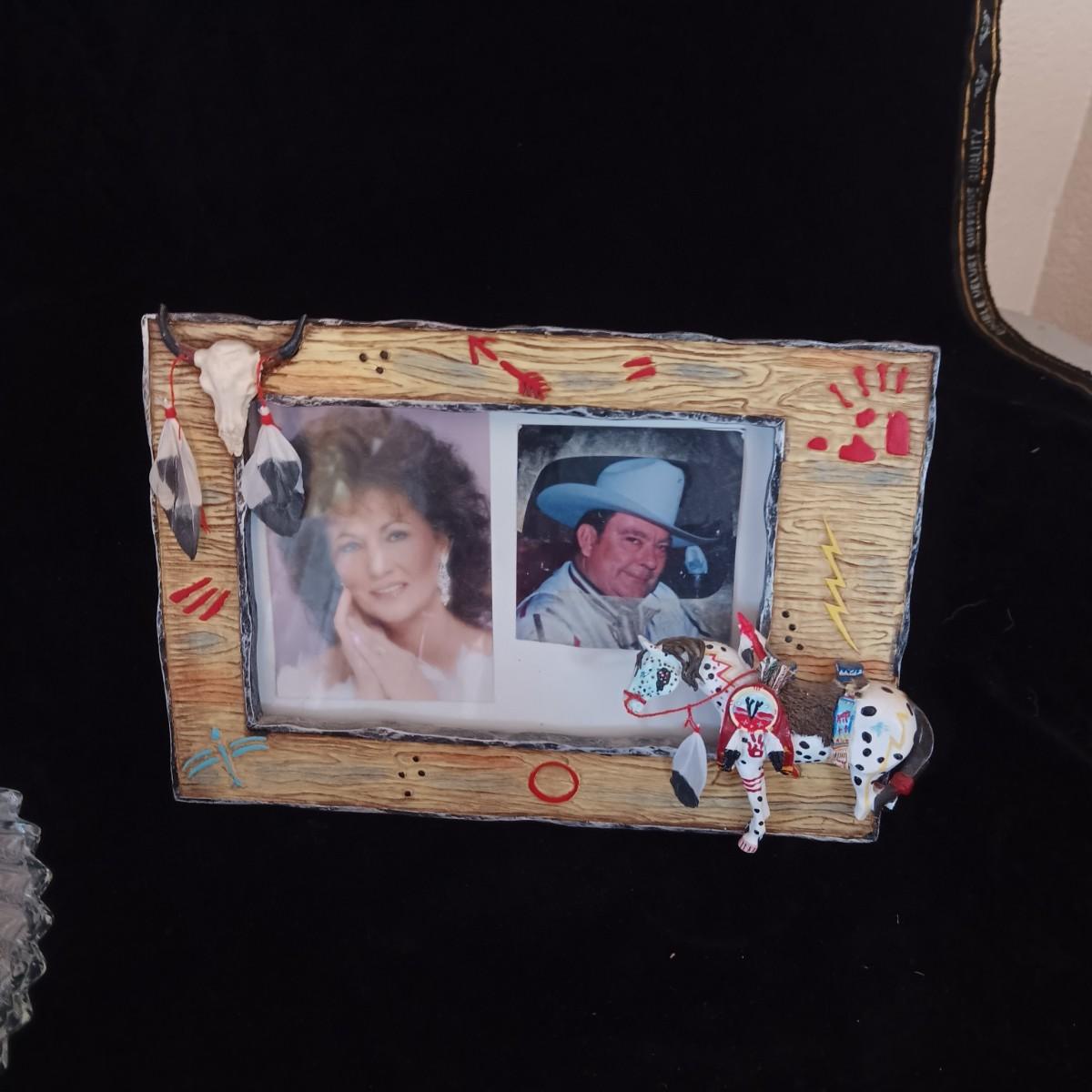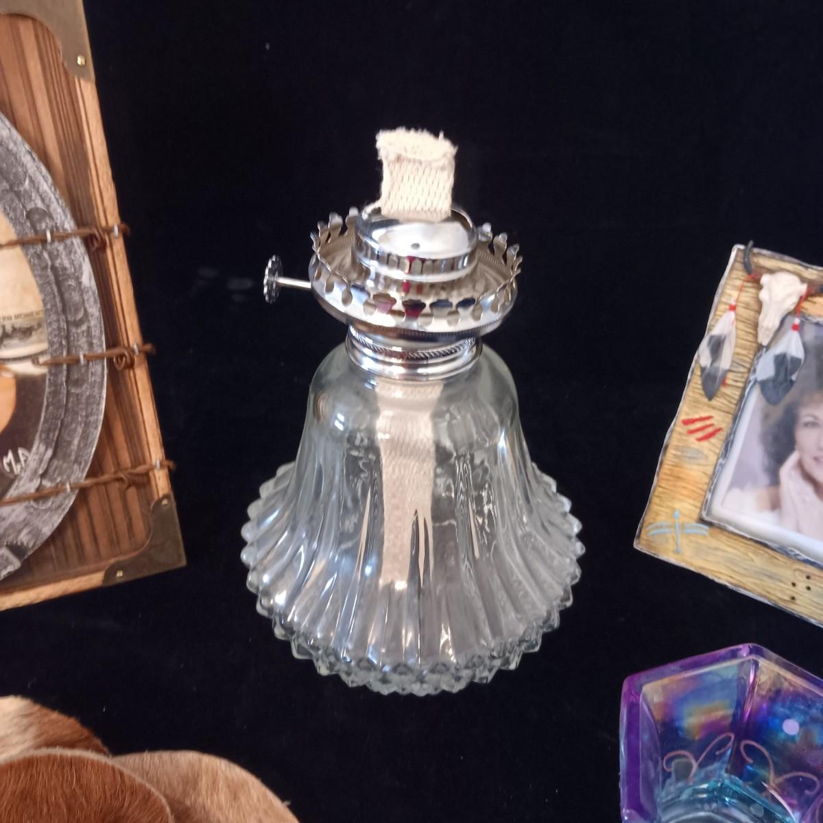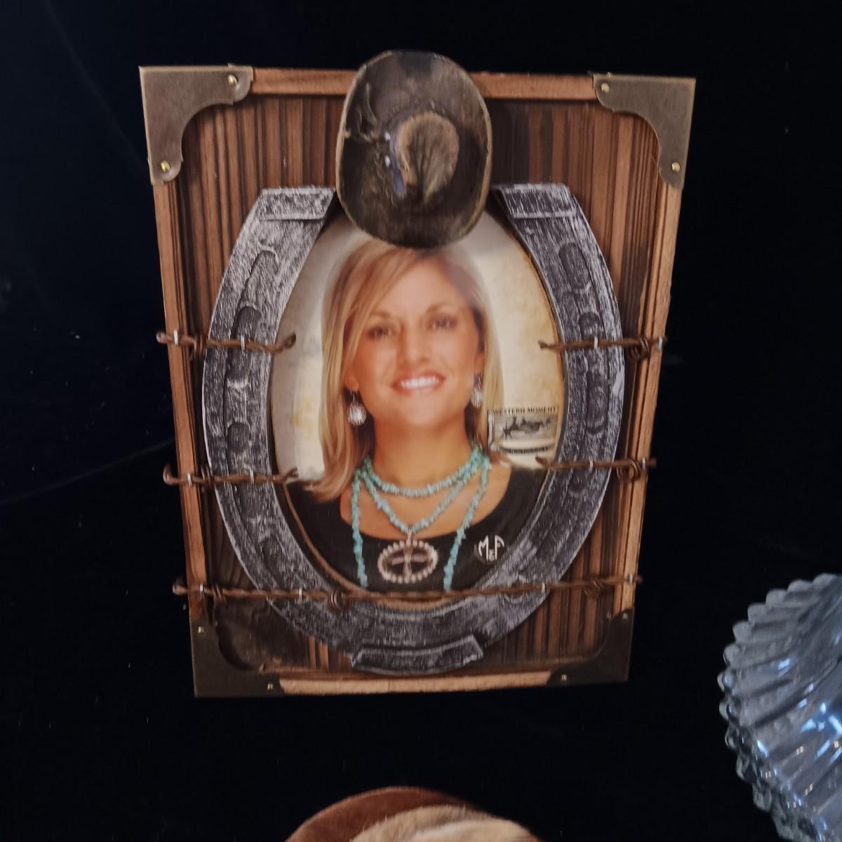 2 UNIQUE FRAMES, COWHIDE COASTERS & OIL LAMP