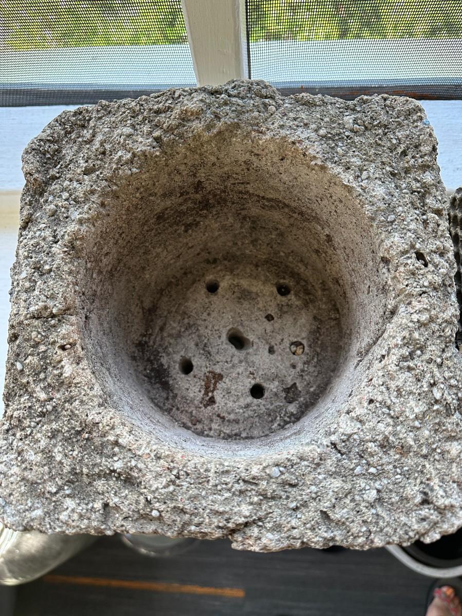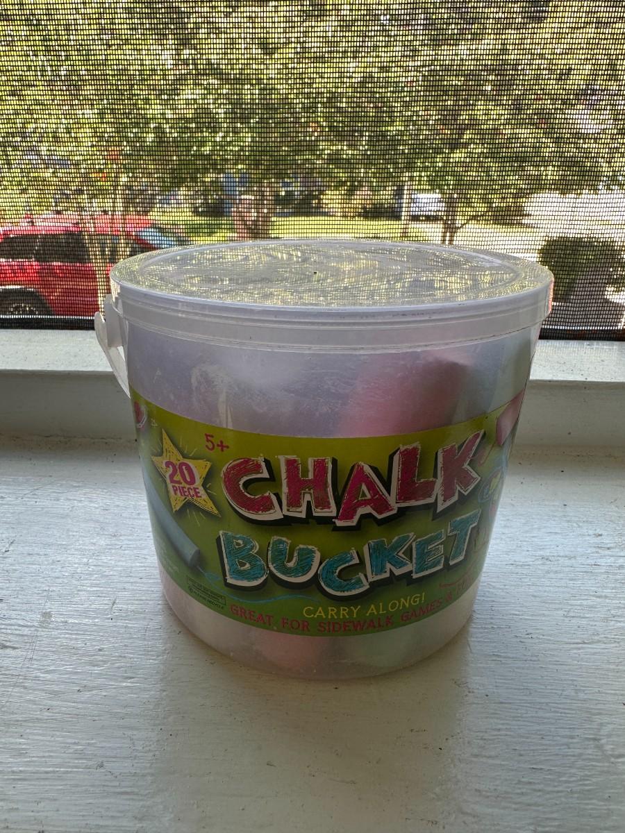 1 Square Planter 9" sq x 6"h with round 6" hole . 1 Rect. Planter 6.5"w x 7.7" L x 6.5"h. 1 Bucket of Sidewalk Chalk - some may have been used.