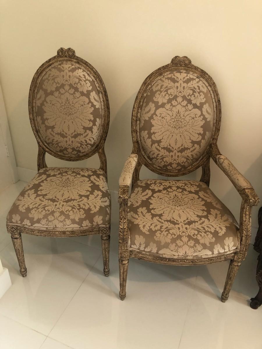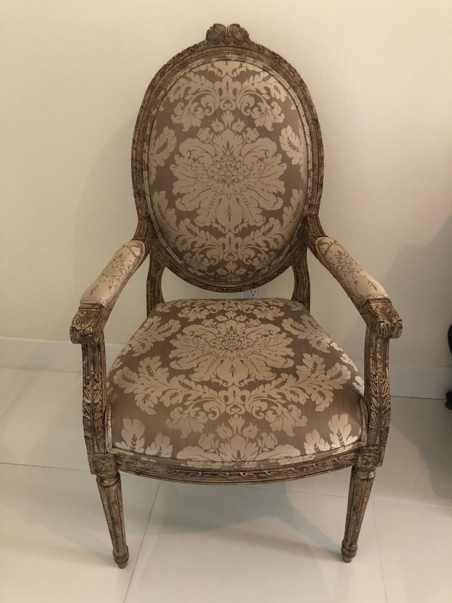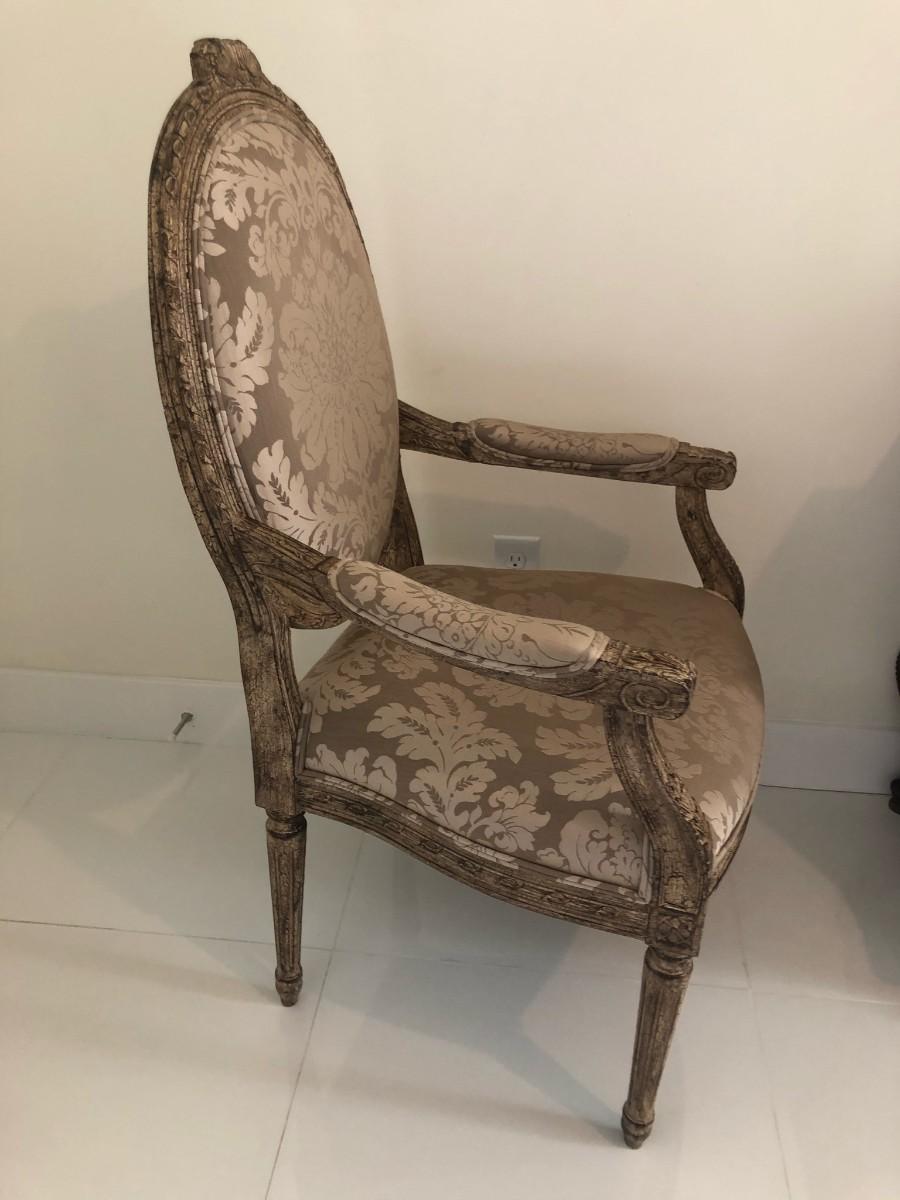 Pair of upholstered Occasional Chairs - one arm chair and one side chair. Upholstered in fine beige and tan fabric. They were purchased at a designer expo but the maker is unknown. They are in excellent condition.