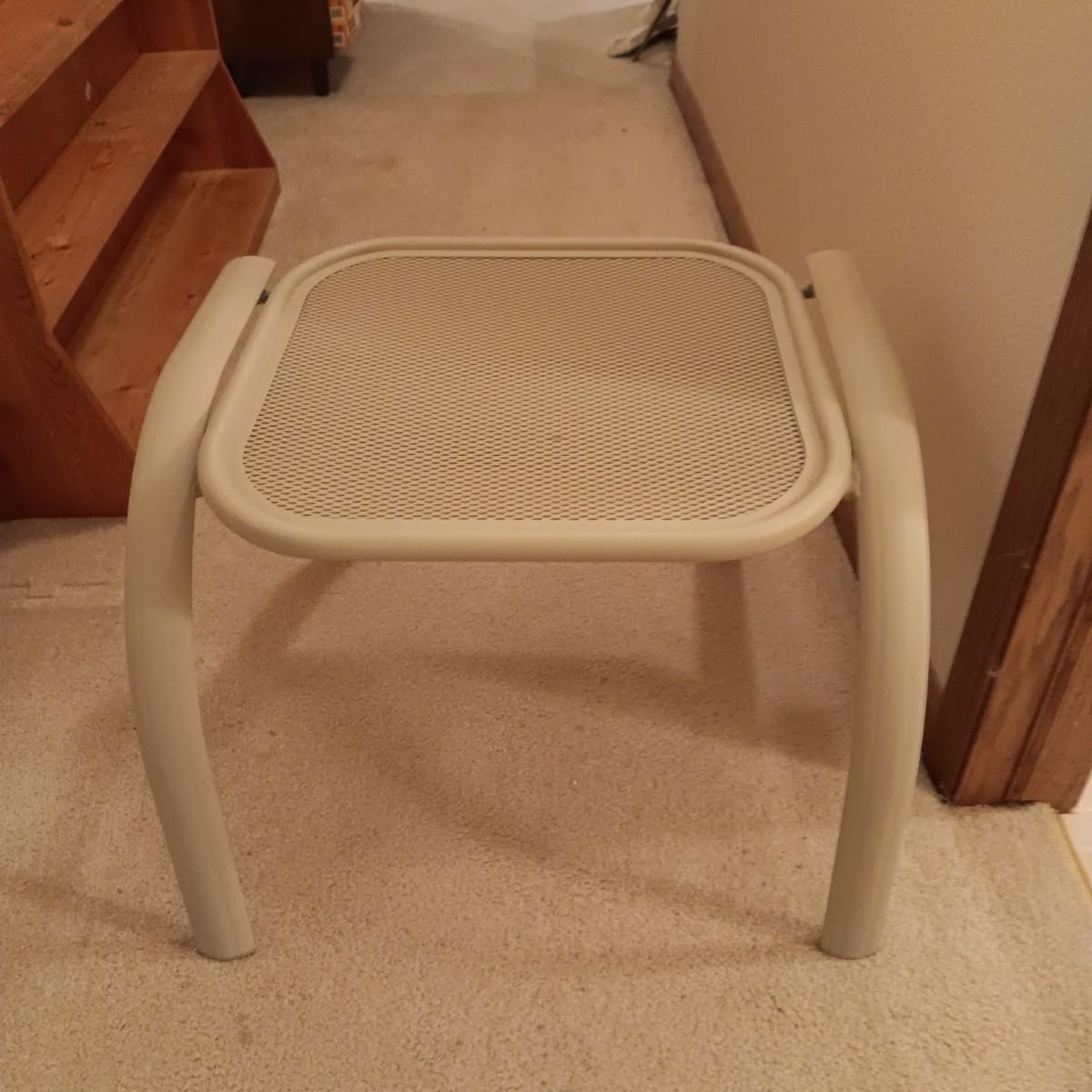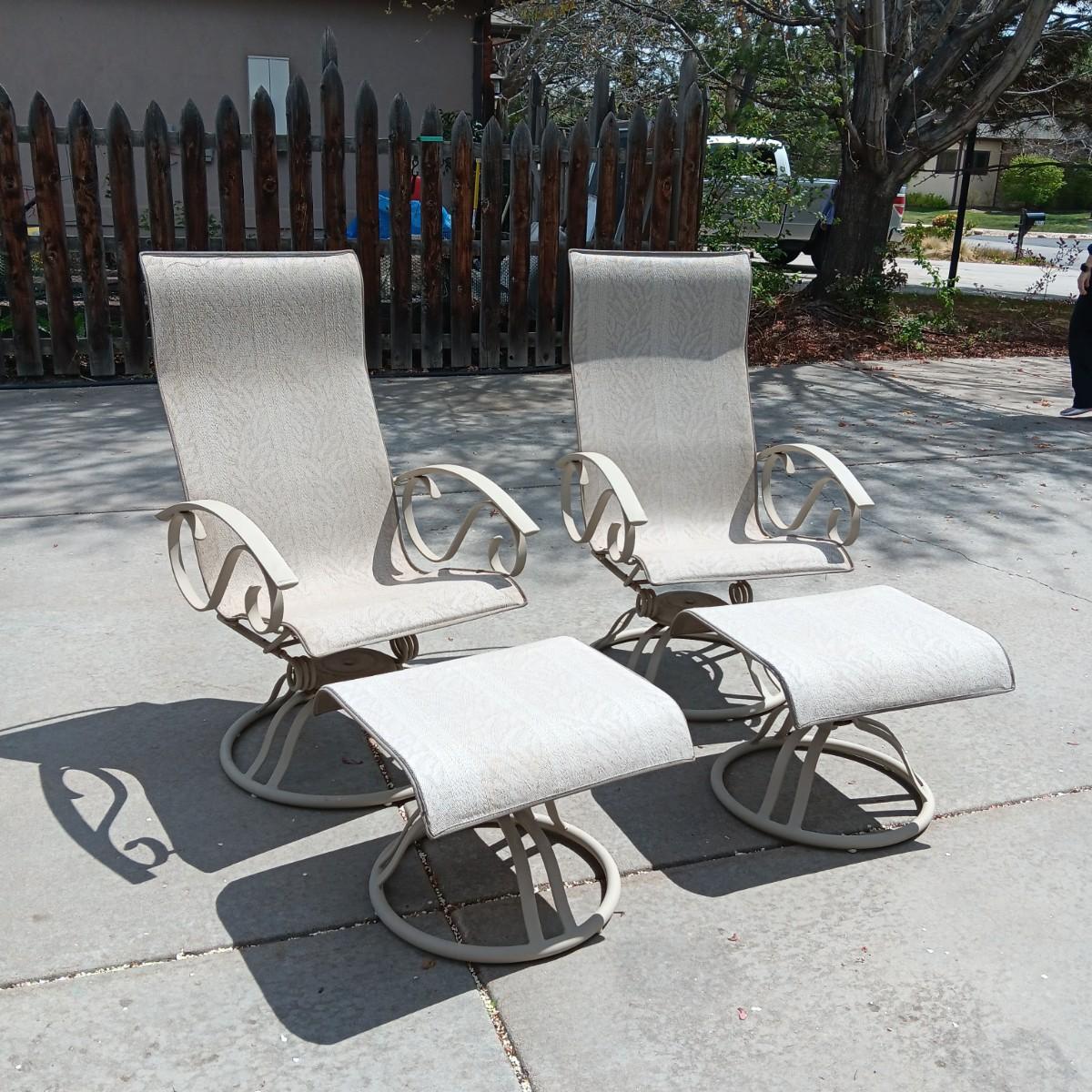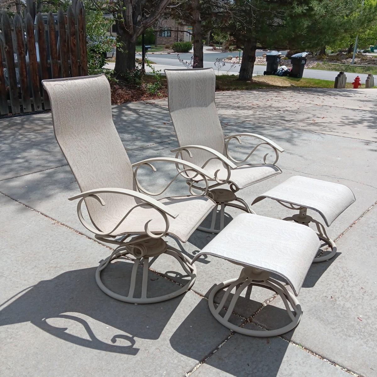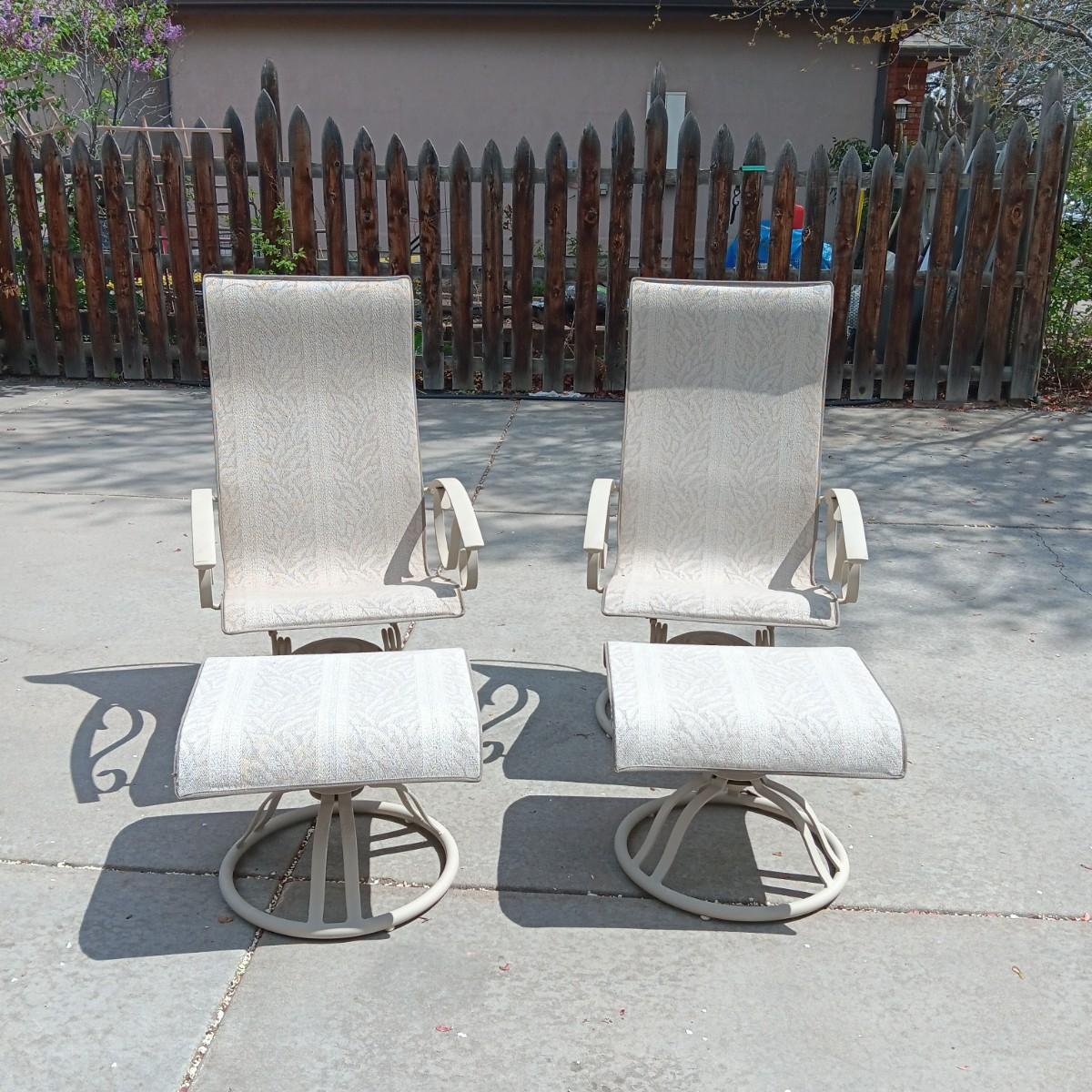 2 VERY NICE ROCKING PATIO CHAIRS WITH OTTOMANS AND A SIDE TABLE