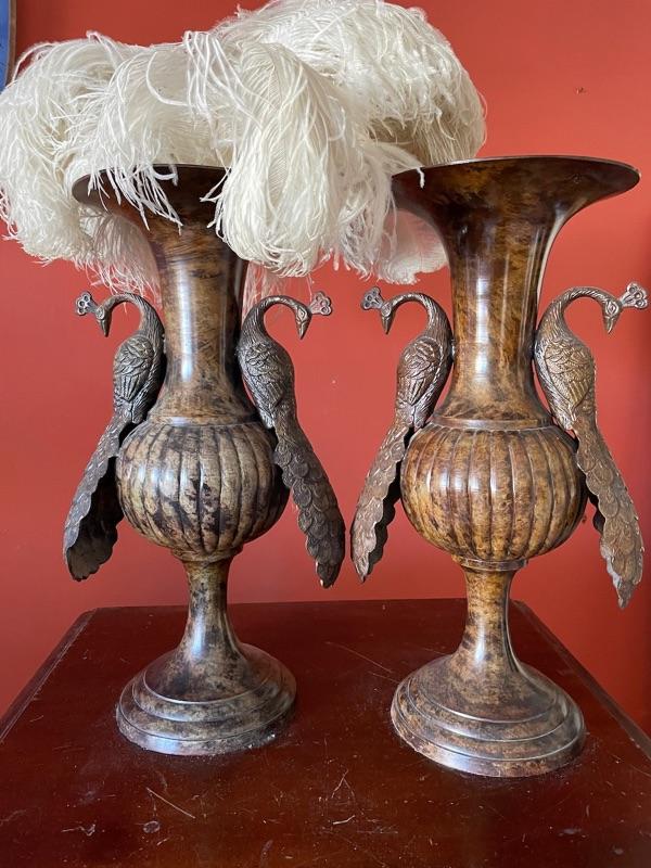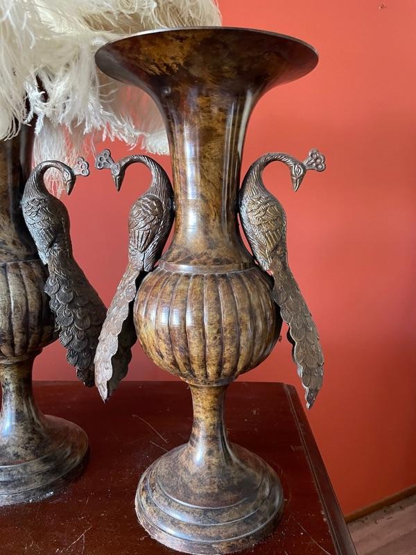 2 heavy Victorian vases with peacocks. Metal. Ostrich feathers included. 20” tall, base 8” diameter