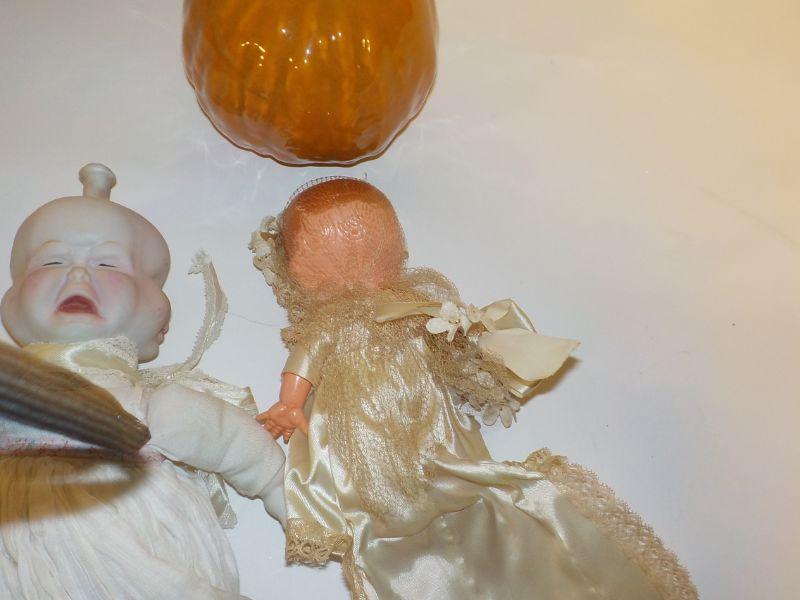 Both in excellent shape and clean.Three-headed doll. Bisque head has three faces. Cloth body with bisque hands. Celluloid Kewpie Doll Bride in wedding dress. Ceramic pumpkin designed to sit over votive candle.