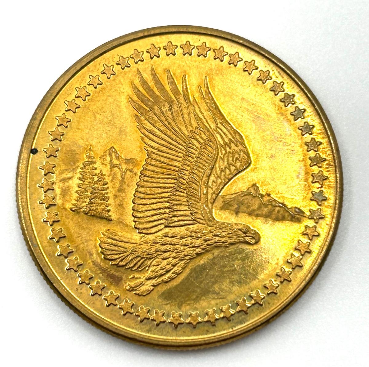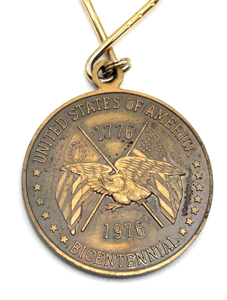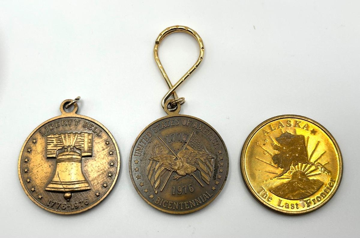 Lot includes one 1976 US Bicentennial keychain, onr 1976 Farmland Industries Spirit of Agriculture pendant and Alaska: The Last Frontier token coin. Are are made of thick, heavy metal and are about the size of a silver dollar
